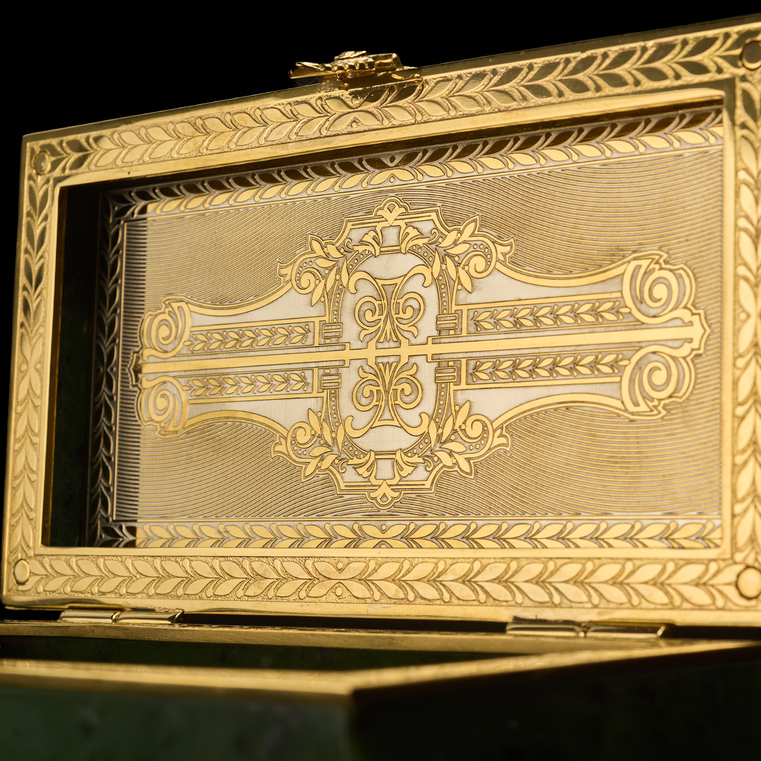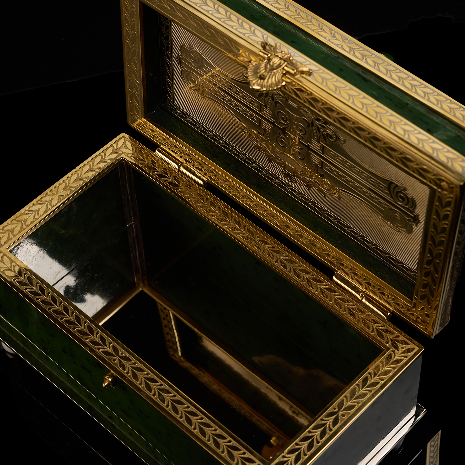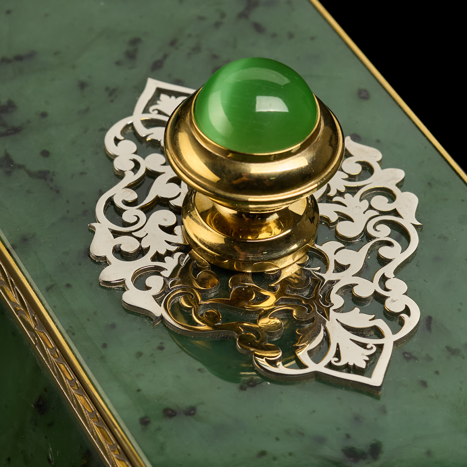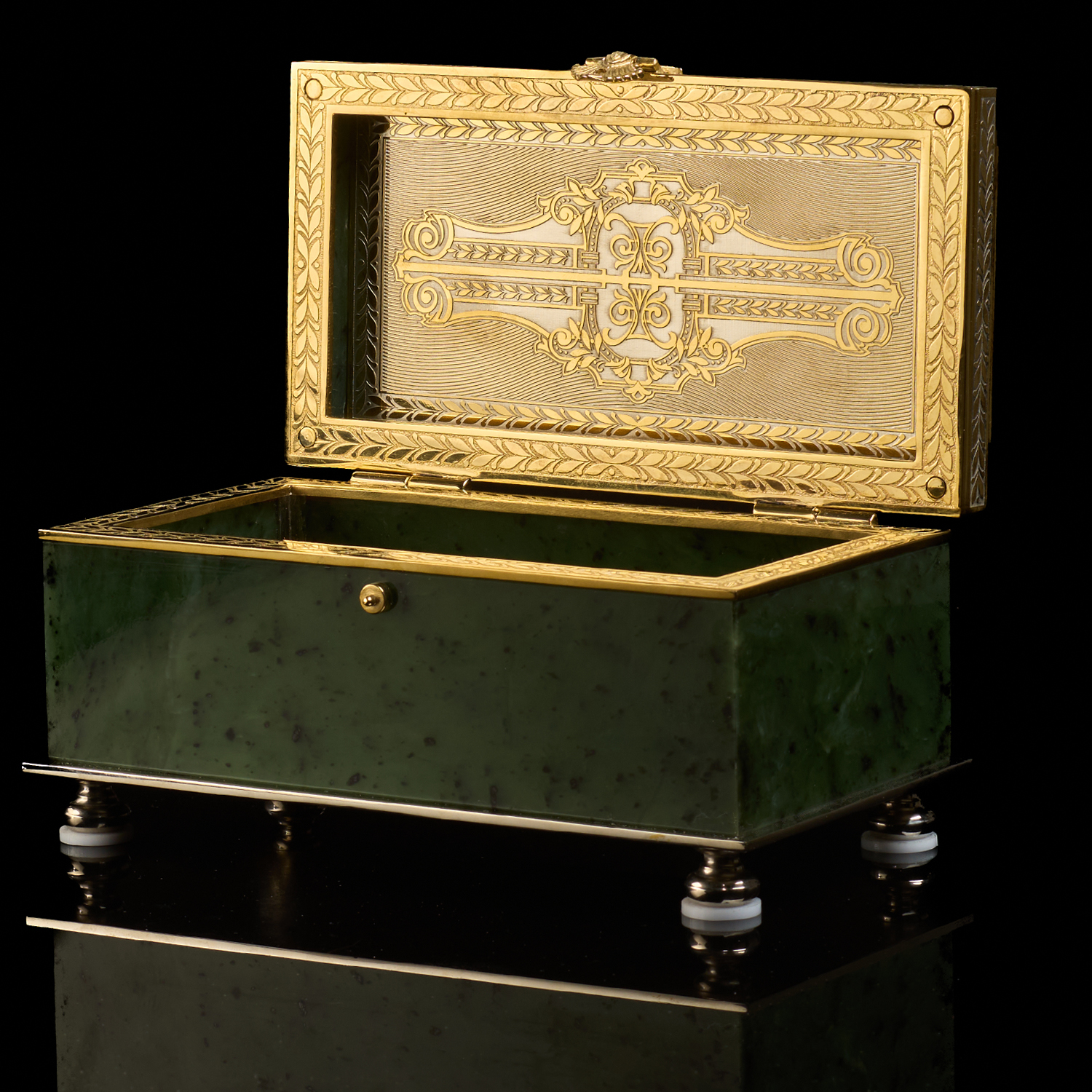 Шкатулка-ларец из нефрита "Сказка". Златоуст.Материалы: латунь, никель, золото 999,9*, нефрит.