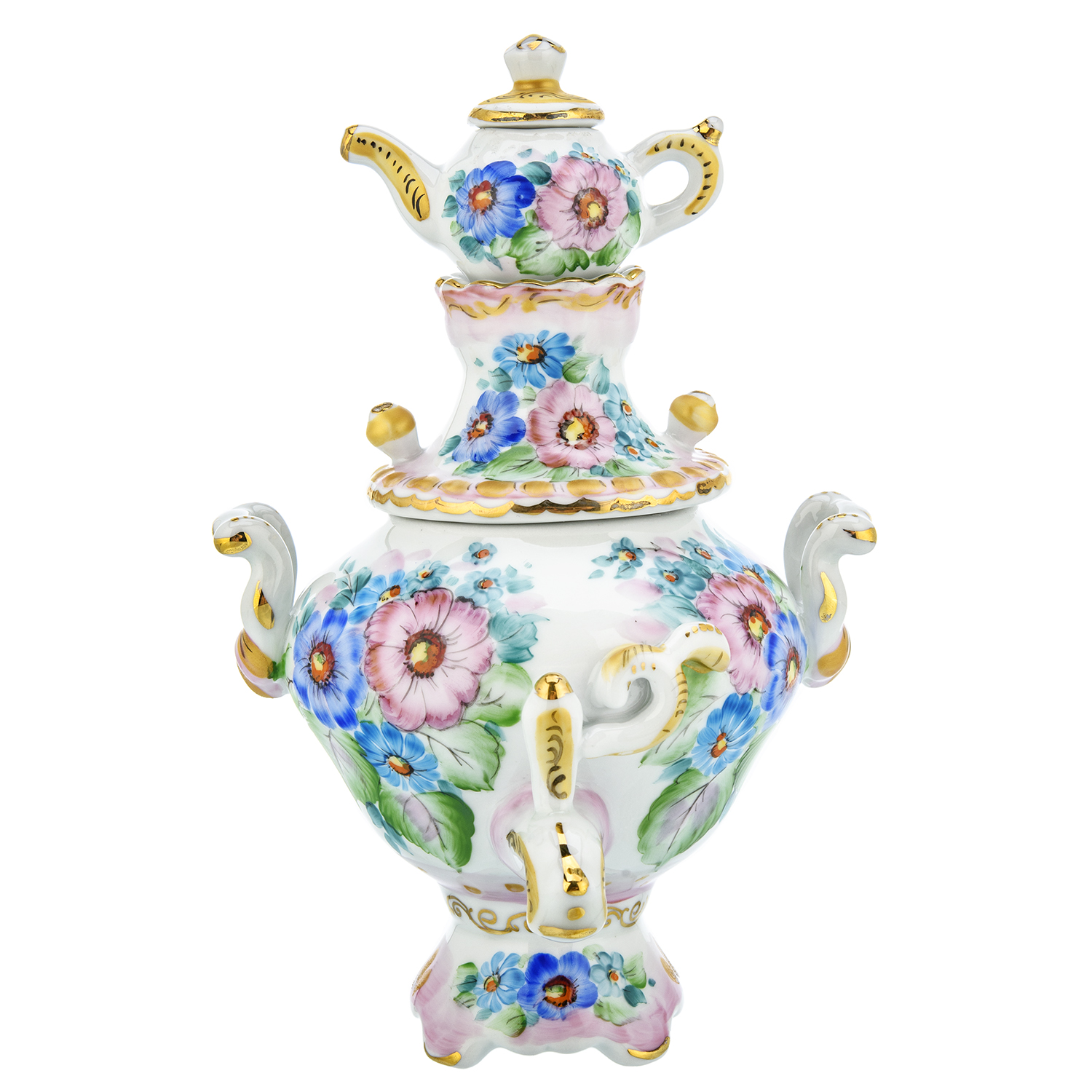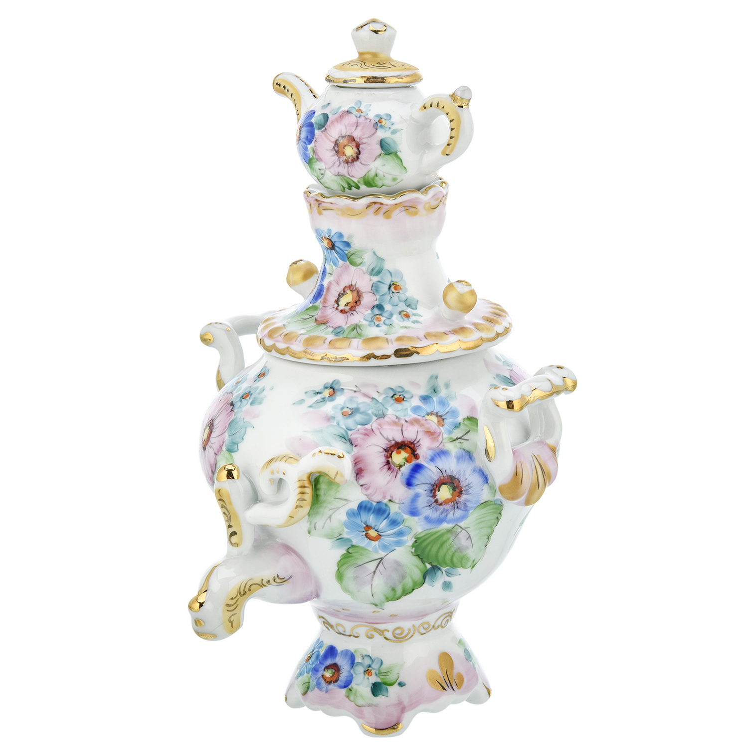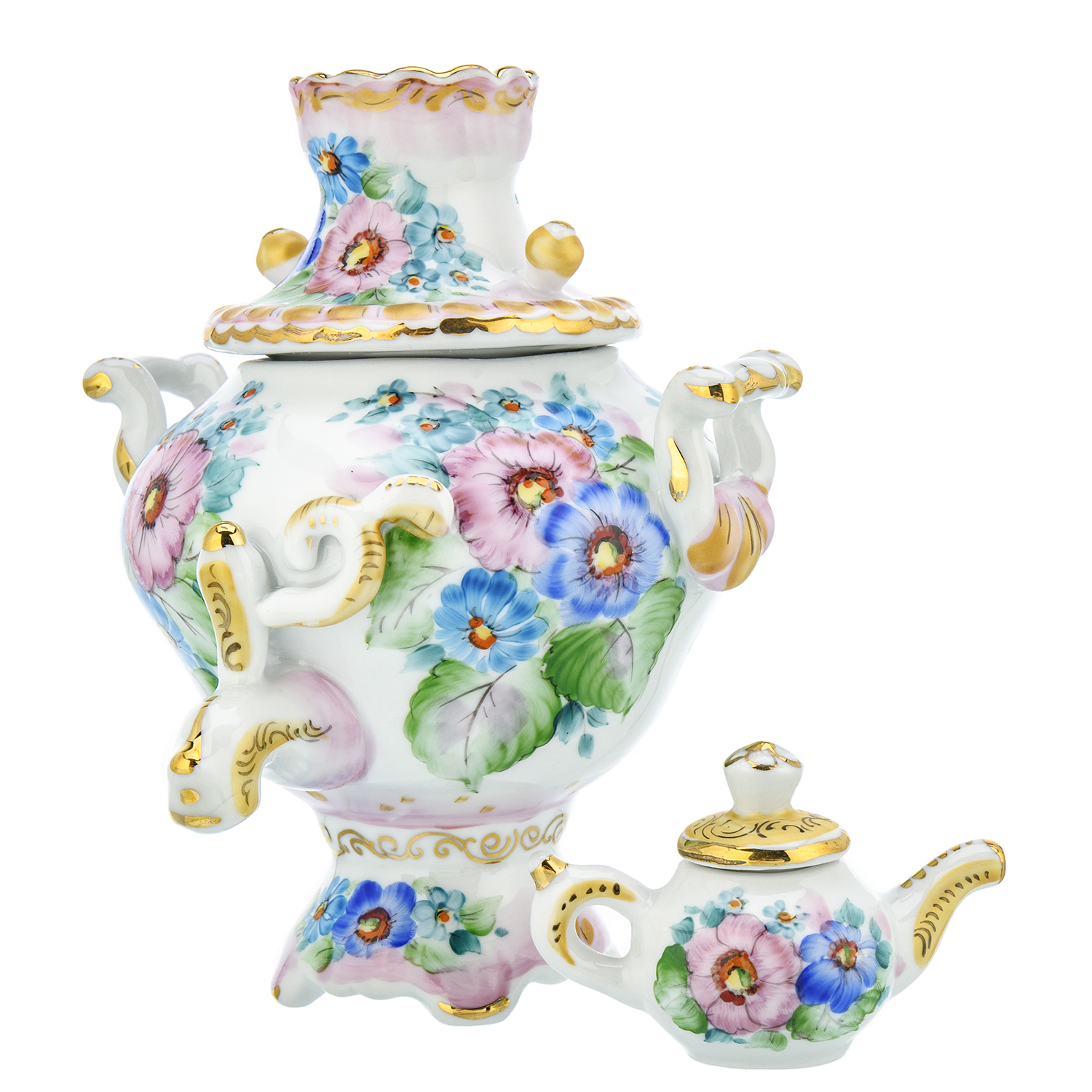 Сувенирный самовар-шкатулка "Цветы". Гжель в цвете и золоте