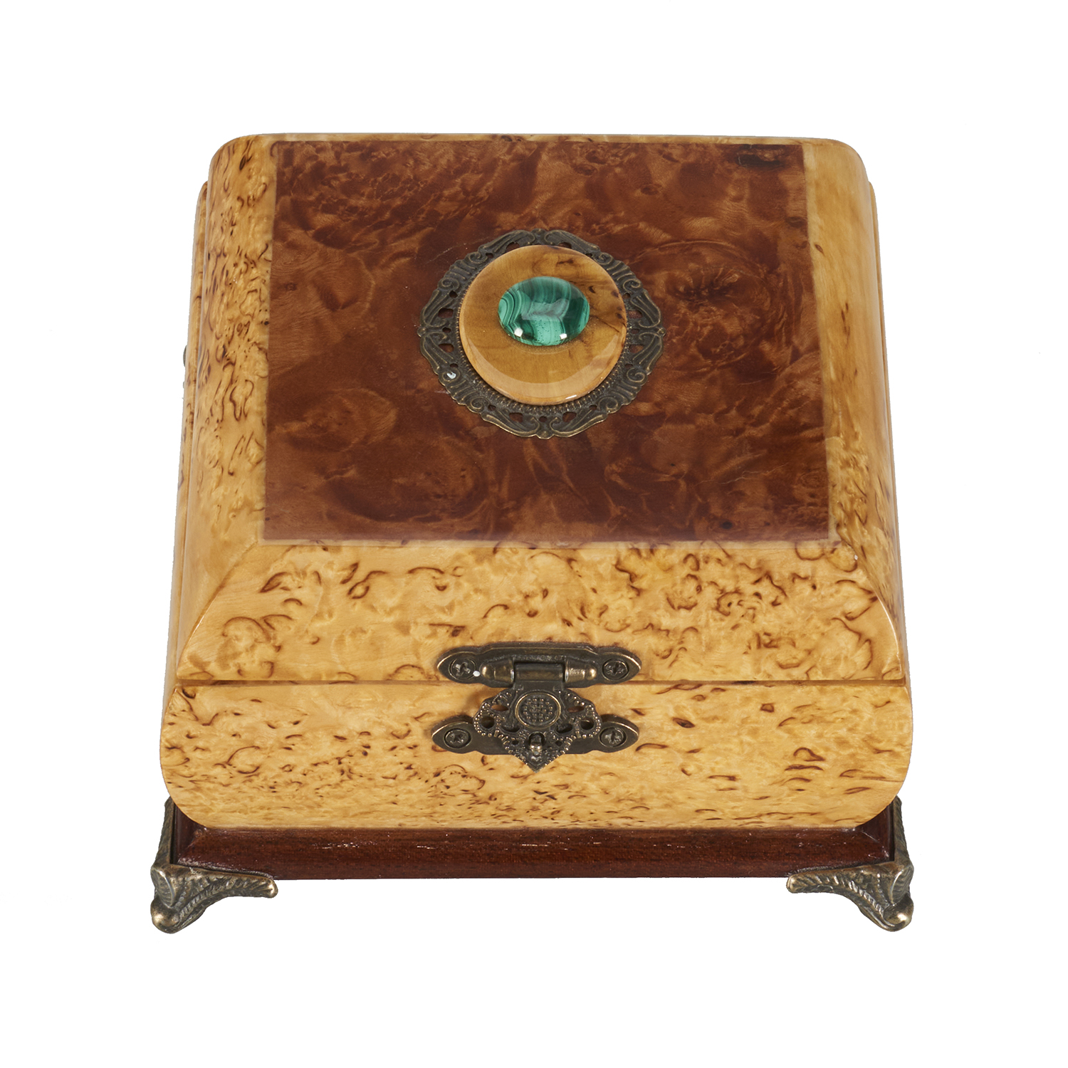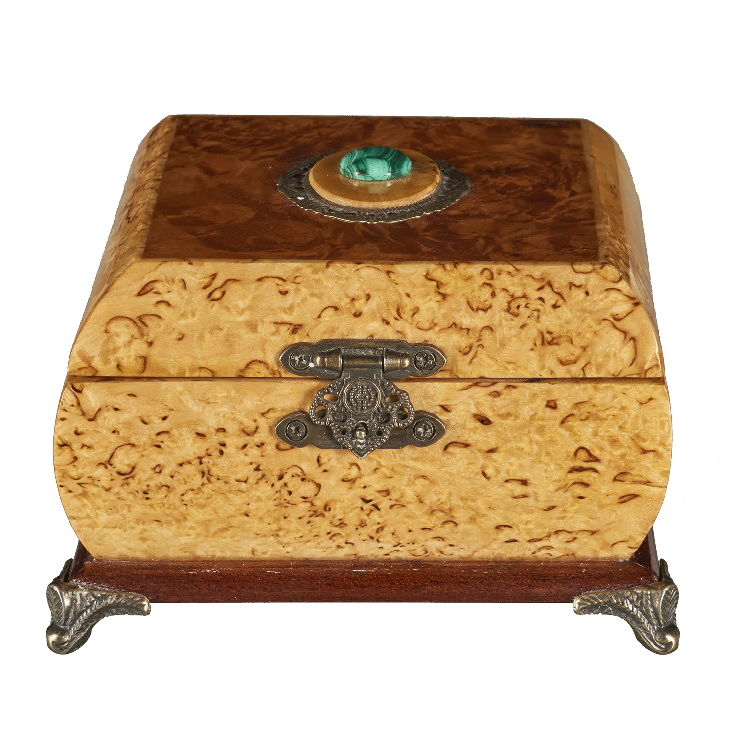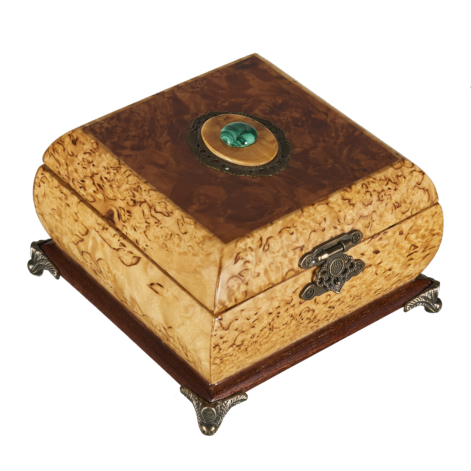 Шкатулка из карельской березы с малахитом.Материалы: карельская береза, корень красного дерева, малахит, латунь.