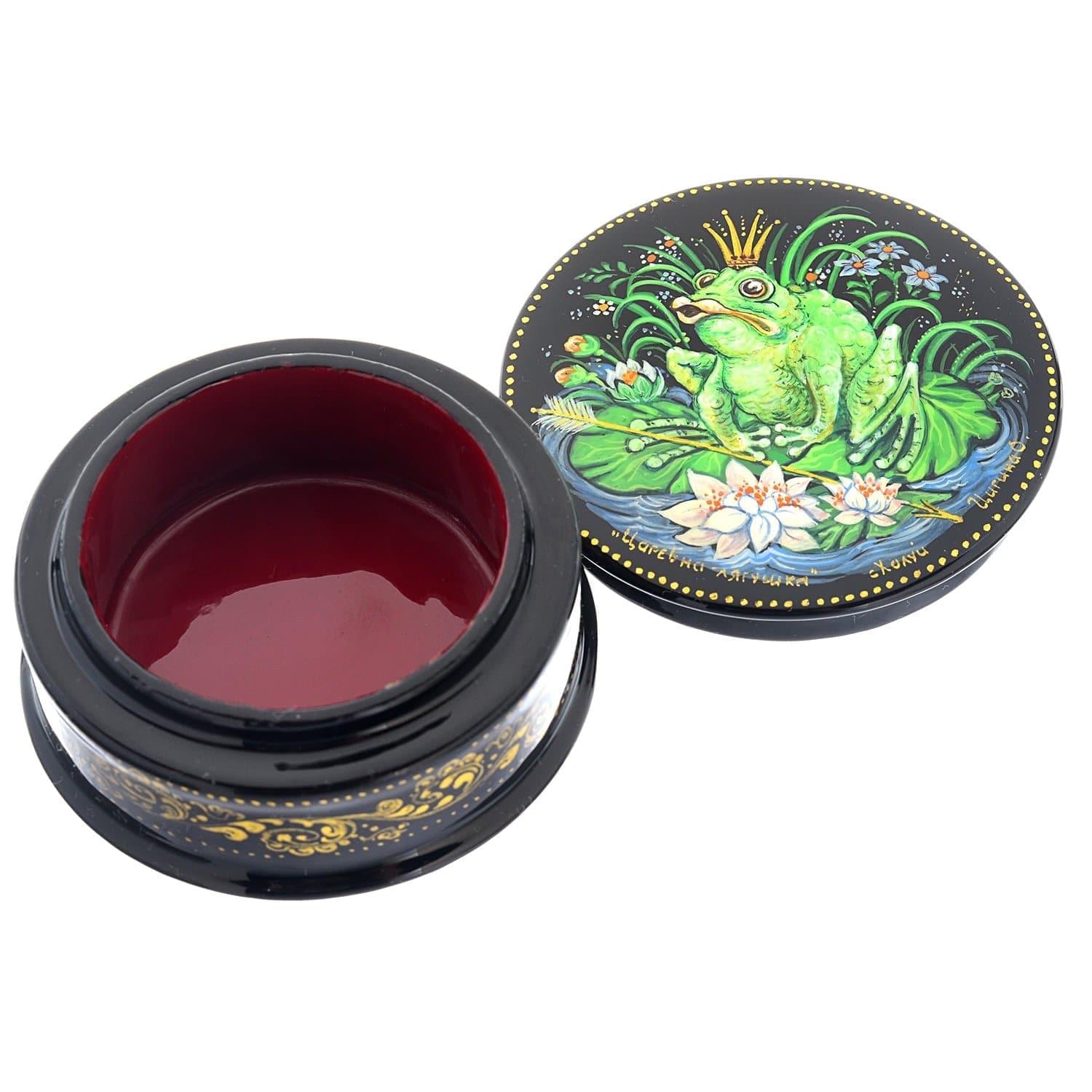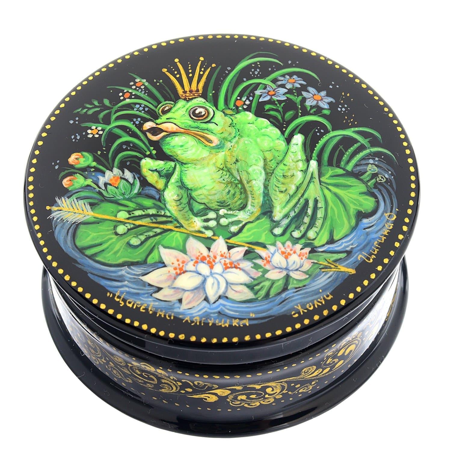 Царевна-лягушка - культовый персонаж русской волшебной сказки. В короне, сидя в куста, лягушка поет и насвистывает, предчувствуя хэппиэнд. Ее лирический образ представлен в рамках колоритной композиции на крышке шкатулки ручной работы с черным фоном... ....Извините, товар отсутствует
