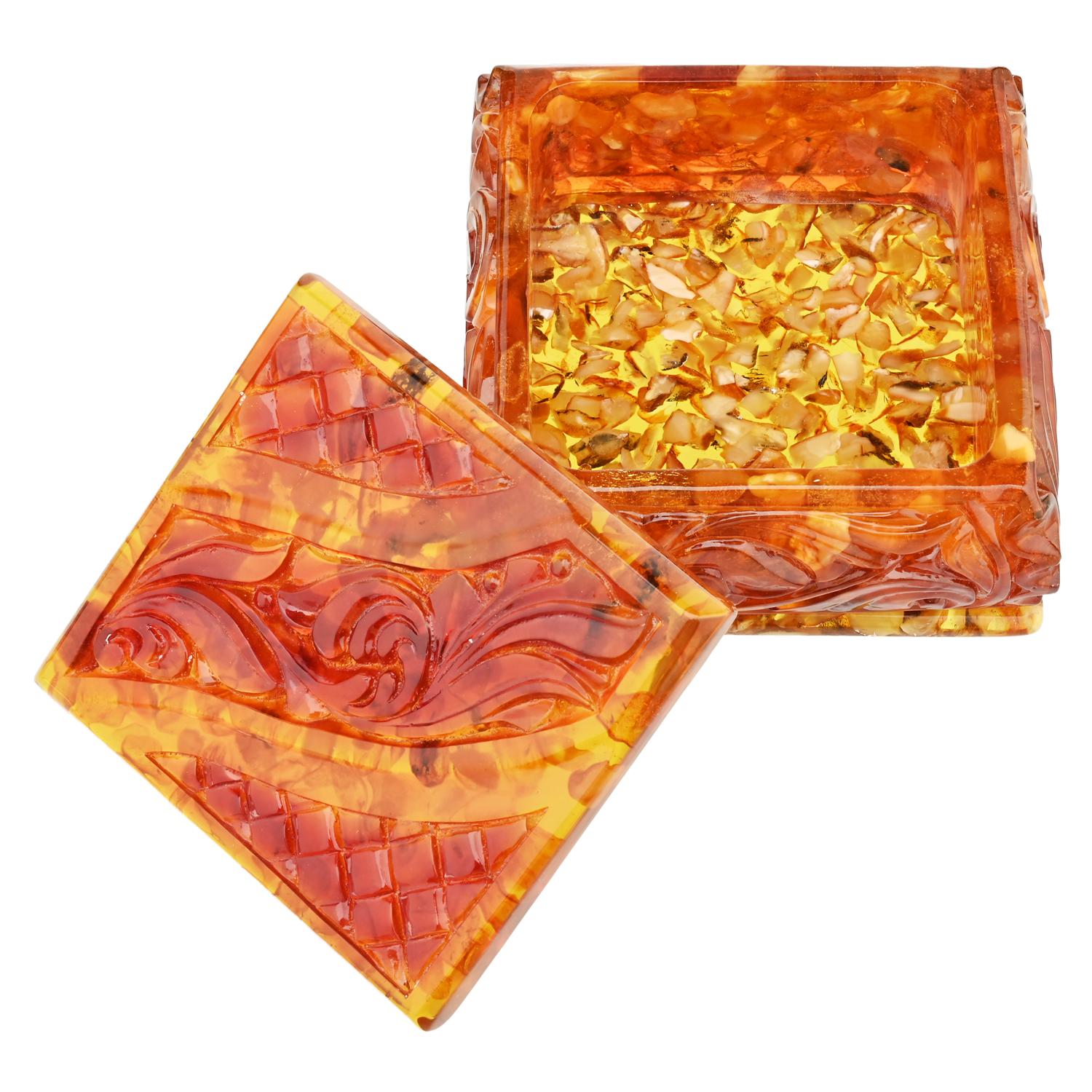 Шкатулка квадратная из янтаря "Ажурная".Материалы: янтарь, полиэфирная смола.