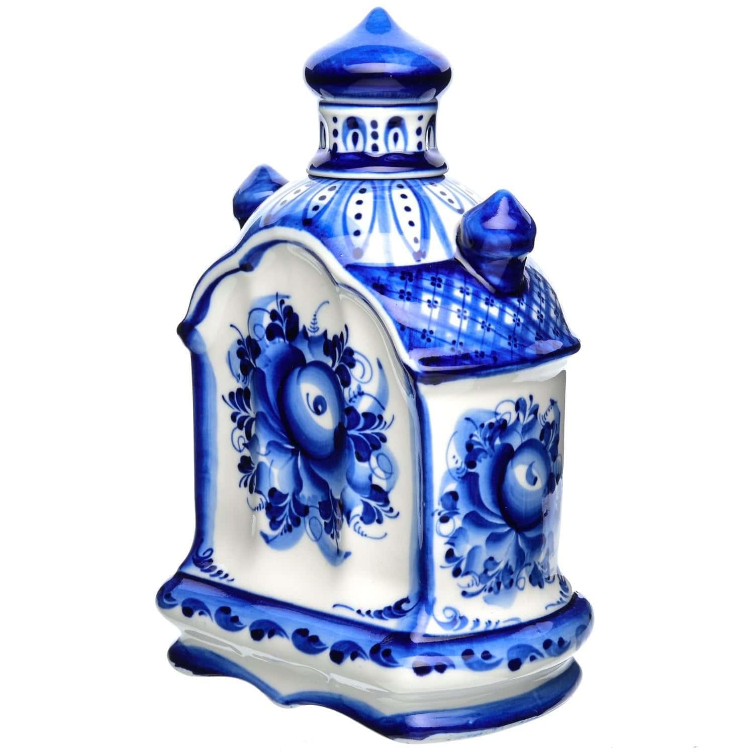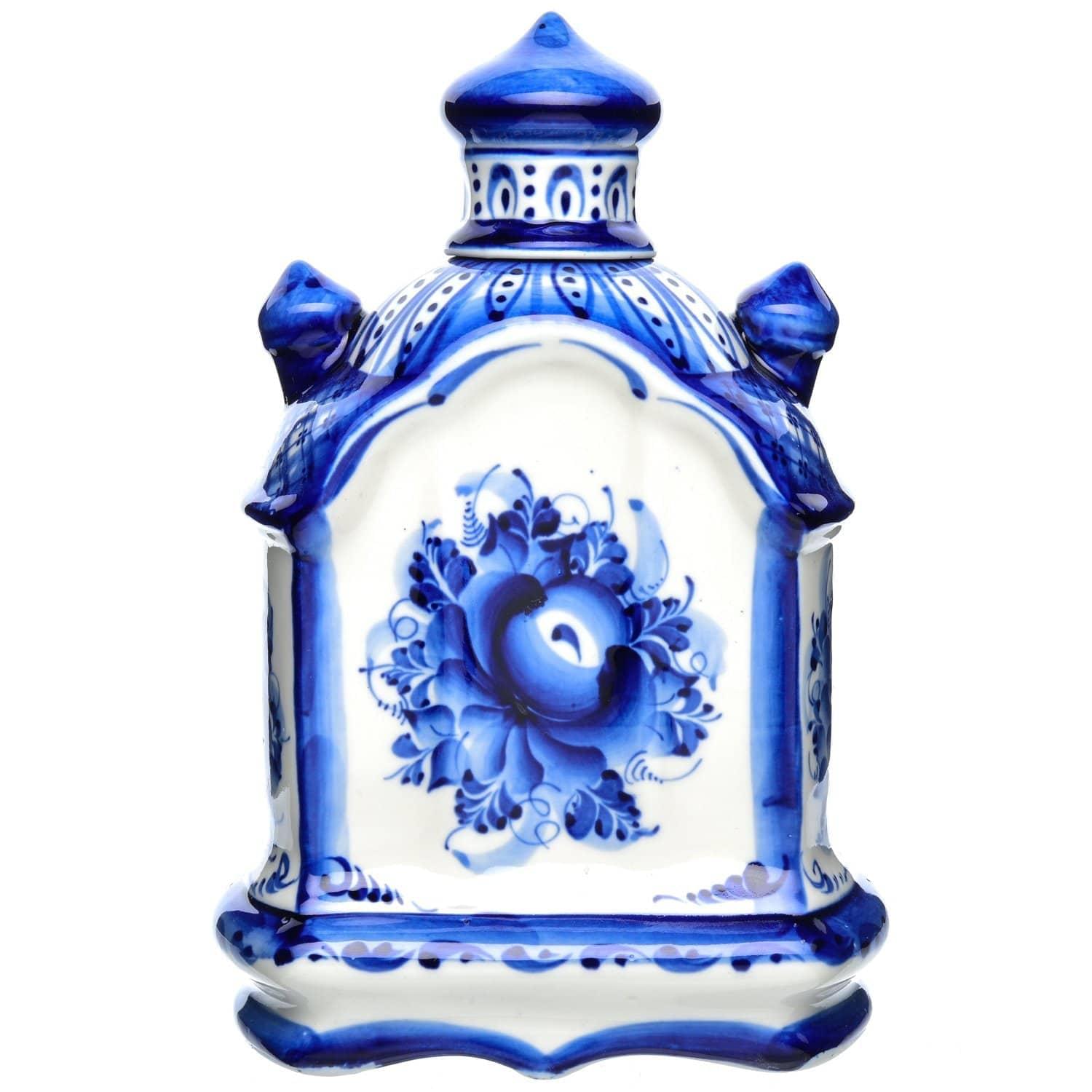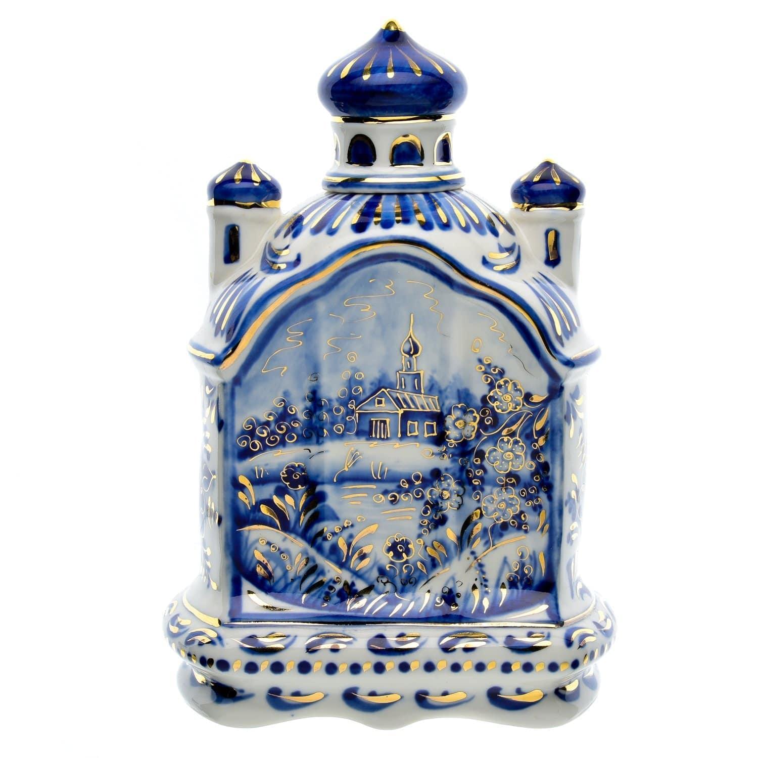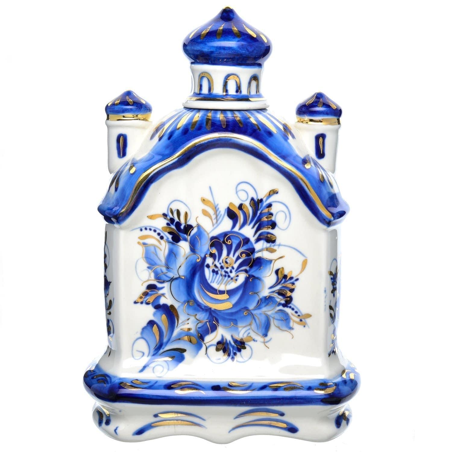 Дизайнерский штоф в форме образца русского зодчества - просто чудо и настоящий сюрприз! Это еще один авторский образец народного промысла, который уже несколько веков процветает на территории двух бывших губерний, Броннницкой и Богородской, богатых высококачественной глиной белого сорта.Фигурный корпус штофа с куполами изготовлен по авторскому эскизу гжельским гончаром из твердого фарфора, называемого "русским белым золотом", Изделие является оригинальными интерьерным аксессуаром. Оформление фарфоровой поверхности выполнено вручную в технике свободной кистевой росписи посредством окиси кобальта - главной краски гжельских художников, которая после обжигов в печи при сверхвысоких температурах приобретает синий цвет с более чем 40 его оттенками.