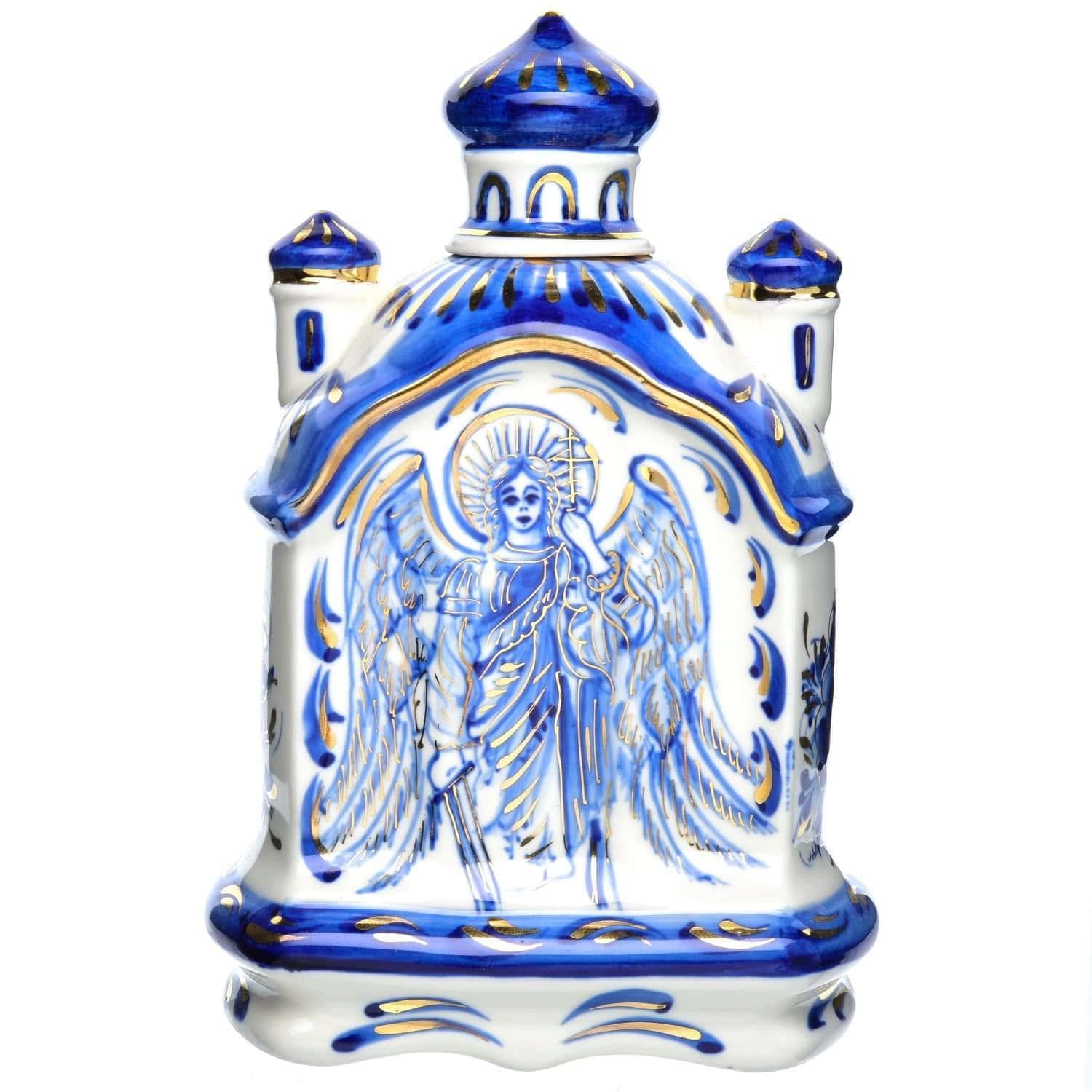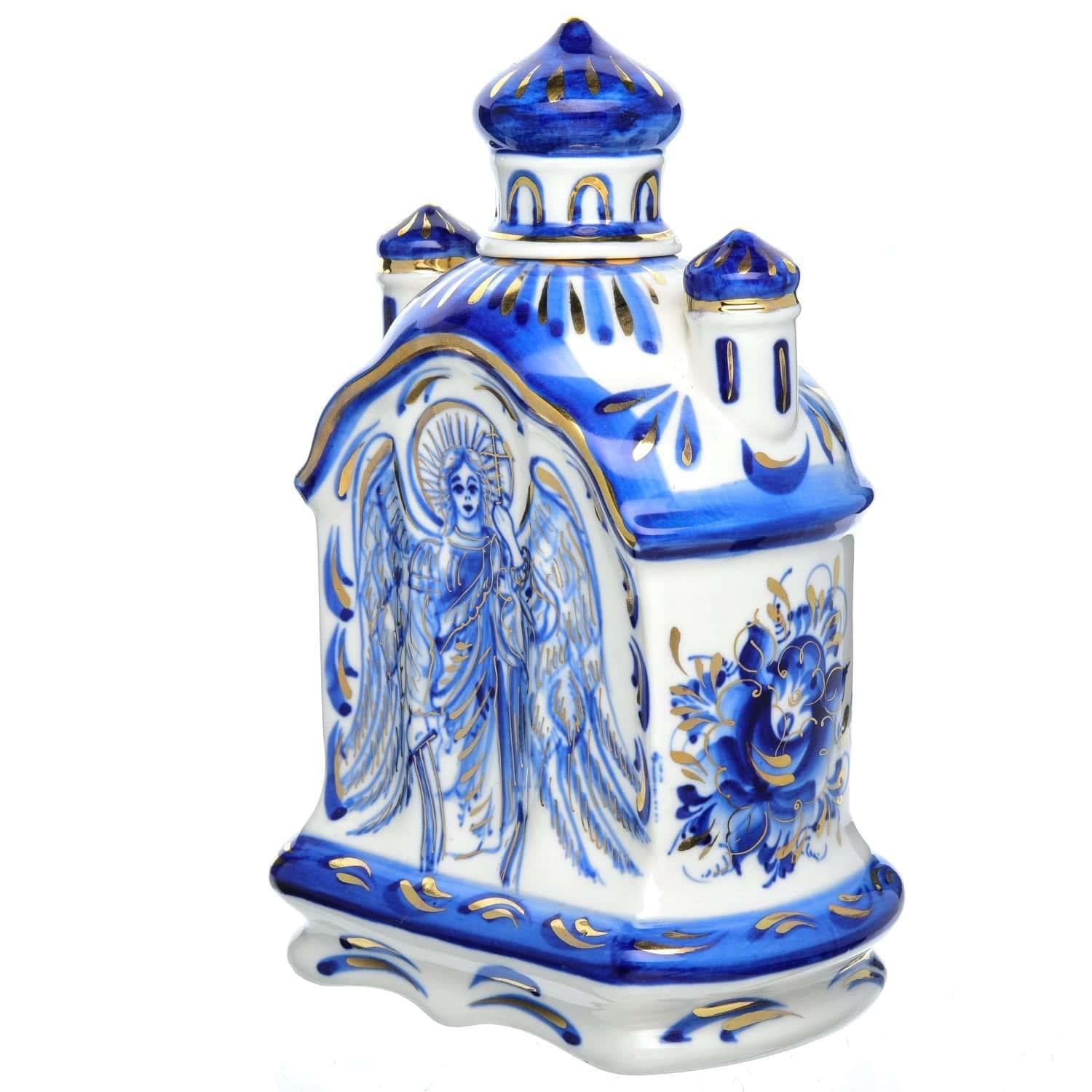 Поверхность защищена несколькими слоями прозрачной стеклянной глазури. Эффектная и стойкая позолота нанесена в технике надглазурной росписи. Авторская работа, штоф "Монастырский" Гжель - это оригинальный вариант подарка в русском стиле на Рождество, Новоселье, День рождения, Пасху, личный или общий, церковный праздник.