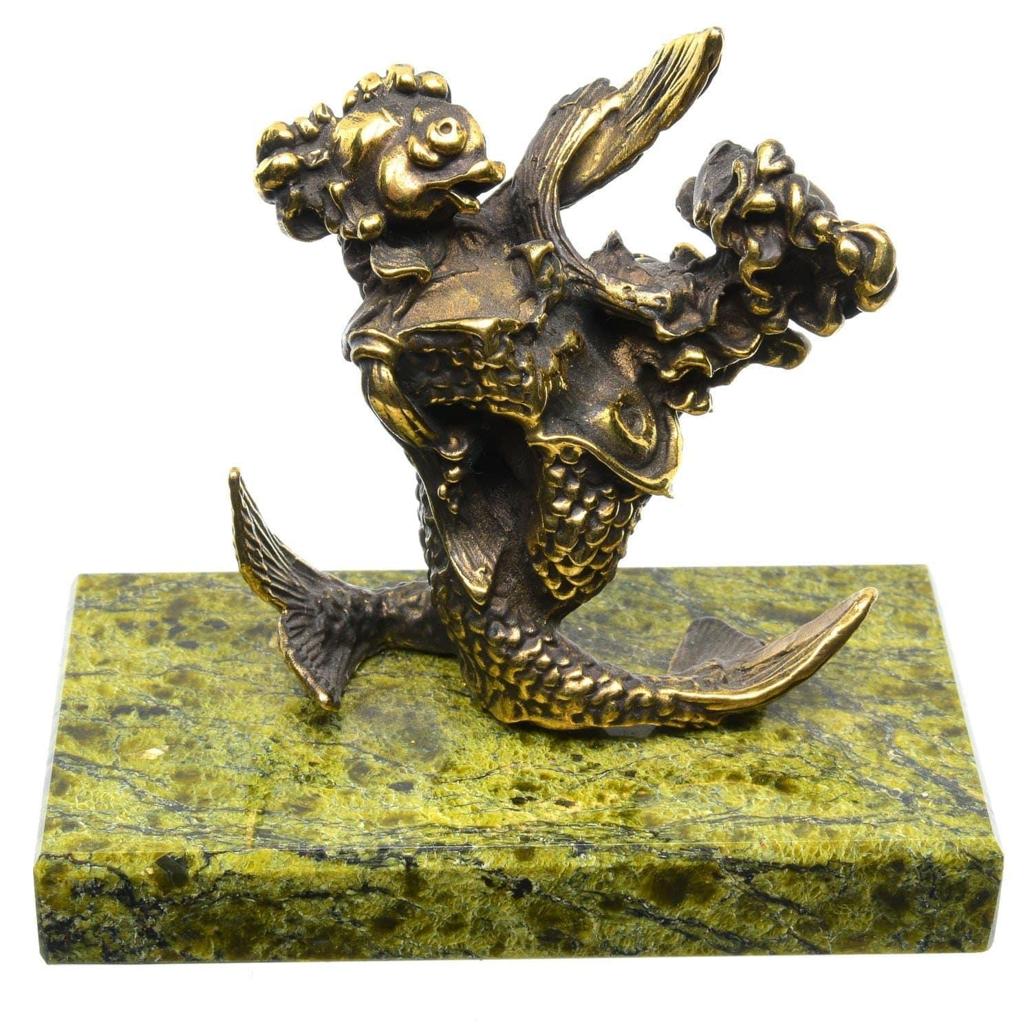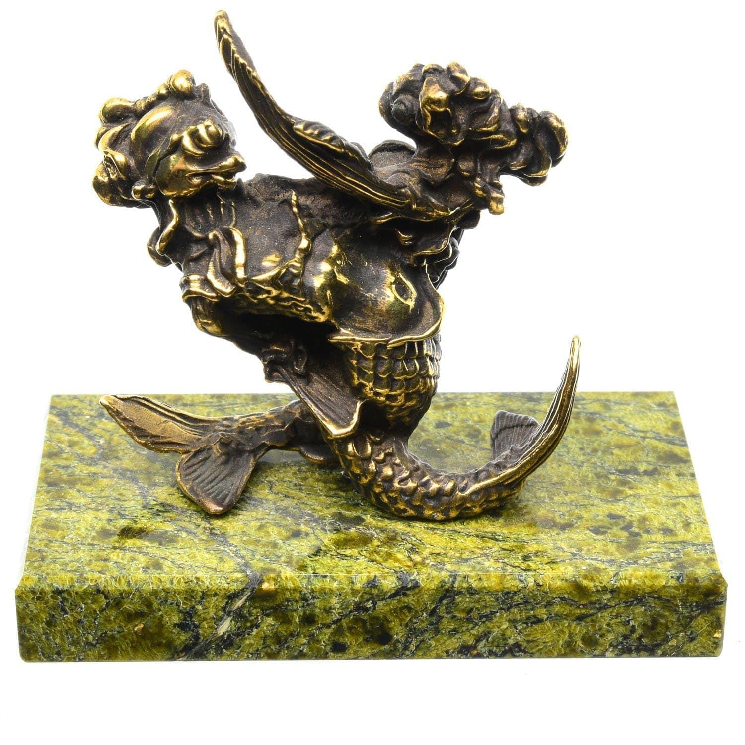 Оригинальная авторская композиция из бронзы - скульптурный образ знака зодиака Рыбы. Вариант адресного подарка на ДР. Скульптура на постаменте из натурального камня создает в интерьере забавный акцент, поднимает настроение домочадцам и является персональным талисманом. Скульптура отлита в соответствии с авторским эскизом и оформлена позолотой и патиной...
