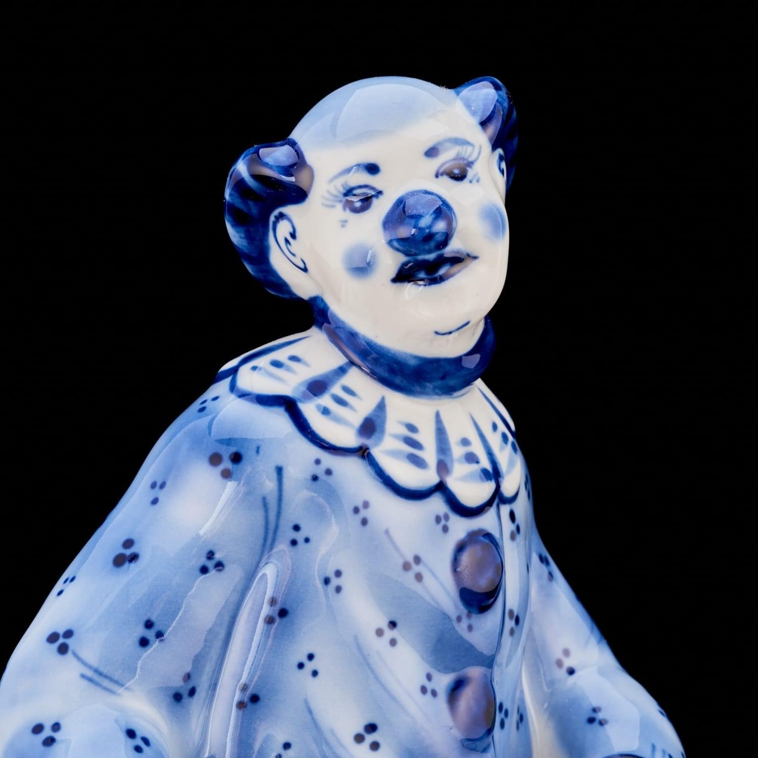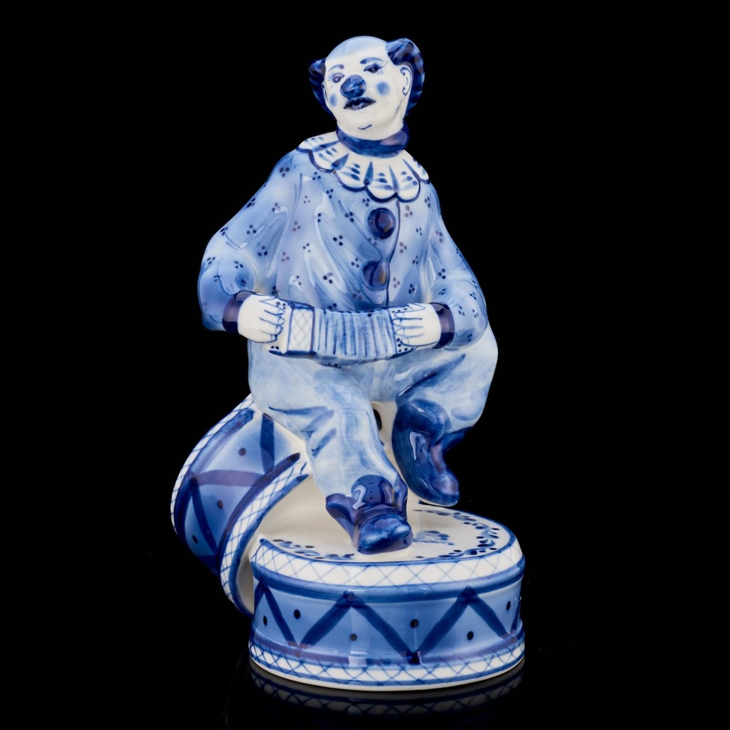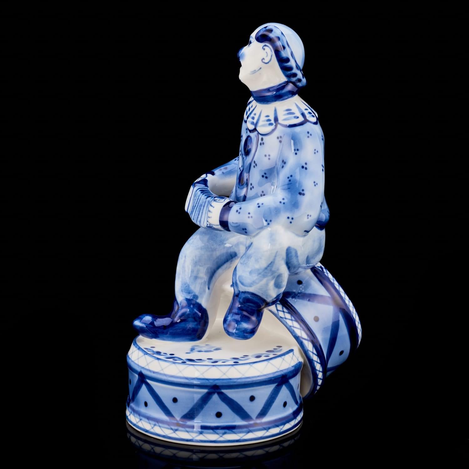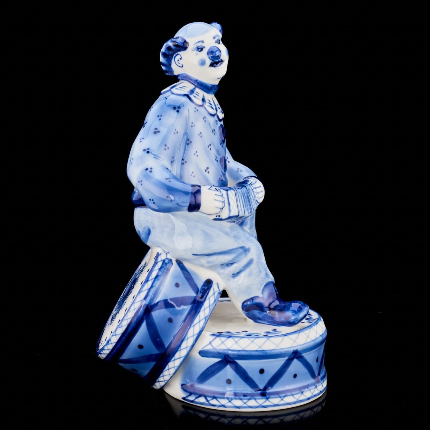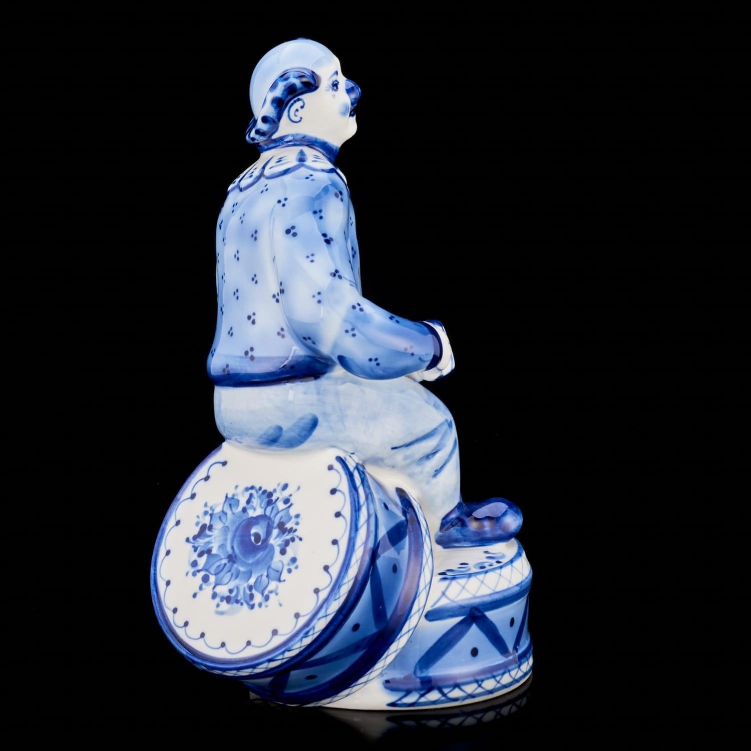 00118927 Гжель Скульптура "КЛОУН НА БАРАБАНАХ" (СТС)