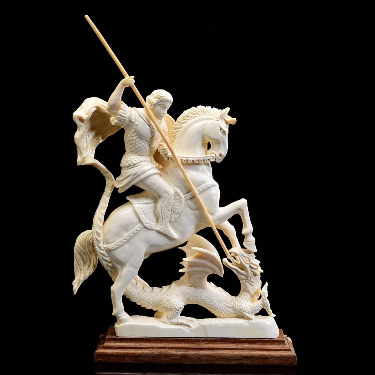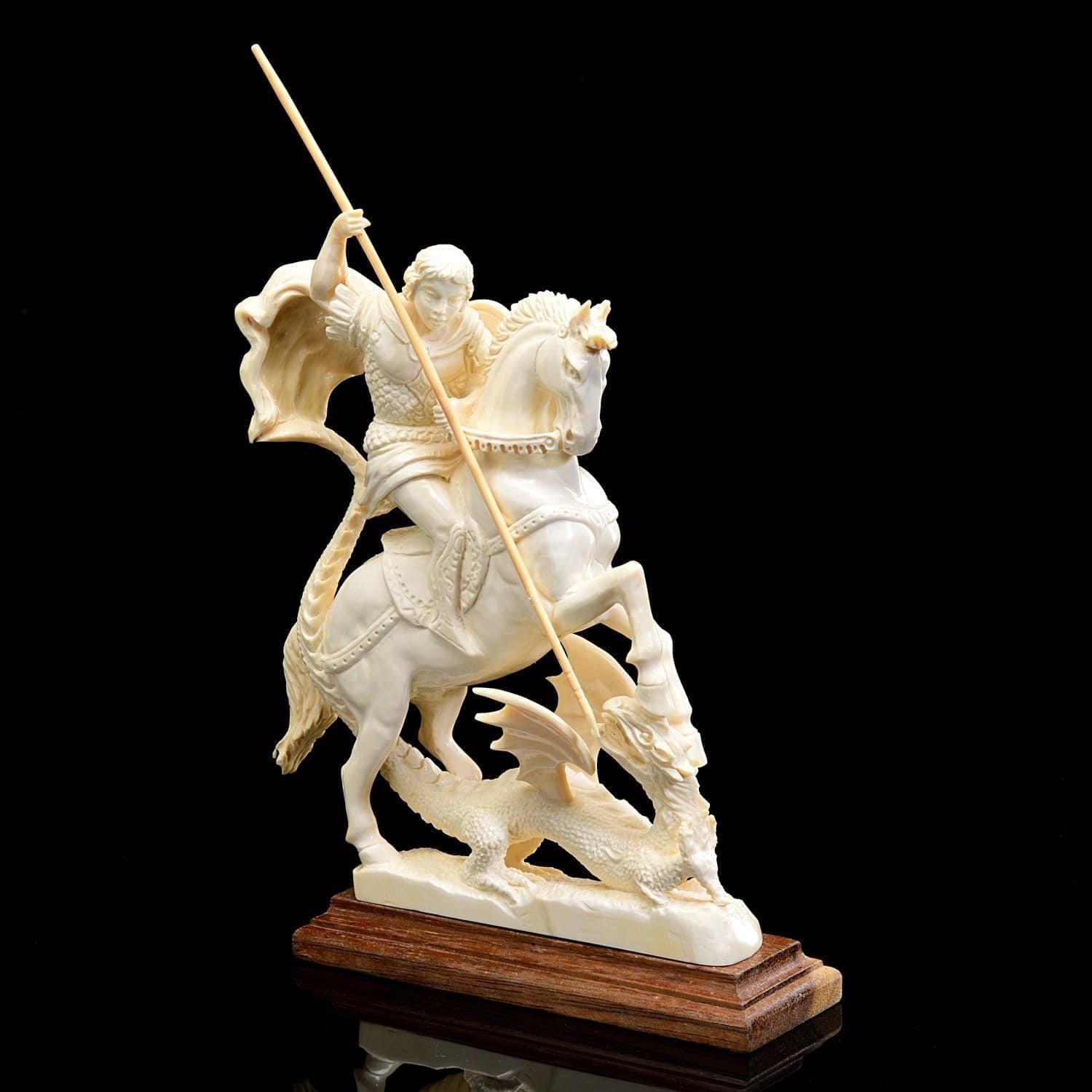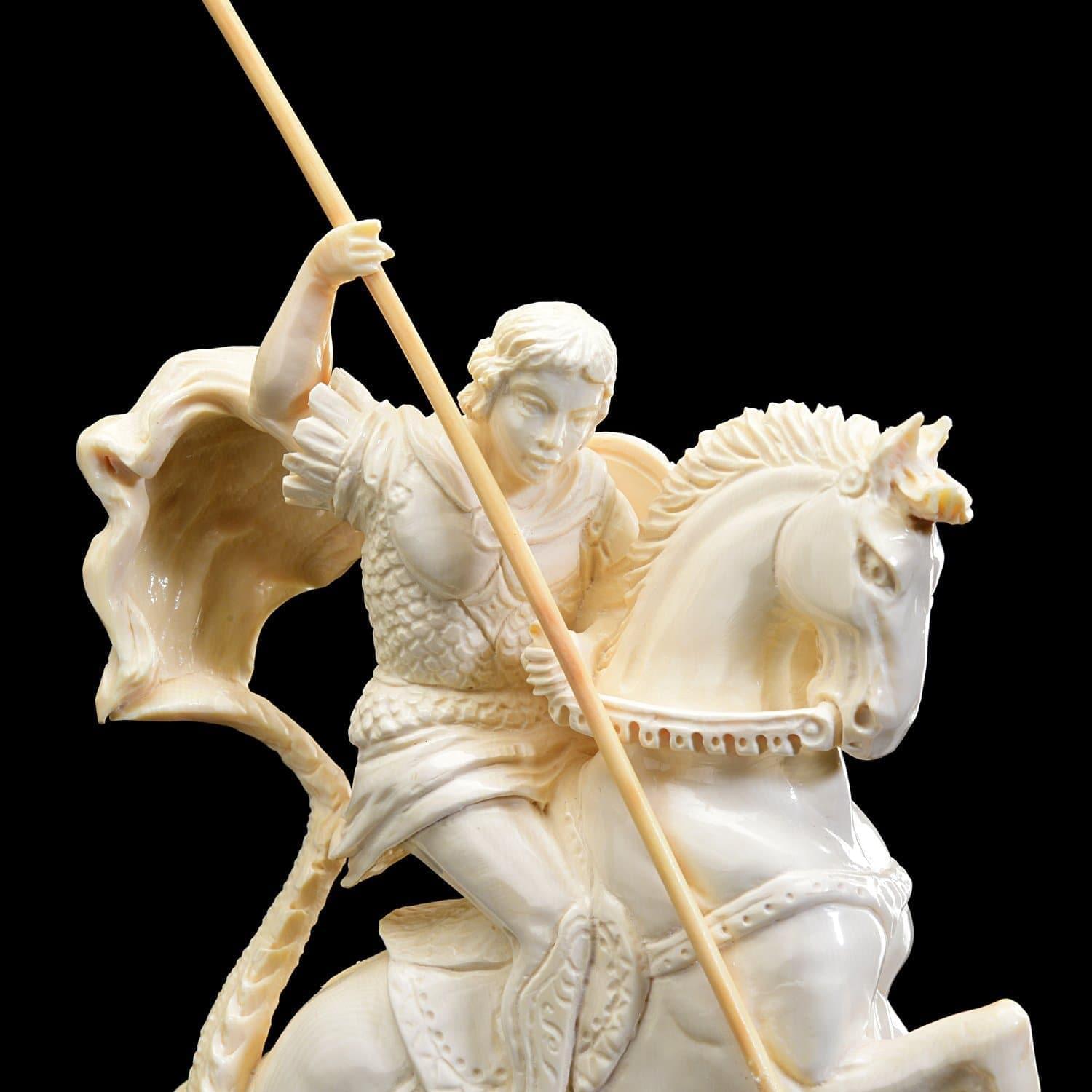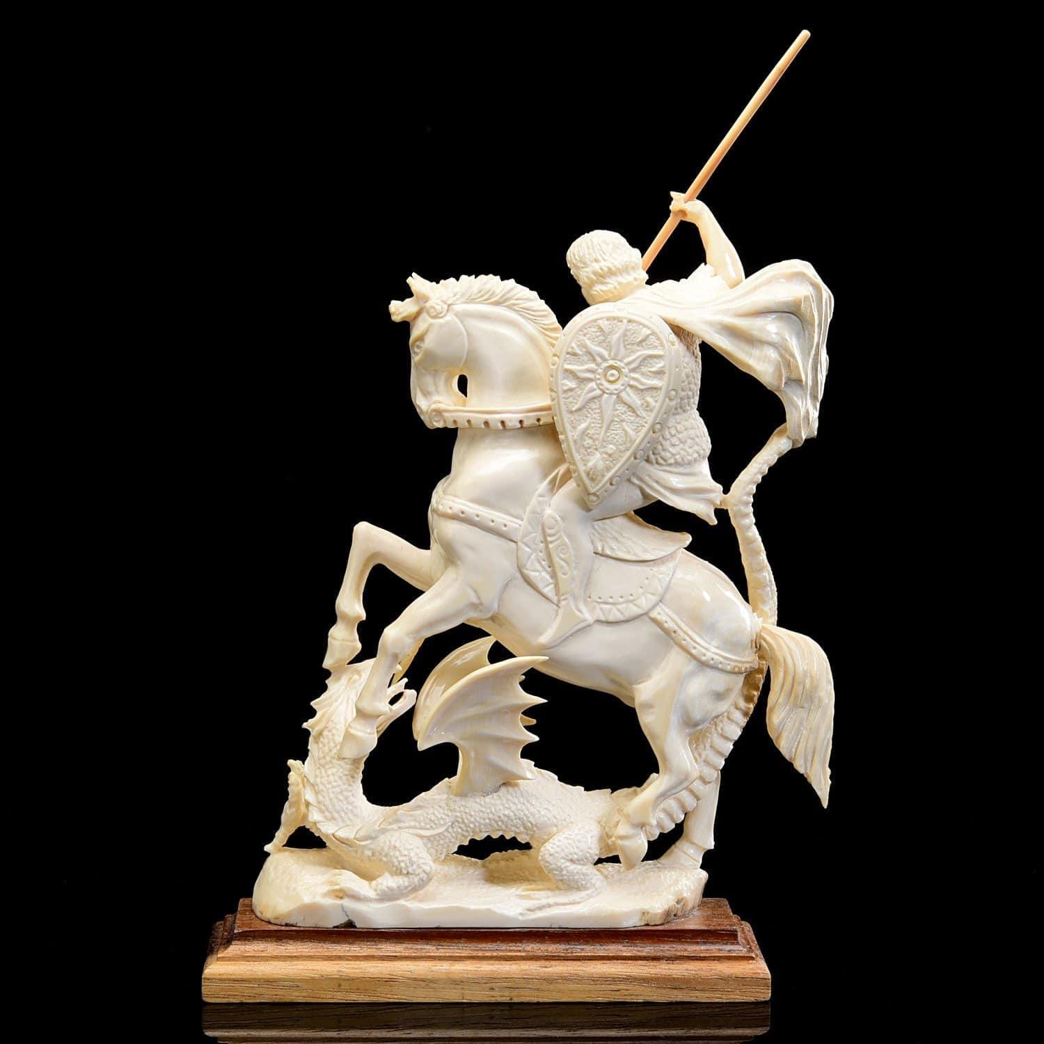 Скульптура из бивня мамонта "Георгий Победоносец" на деревянной подставке