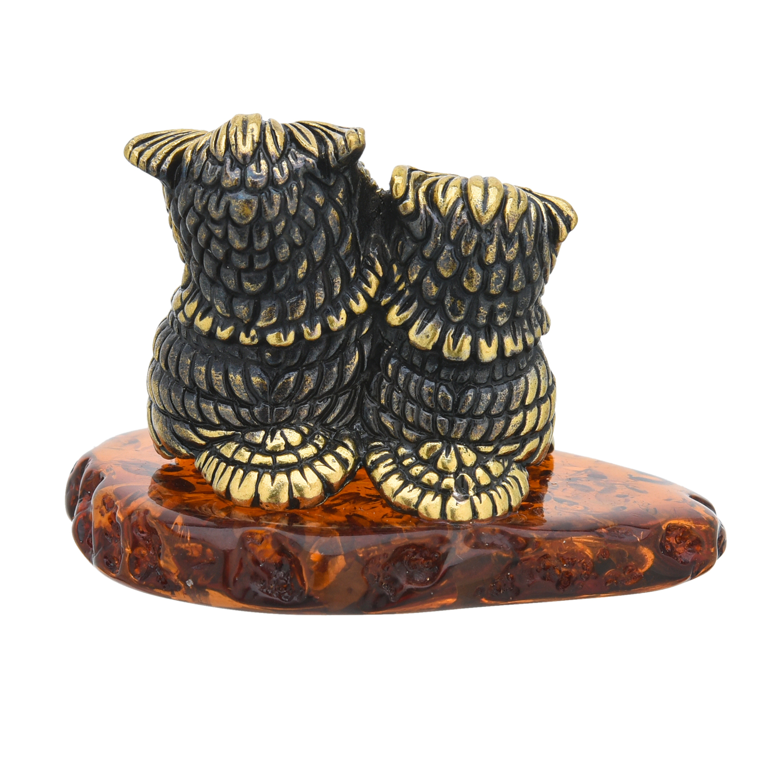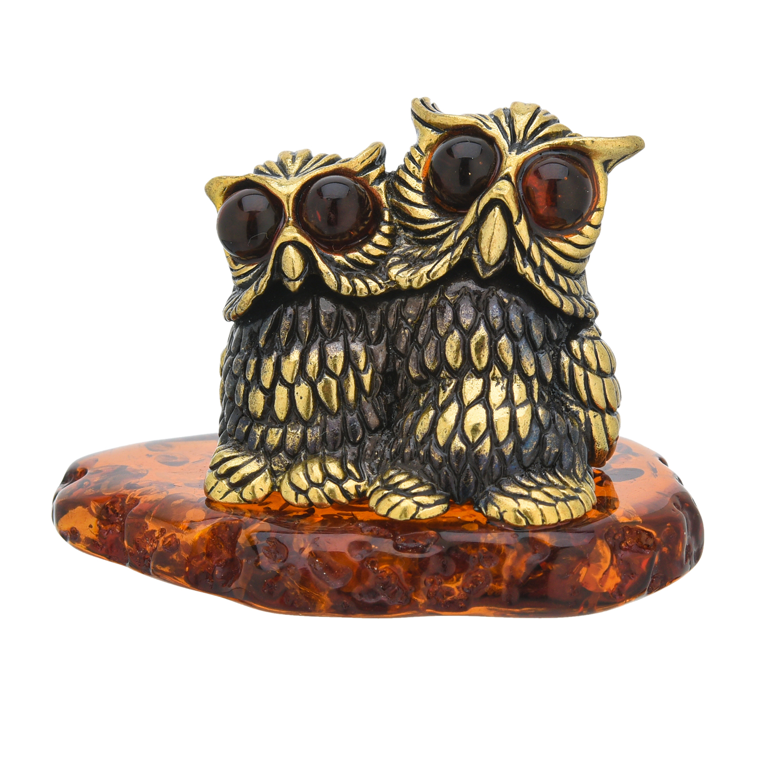 Статуэтка с янтарем "Совушки вместе навсегда".Материалы: латунь, янтарь.