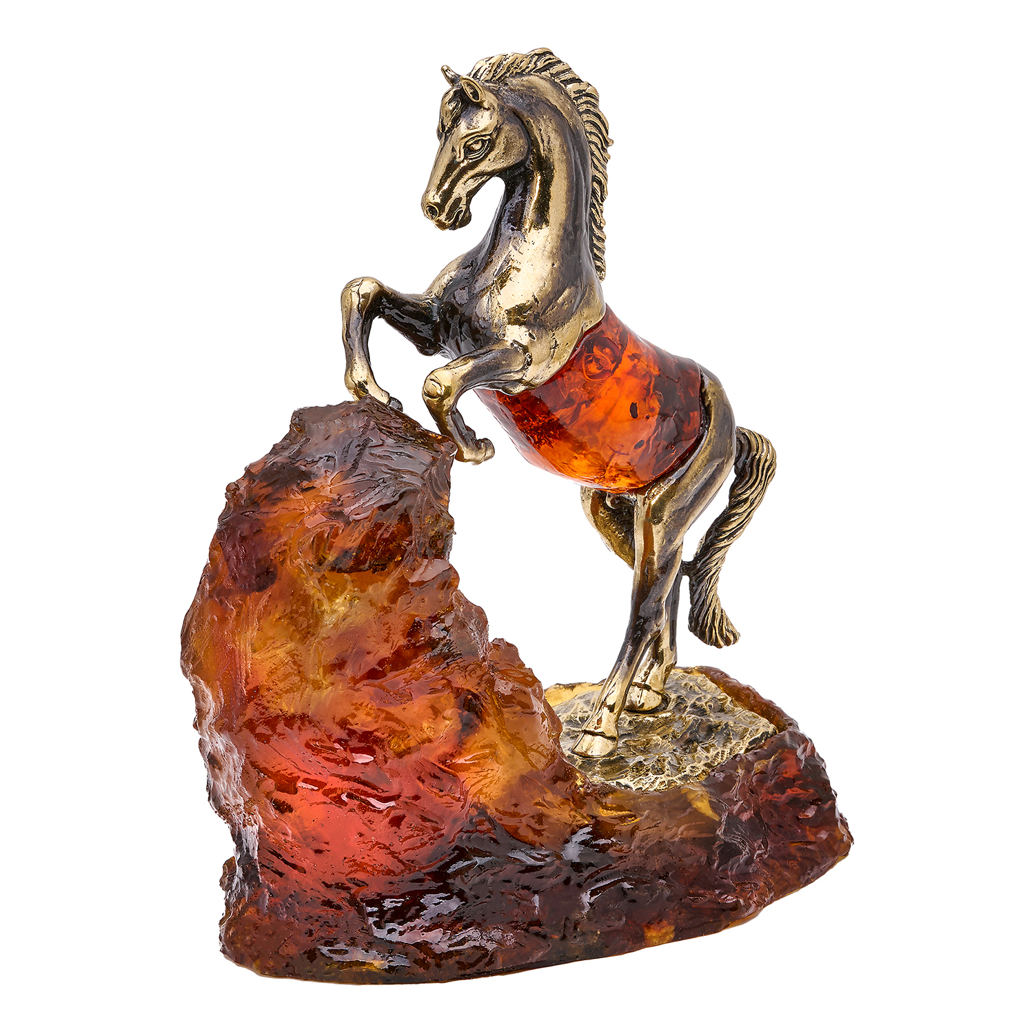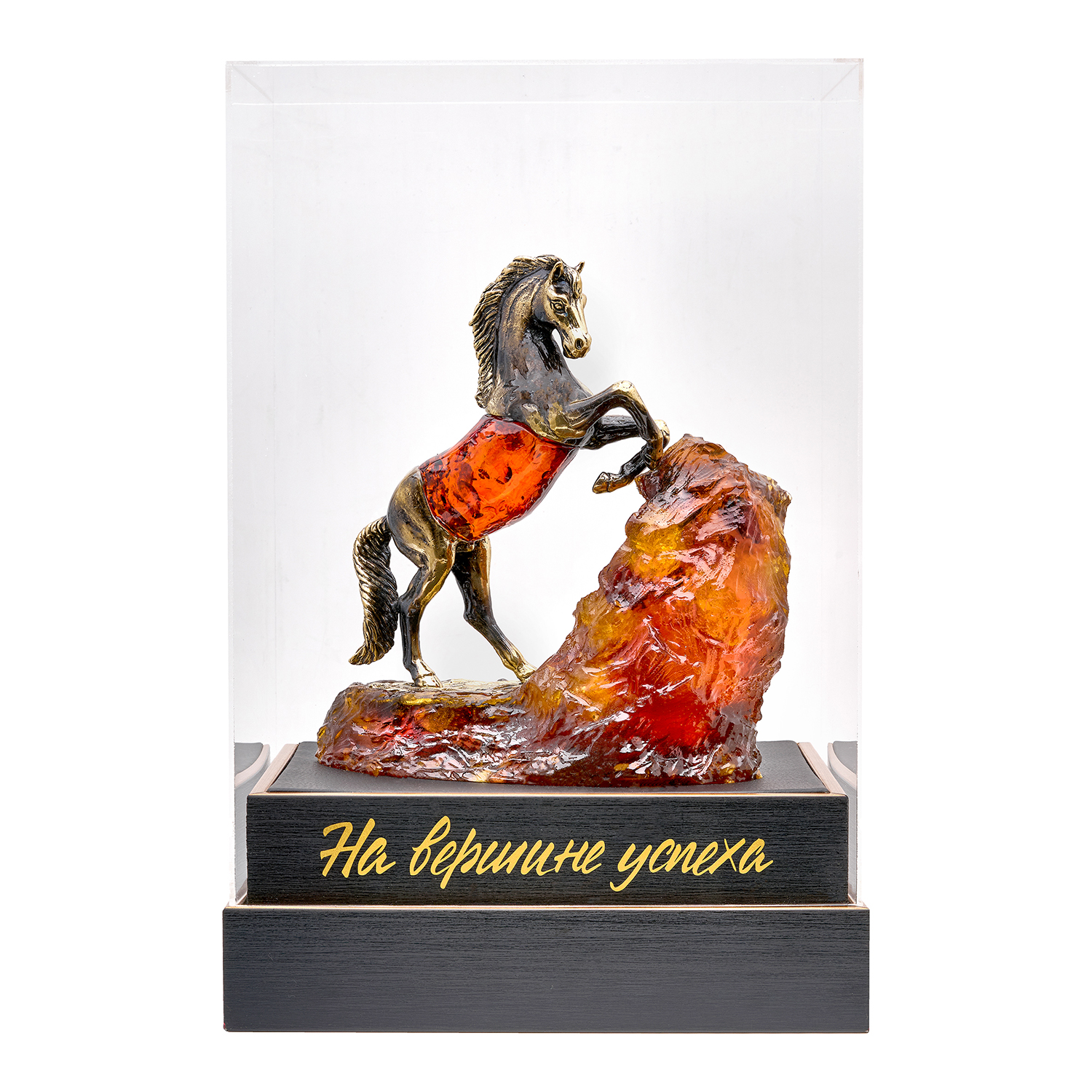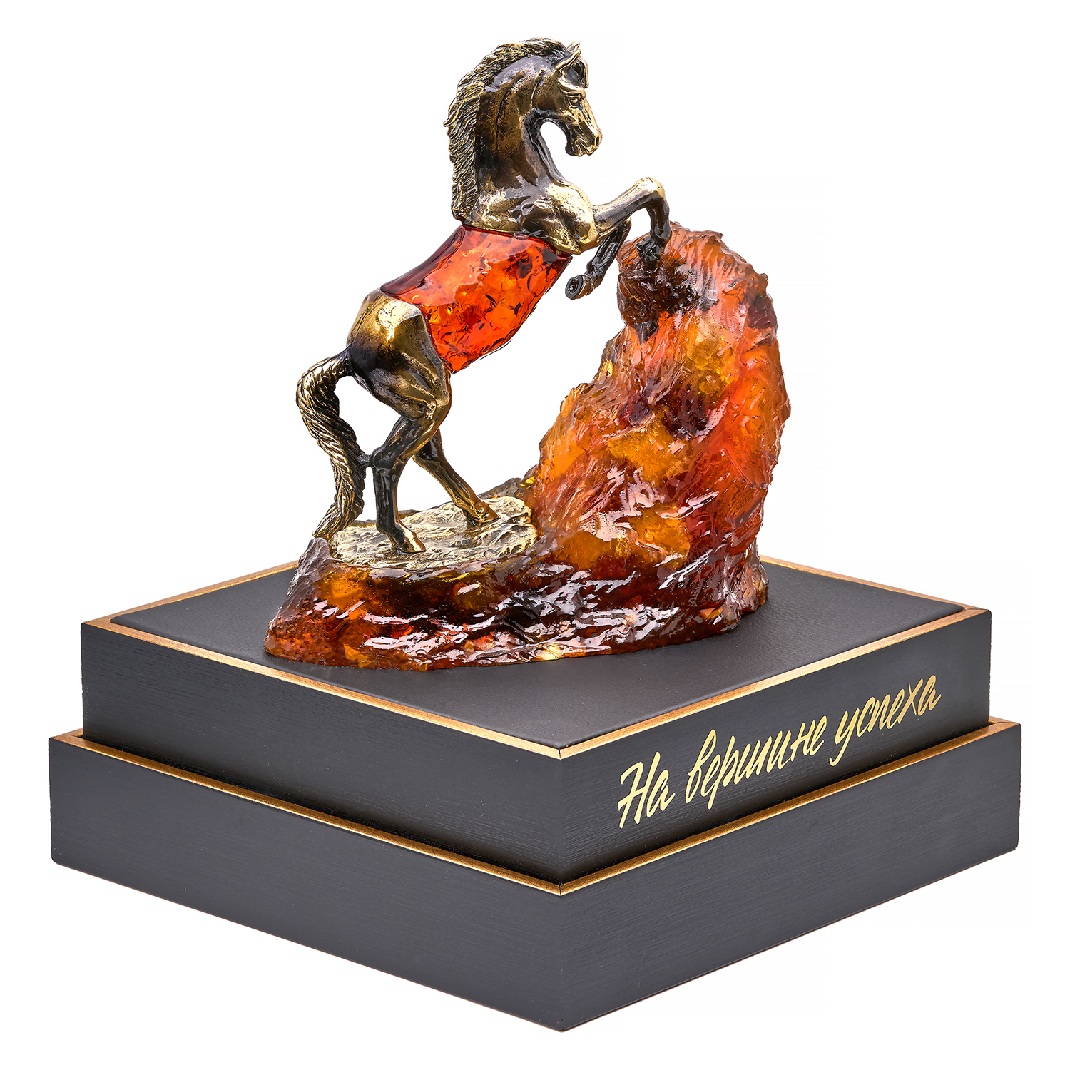 Символ преодоления: вздыбленный бронзовый конь, замерший в триумфальном рывке на глыбе коньячного янтаря, — словно энергия прорыва, отлитая в металл и камень. Композиция, возвышающаяся на лаконичной подставке, преображается под кристальным колпаком из оргстекла: искрящиеся переливы янтаря и блики на бронзовых мускулах танцуют в диалоге силы и времени. Упакована в фирменный красный пакет — готовый вдох для штурмующих новые высоты.