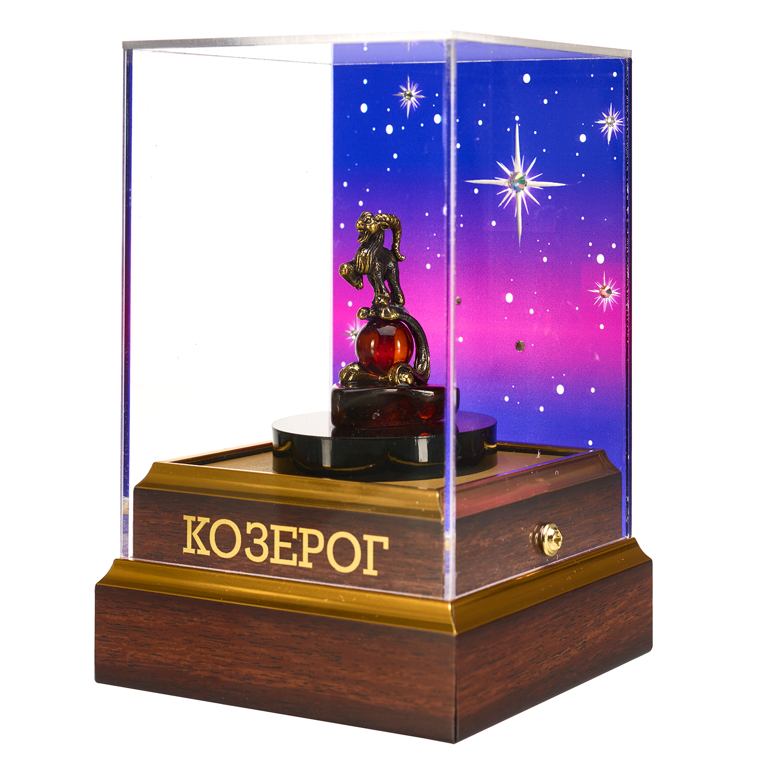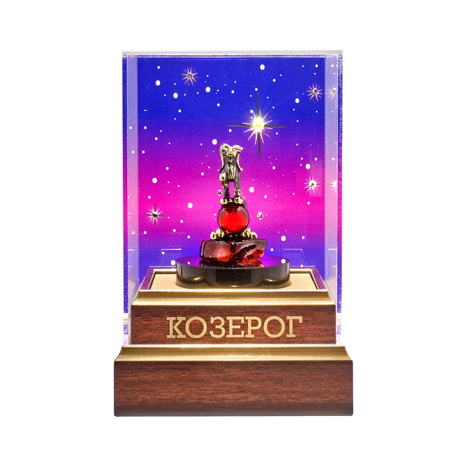 Статуэтка «Козерог» — символ неуклонного восхождения и земной силы. Мощный горный козел в уверенной стойке замер на вершине бронзовой волны, взмывающей от пластины натурального янтаря; в ее изгибе пылает янтарная сфера — источник его энергии. Горделивая осанка и устремленный взгляд олицетворяют амбициозность, дисциплину и непоколебимую стойкость. Статуэтка представлена под прозрачным колпаком с мерцающим звездным небом из искрящихся кристаллов и дополнена фирменным подарочным пакетом, создавая законченный достойный подарок для целеустремленных.