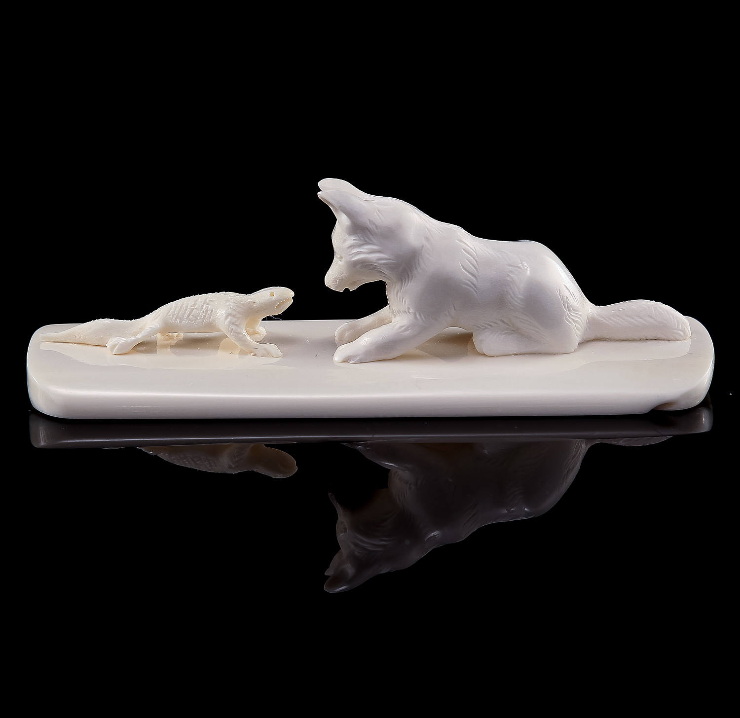Изделие представляет собой скульптурную композицию, изображающую маленького волчонка, играющего с ящерицей.