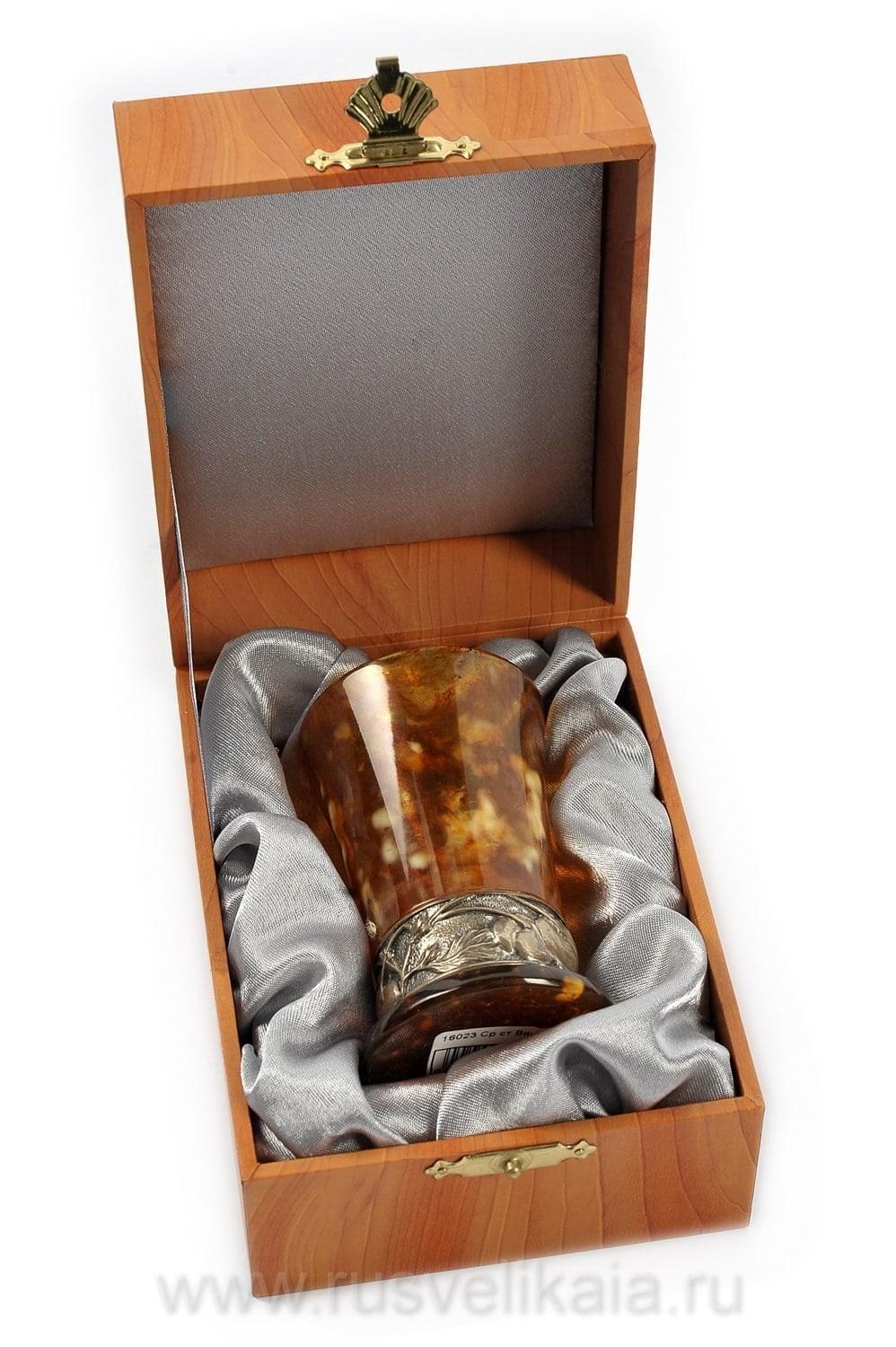 Корпус стопки изготовлен вручную из балтийского янтаря. Янтарь - это достояние России: 90% всех мировых запасов чудодейственного камня янтаря находится на ее территории, у берегов Балтийского моря. Этот камень представляет собой окаменевшую за более чем 40 тысяч лет смолу хвойных деревьев с различными включениями (инклюзами) и примесями в составе. Янтарь издавна используется как оберег и камень-целитель. В древности императоры оценивали один янтарь в жизнь одного дееспособного раба.