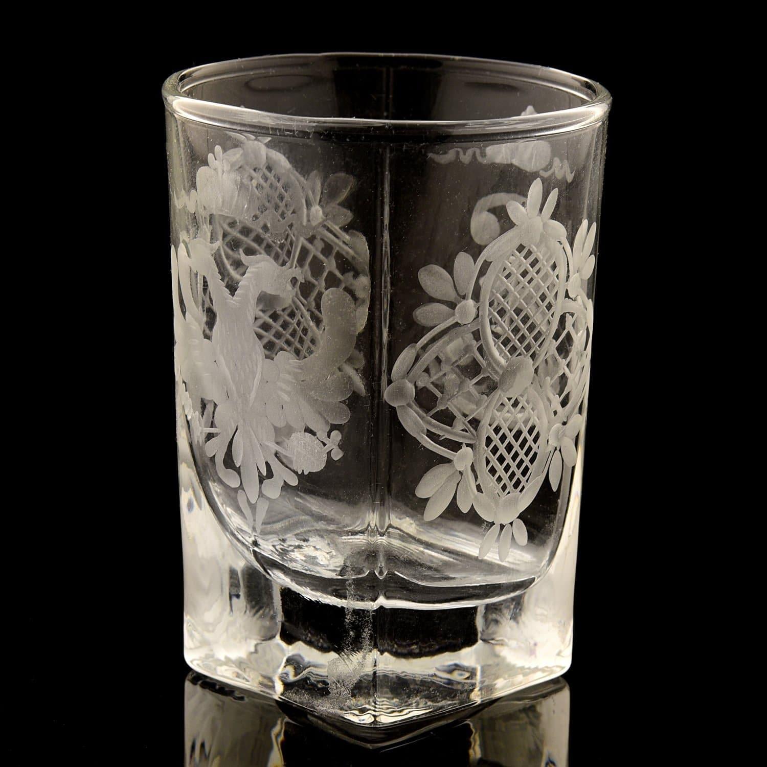 Корпус стопки изготовлен из прозрачного стекла специально для почитателя горячительного напитка, известного всему миру. Поверхность корпуса декорирована в техниках пескоструйной обработки стекла, гравировки, шлифовки и матирования. Герб Российской империи в виде двуглавого орла с императорской короной изображен в рамках оригинальной композиции.