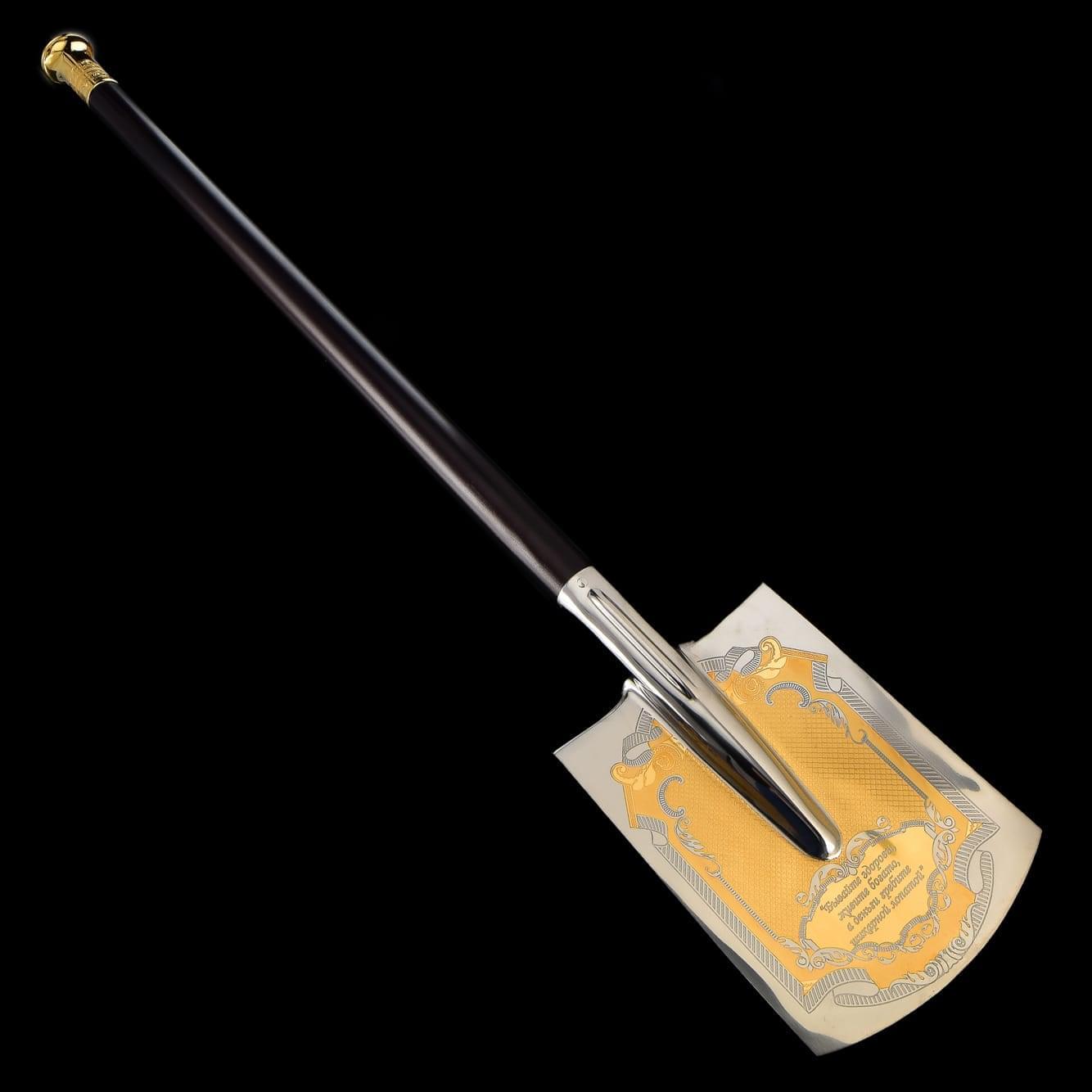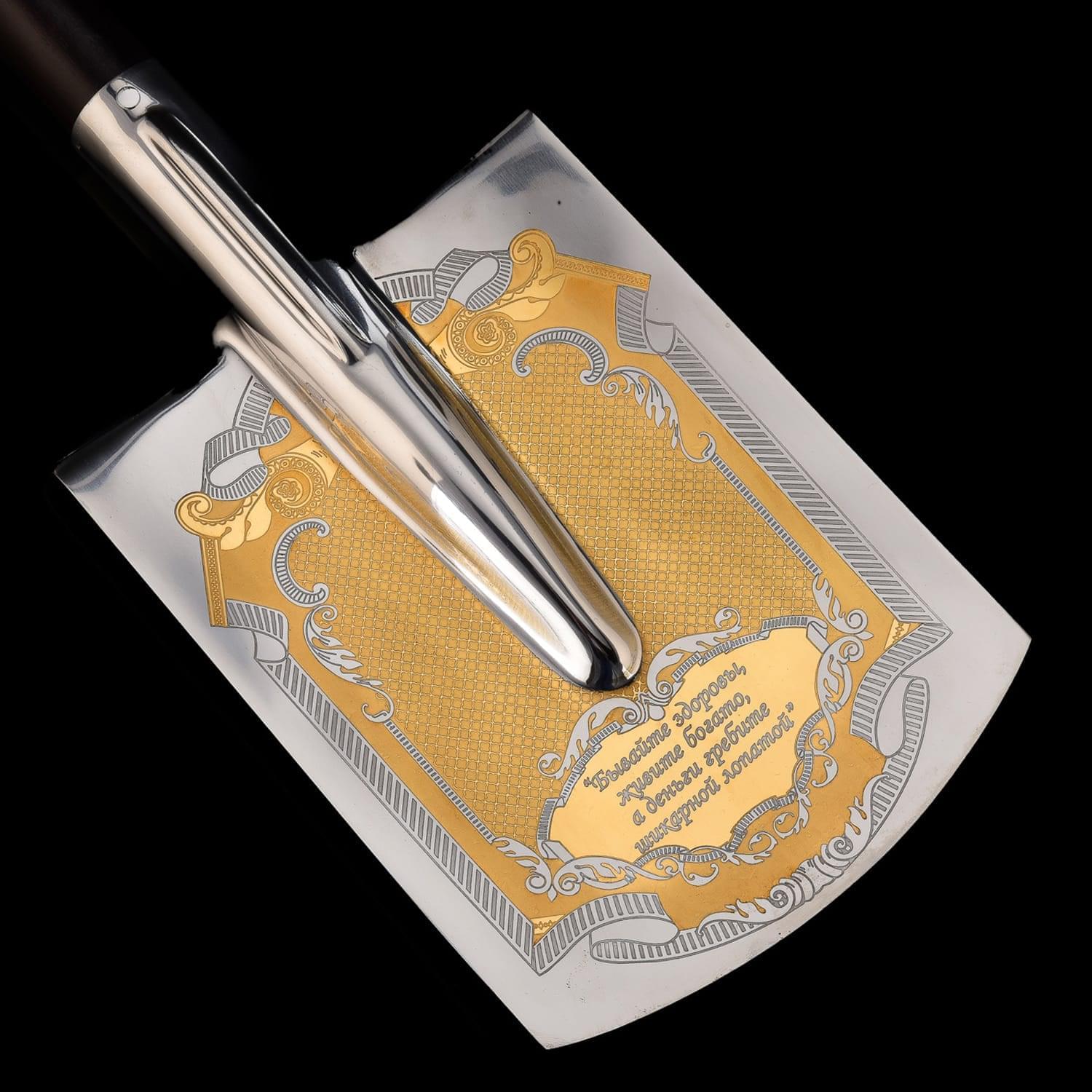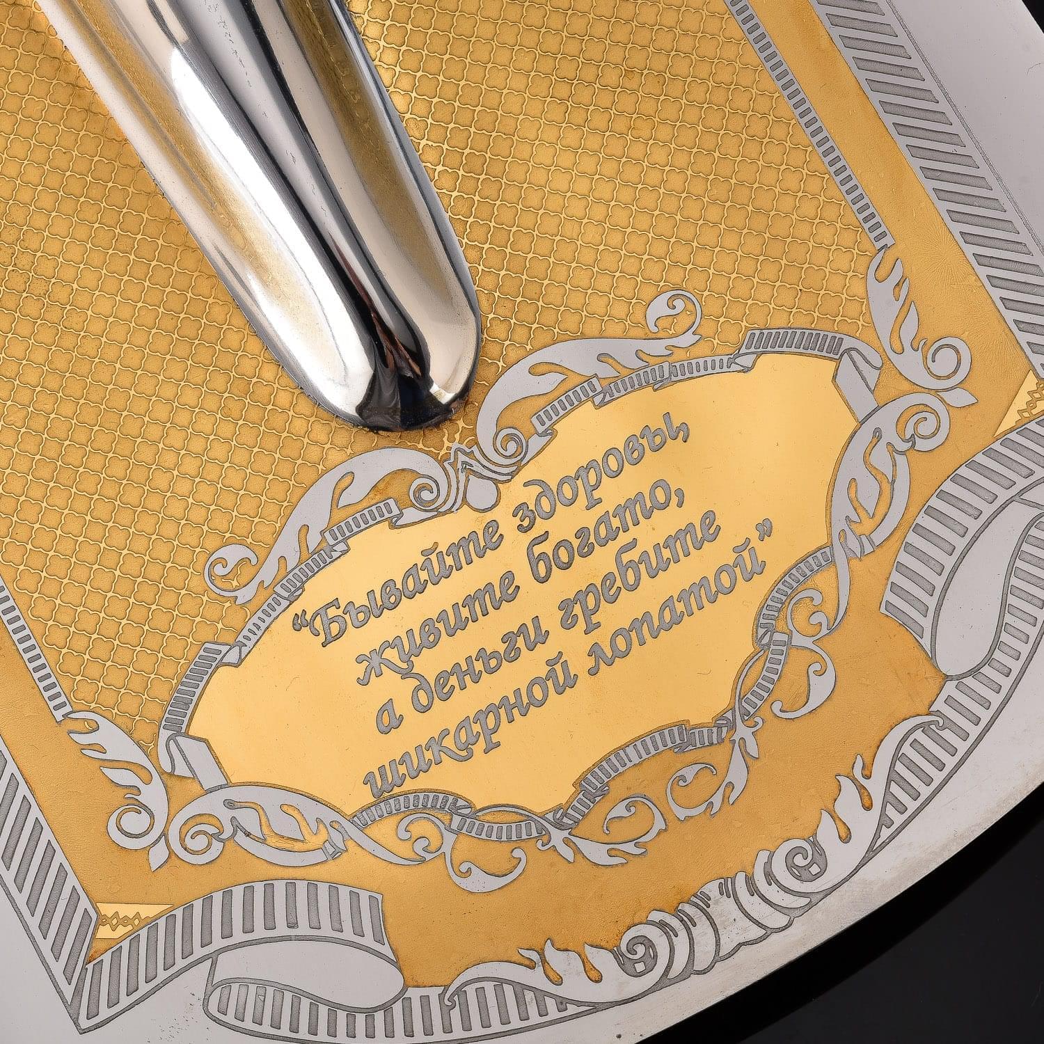 На финансовую удачу!Перед Вами - оригинальный образец предметного дизайна, денежная лопата как вариант vip-подарка на финансовую удачу. Рабочая поверхность лопаты тонирована золотом, декорирована детальным орнаментом, обрамляющим текст-пожелание «Бывайте здоровы, живите богато, а деньги гребите шикарной лопатой». Оформление рабочей металлической поверхности лопаты выполнено в техниках Златоустовской гравюры на металле...