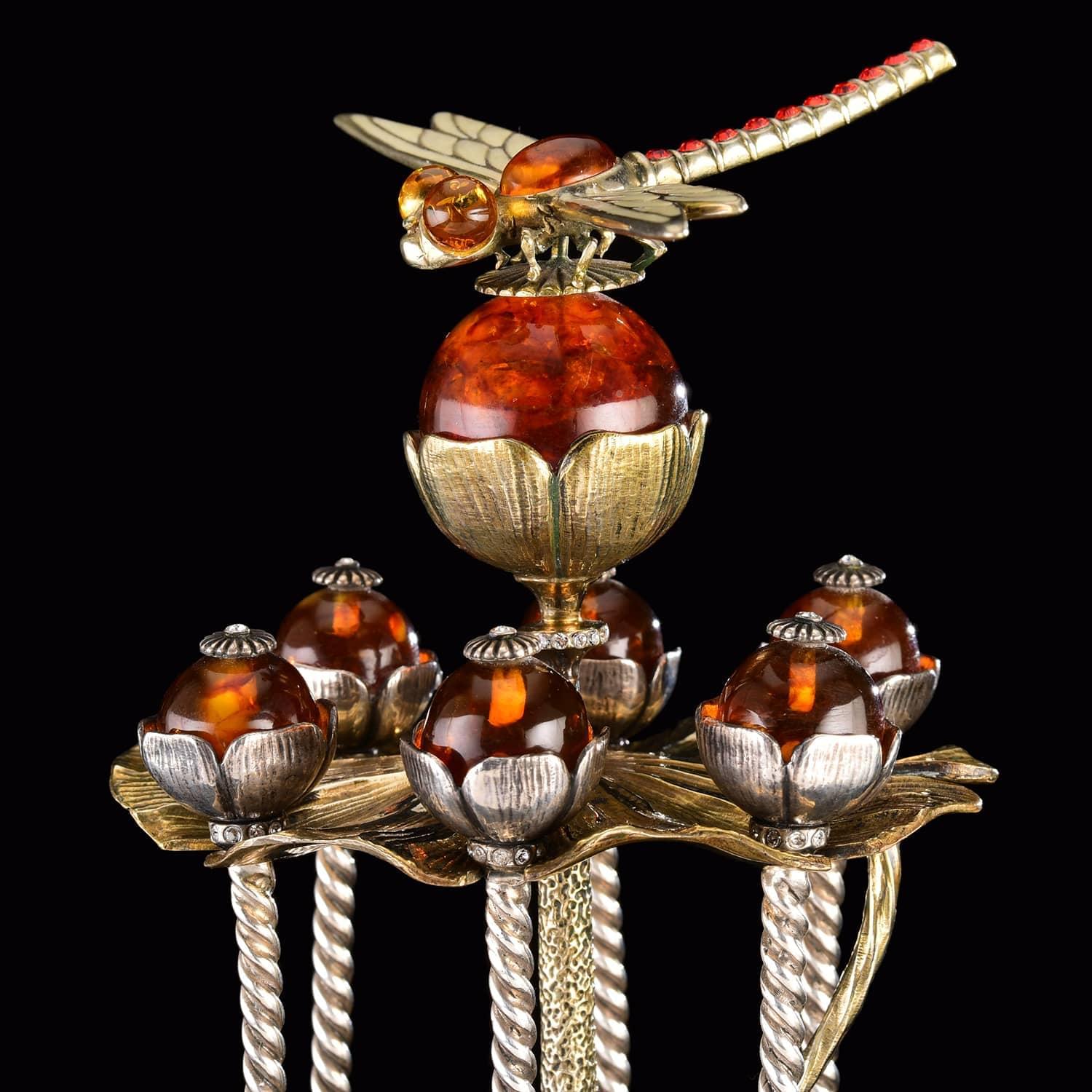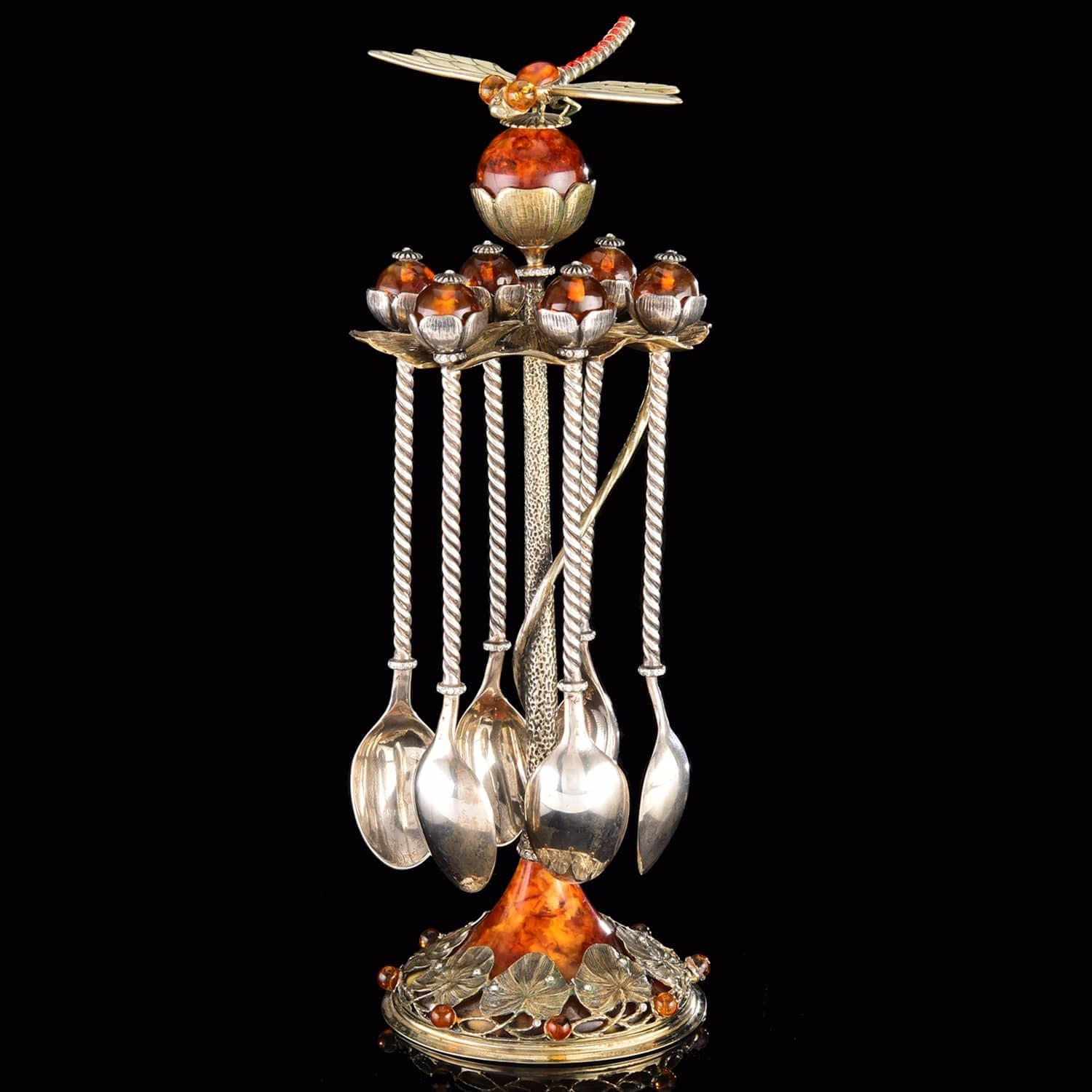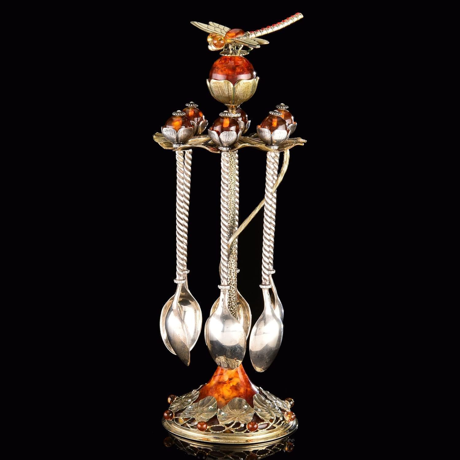 Ложка - символ достатка. Серебряная ложка - символ здоровья и долголетия. Дизайнерский набор с ложками на подставке со стрекозой на верху сделан вручную из бронзы, драгоценного металла-самородка, серебра и солнечного камня янтаря, найденного на побережье Балтийского моря. Шесть литых ложек с изящными "держалами", украшенными фигурными навершиями из янтаря, вместе с фигурной подставкой, созданной по авторскому эскизу в технике художественного литья, уложены в подарочный короб и готовы к дарению.Стрекоза - символ лета, хранительница дома. За нее так и хочется ухватиться!