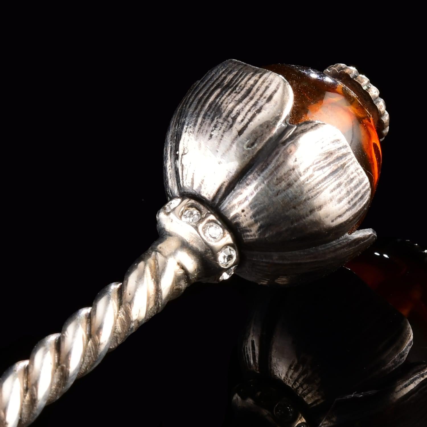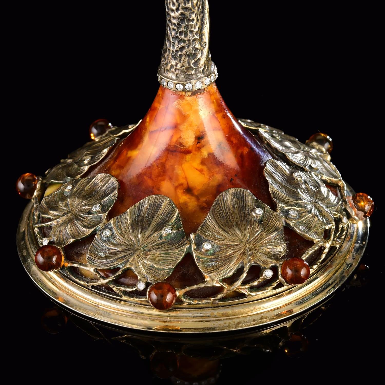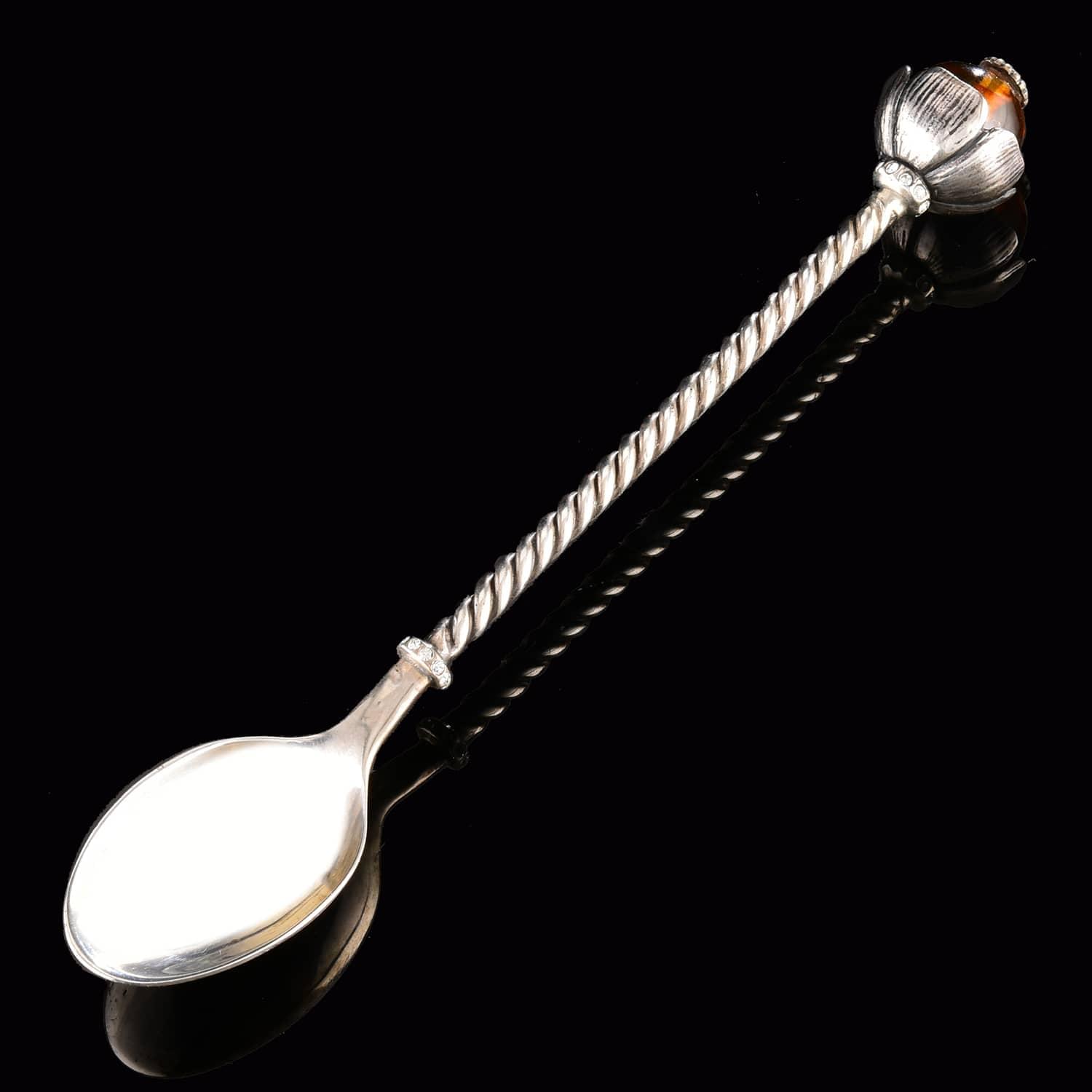 Декоративные элементы для ложек и подставки оформлены из медового янтаря, также использованы элементы хрусталя. Янтарь называют в народе "даром солнца" и "слезой моря". Природный минерал янтарь собирается на побережье Балтийского моря. Он представляет собой отвердевшую за 45-150 тысяч лет смолу хвойных деревьев.