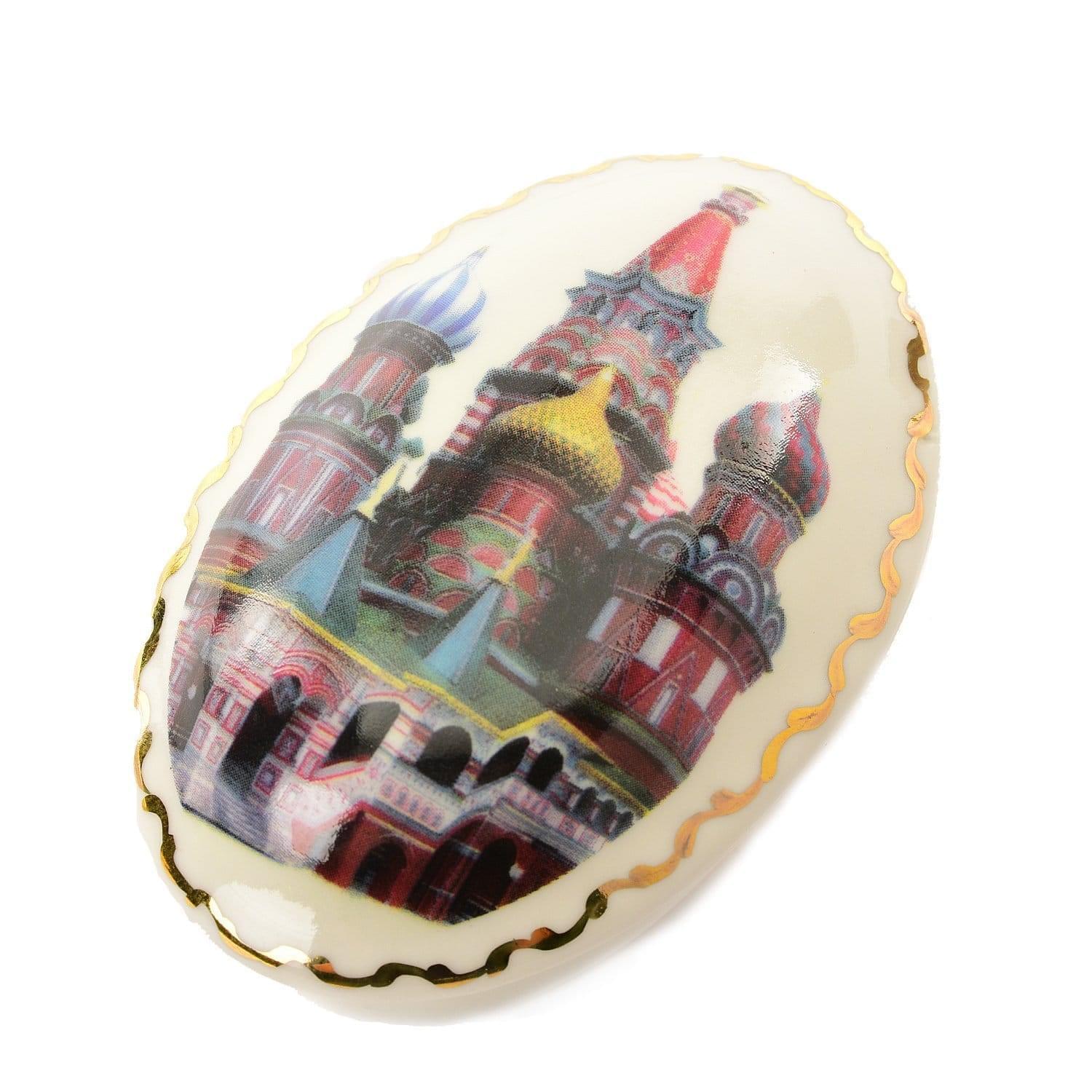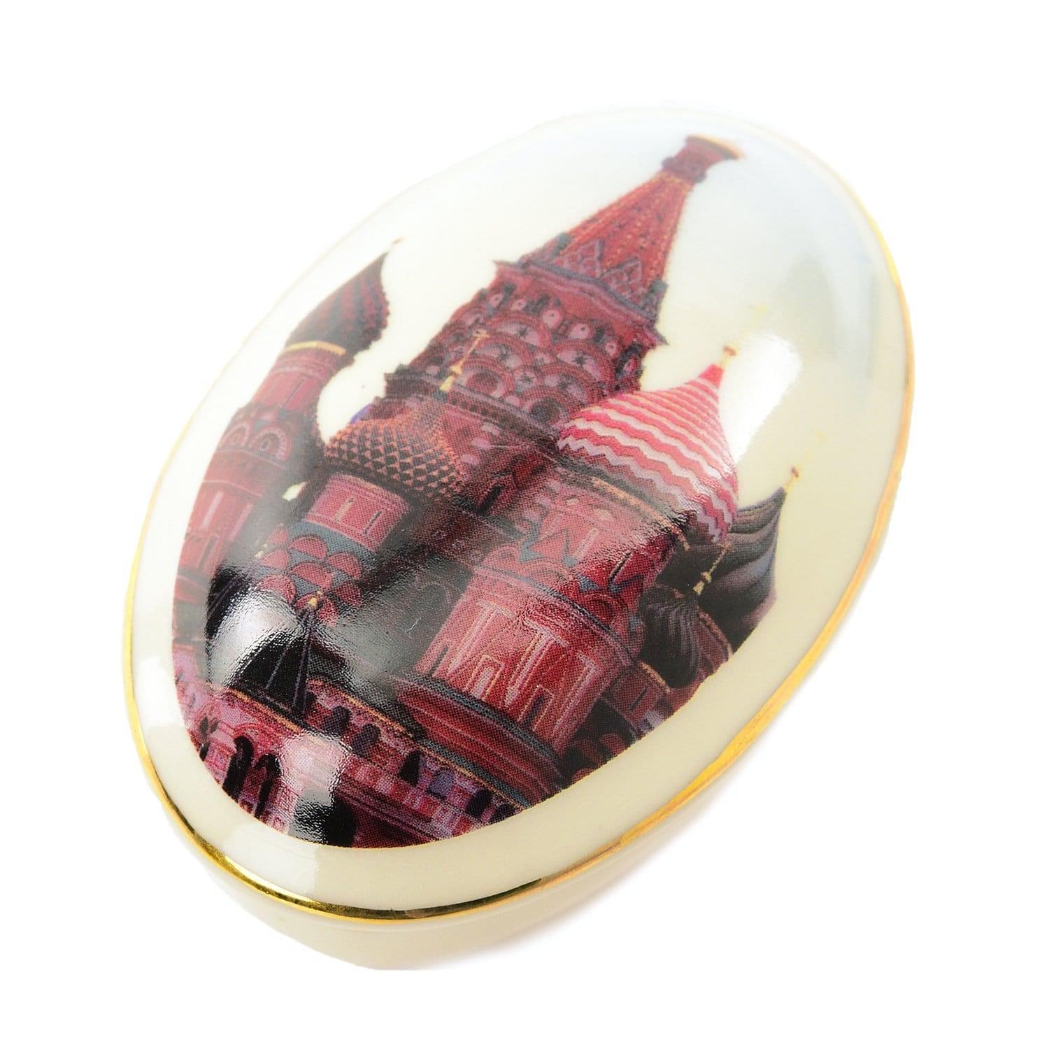 Фаянсовая шкатулка с видами и достопримечательностями Москвы вошла в новую партию сувениров, которые точно не останутся лежать без дела и будут напоминанием о счастливых путешествиях и встречах. Овальный объемный  корпус этой шкатулки, представленной в двух вариантах, сформирован из керамики, приготовленной на основе высококачественной глины.  Ее лицевая поверхность оформлена в технике деколь, предполагающей нанесение рисунка на керамическую поверхность с листа бумаги. На съемной крышке шкатулки изображен Храм Василия Блаженного, расположенный возле Московского Кремля, главной резиденции президента России. Роспись защищена слоями прозрачной стеклянной глазури. Эффектная позолота нанесена поверх нее. .