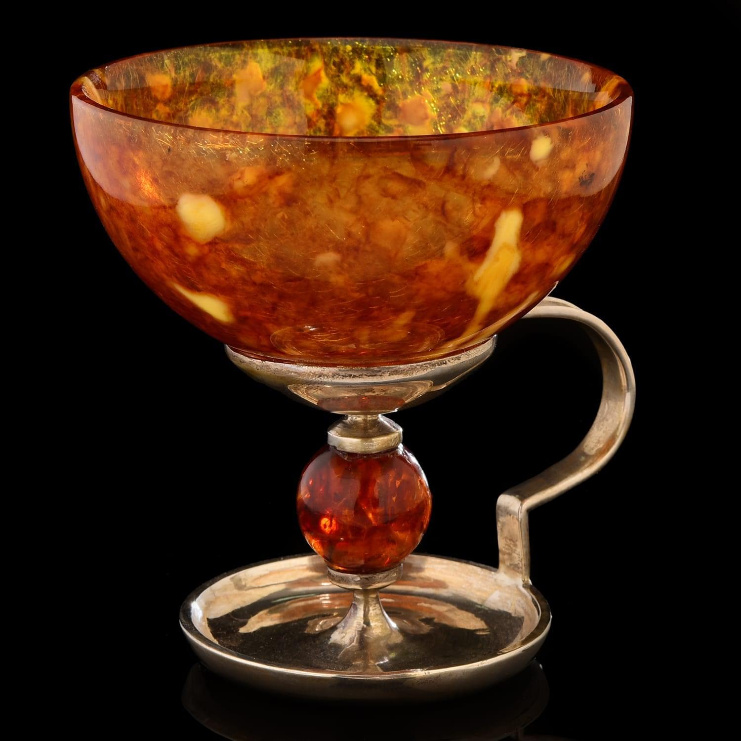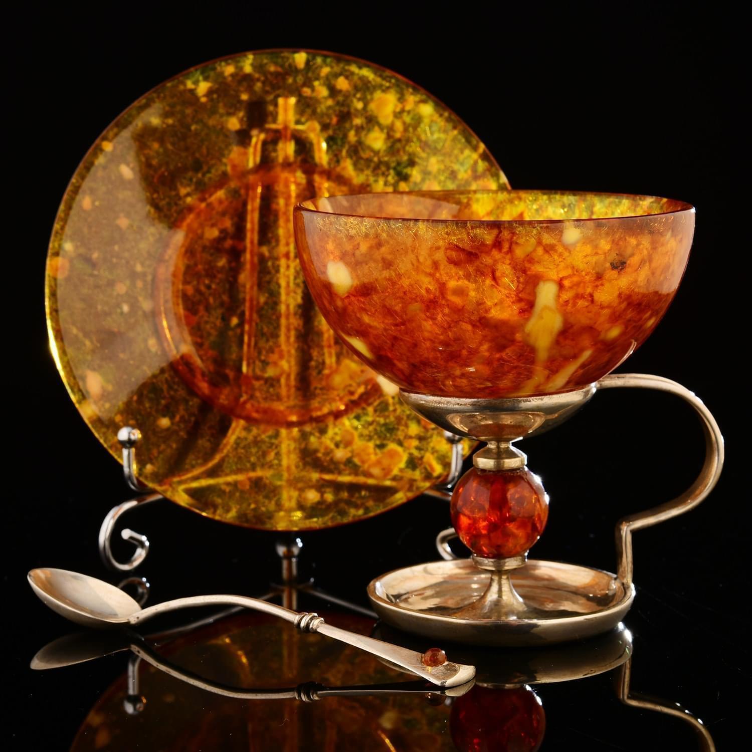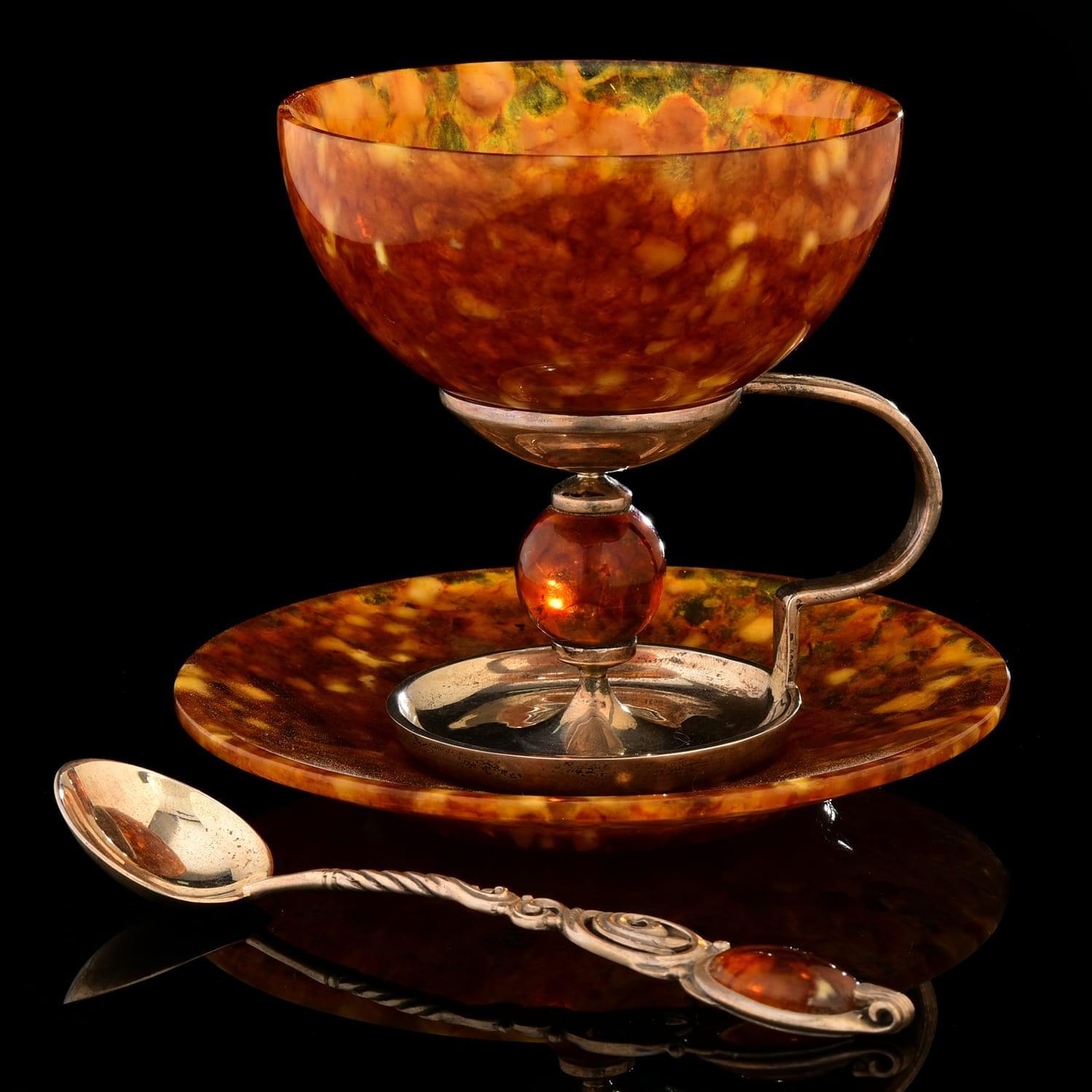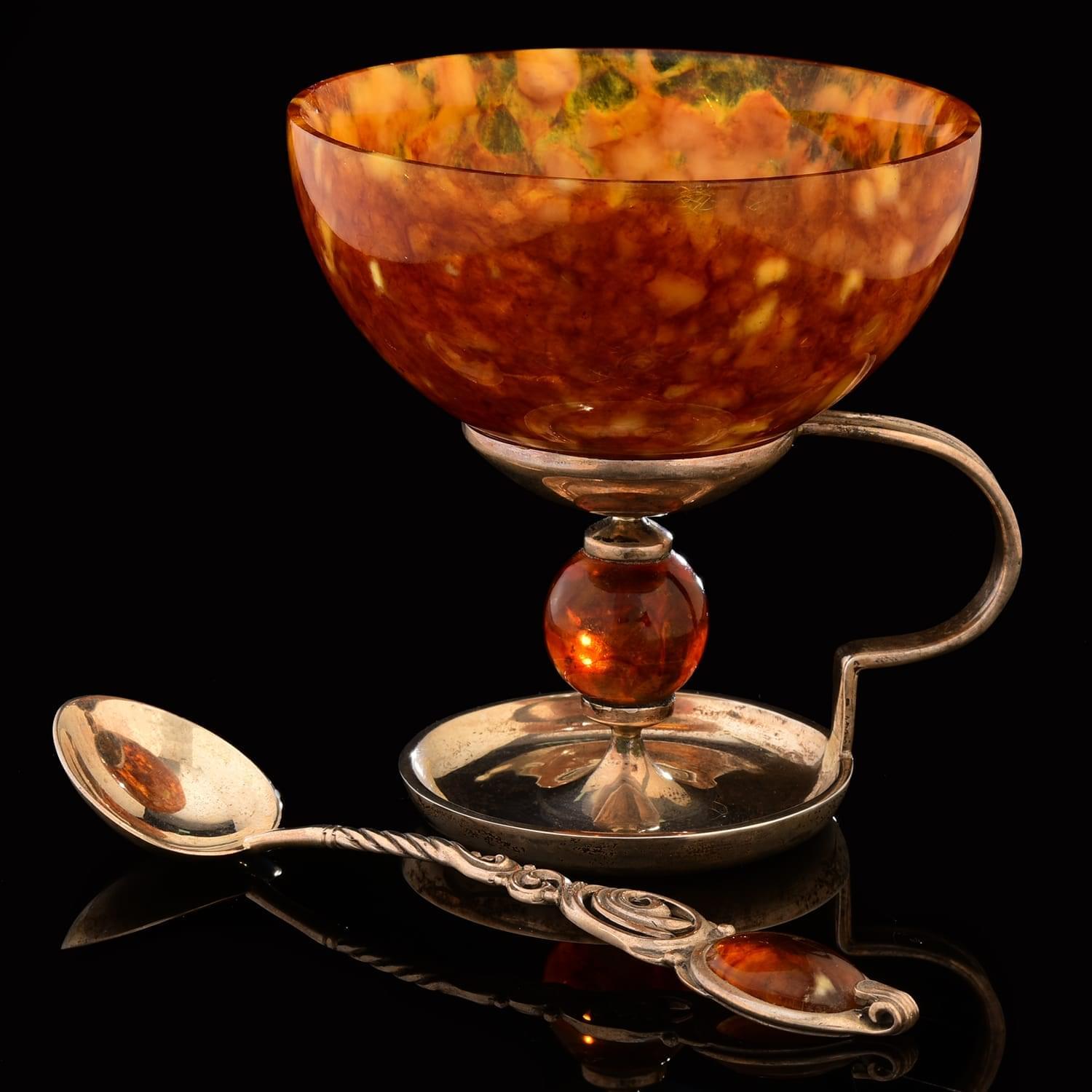 Вашему вниманию - практичный вариант дизайнерского подарка в русского стиле, деликатесный набор с  образцами авторской посуды и ложкой, которые сделаны вручную из янтаря и бронзы, украшены литыми декоративными элементами из  драгоценного металла-самородка серебра / бронзы. Корпуса чашки и блюдца оформлены из прессованного янтаря различных сортов - магического камня, на формирование которого ушло более 45 тысячелетий.