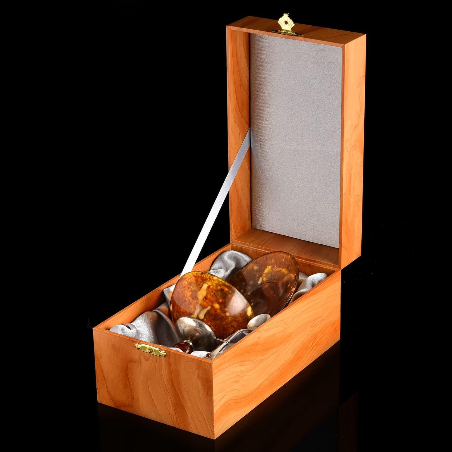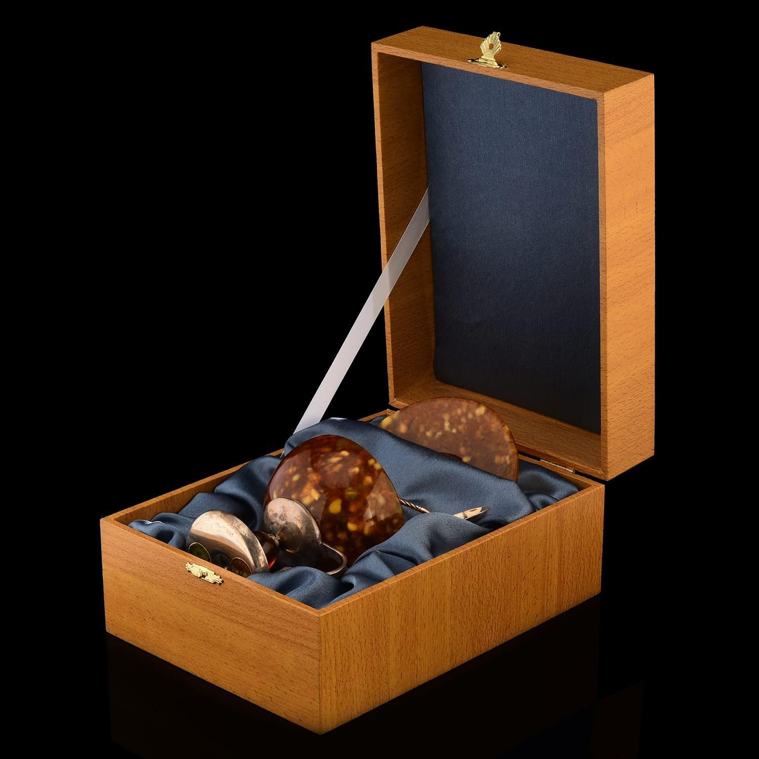 Предметы набора уложены в подарочный короб из дерева и готовы к дарению.  Авторская  работа, деликатесный набор из янтаря "Шар" из янтаря и  бронзы с ложкой  - это практичный вариант дизайнерского  подарка-сувенира  на  Юбилей, Свадьбу, День рождения, общий или личный праздник. ....