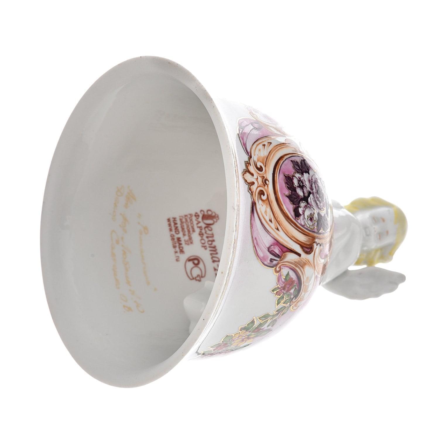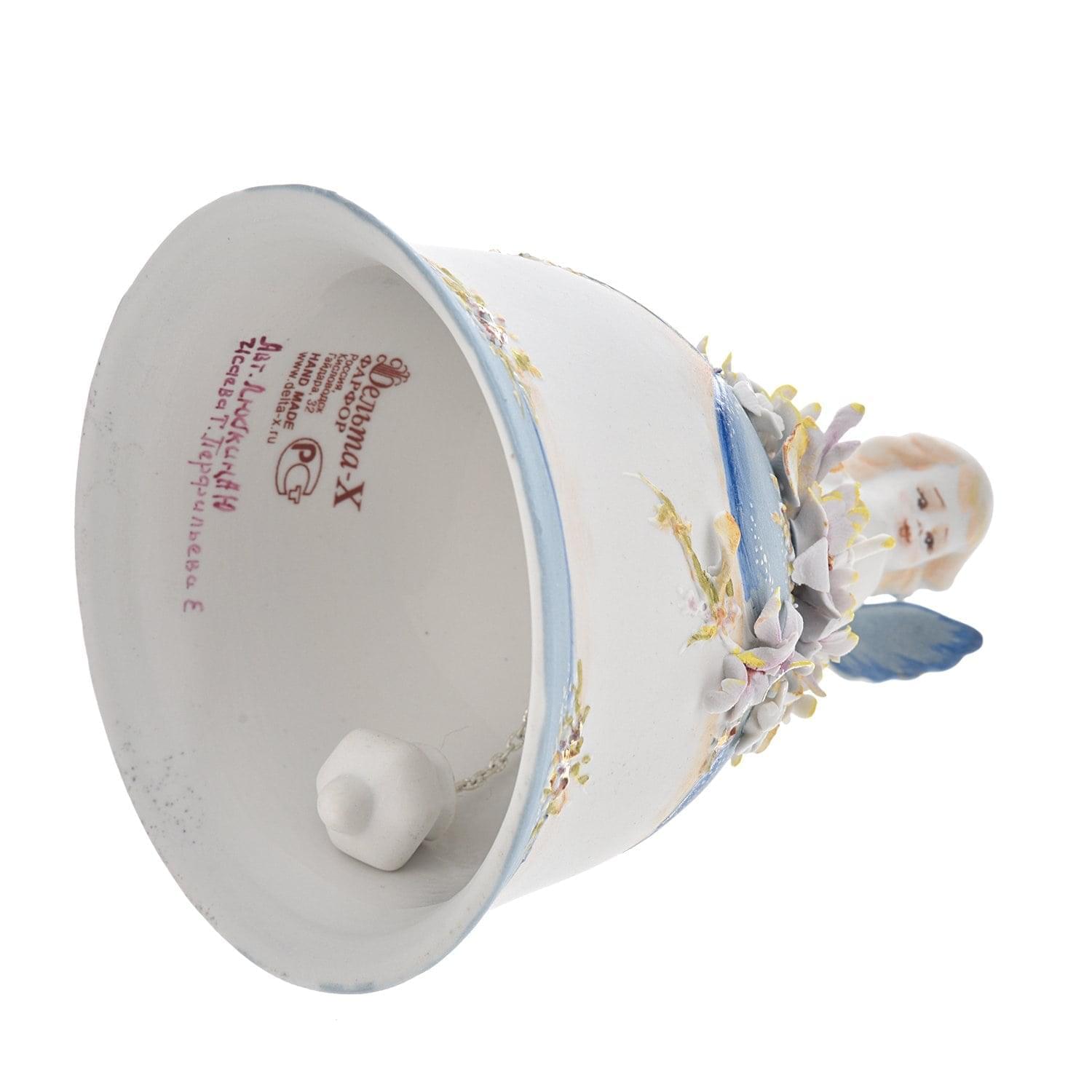 Фигурный корпус маленького колокола создан по чудесному авторскому эскизу из "русского белого золота" - твердого, не пористого фарфора, приготовленного на основе высококачественной подмосковной глины. Он расписан вручную разноцветными красками в технике подглазурной росписи. Колокольчик с композицией в стиле ампир на "тулове" имеет лепную ручку в виде ангела.