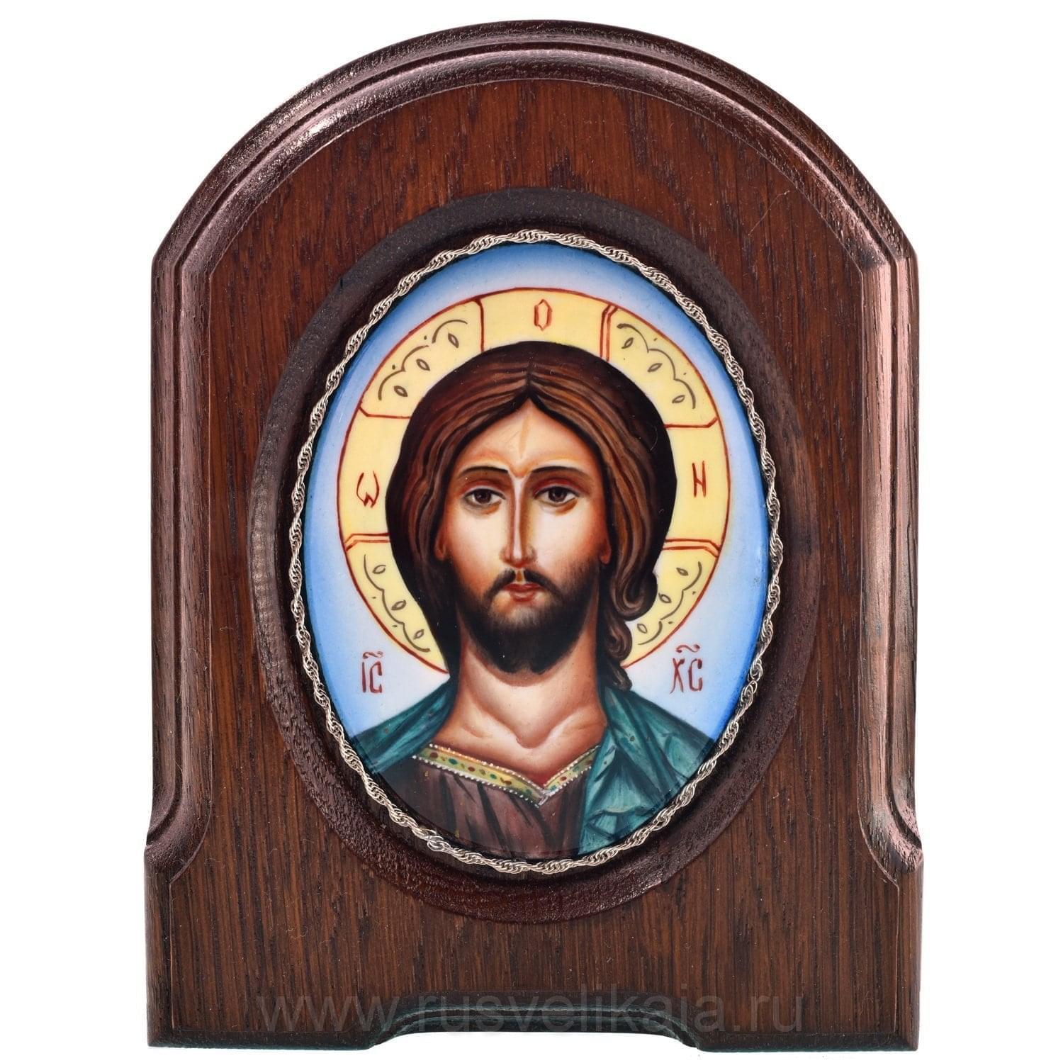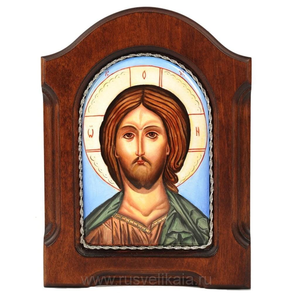 Икона Спасителя выполнена по технологии ростовской финифти. Входящие в ее состав медь, ювелирная эмаль и огнеупорные краски делают икону долговечной и устойчивой к внешнему воздействию.