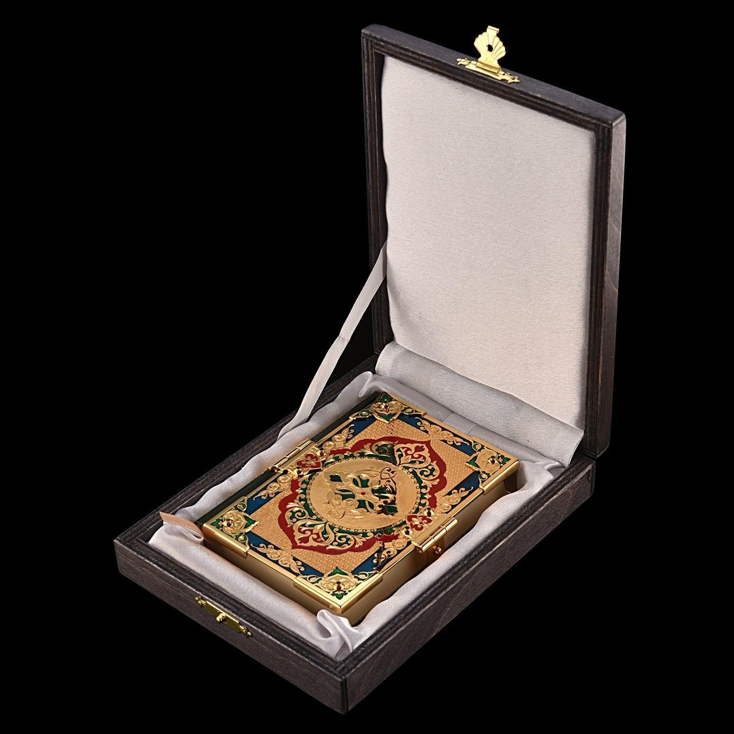 Священная книга на арабском в переплете от мастеров Златоуста - настоящая находка! Коран, главная книга мусульман, представляет собой свод откровений, произнесенных когда-то пророком Мухаммедом от имени единого исламского Бога Аллаха. Это издание имеет художественную и коллекционную ценность, является роскошным украшением интерьера и будущей семейной реликвией. Имеется функциональный замочек. Инкрустация полудрагоценными камнями, сияющими фианитами, делает переплет произведением декоративно-прикладного искусства. Для тонировки латунного корпуса использовалось чистое золото (999,9), для выразительности декора - эмаль разных цветов. Ляссе создает дополнительное удобство при чтении. Коран помещен в стильную подарочную упаковку из дерева. Материал: бумага, полиграфия, латунь, никель, позолота, эмаль, фианиты. Размер: 12,5х9 см. Техника исполнения: токарные работы, рисовка кистью, гравировка иглой по лаку, травление, гравировка резцом, полировка, никелирование, золочение. В изделии использовались традиционные методы обработки и украшения Златоустовской гравюры на металле. ....Извините, товар отсутствует