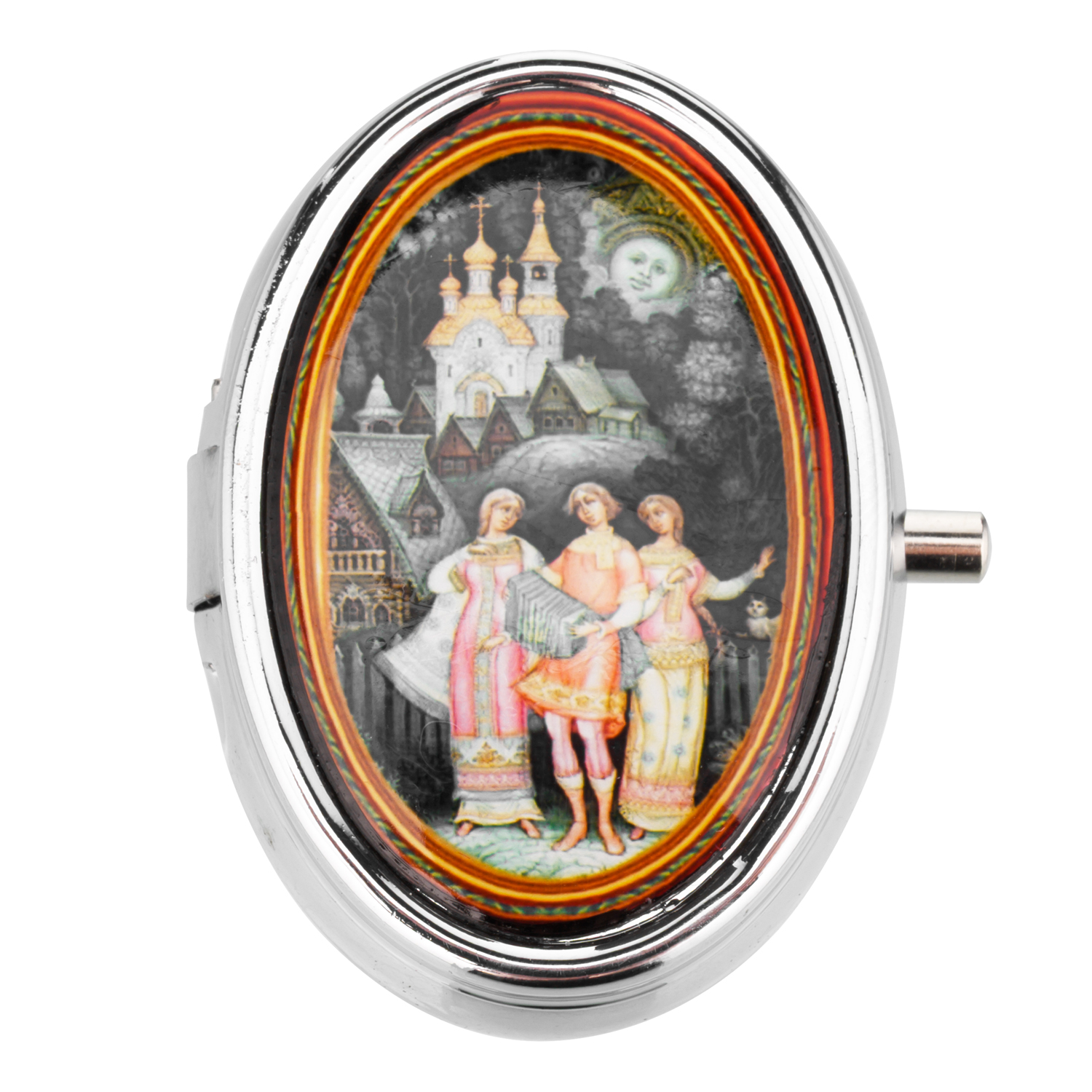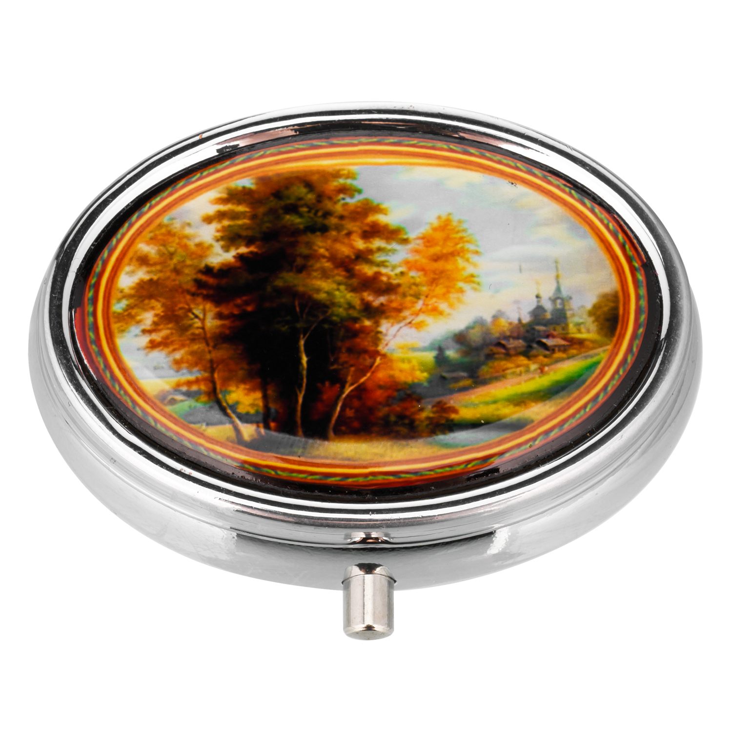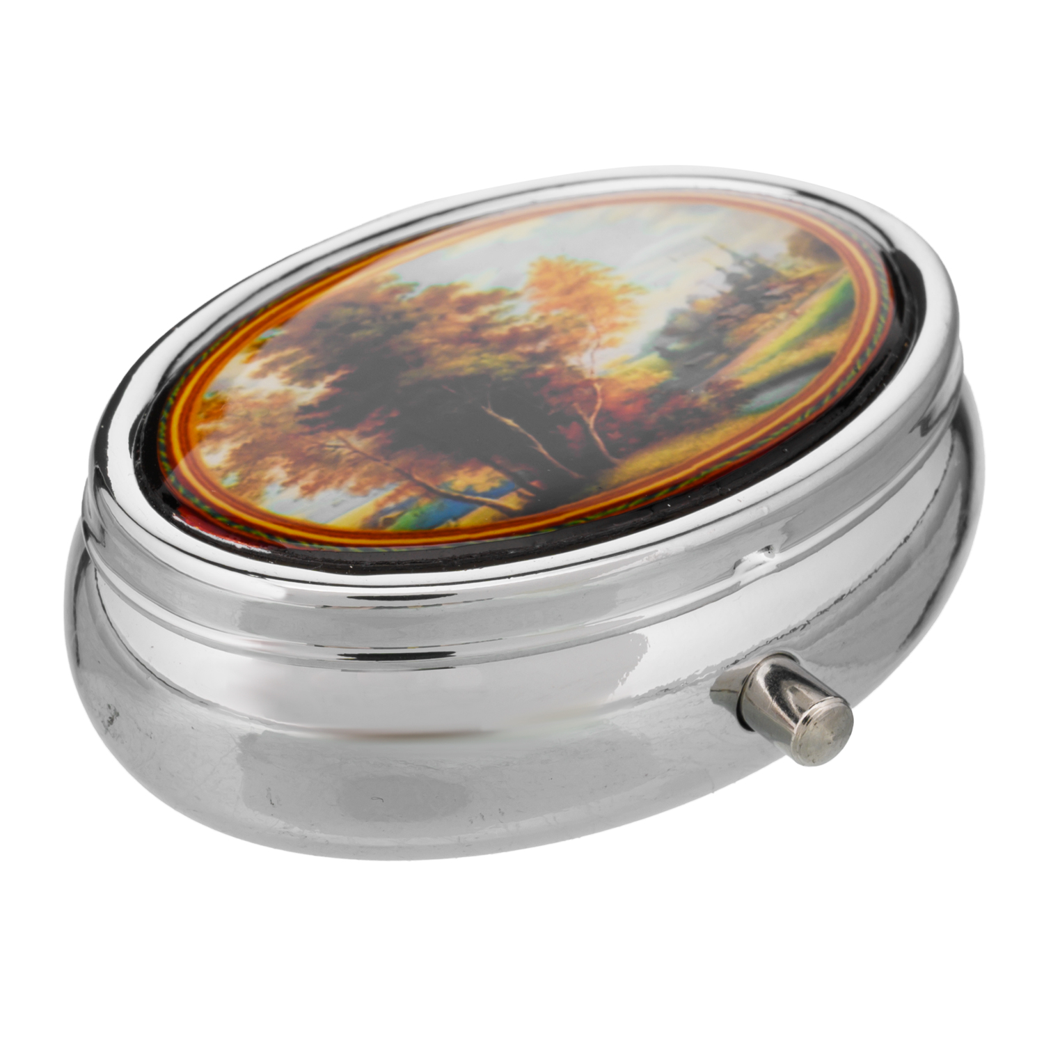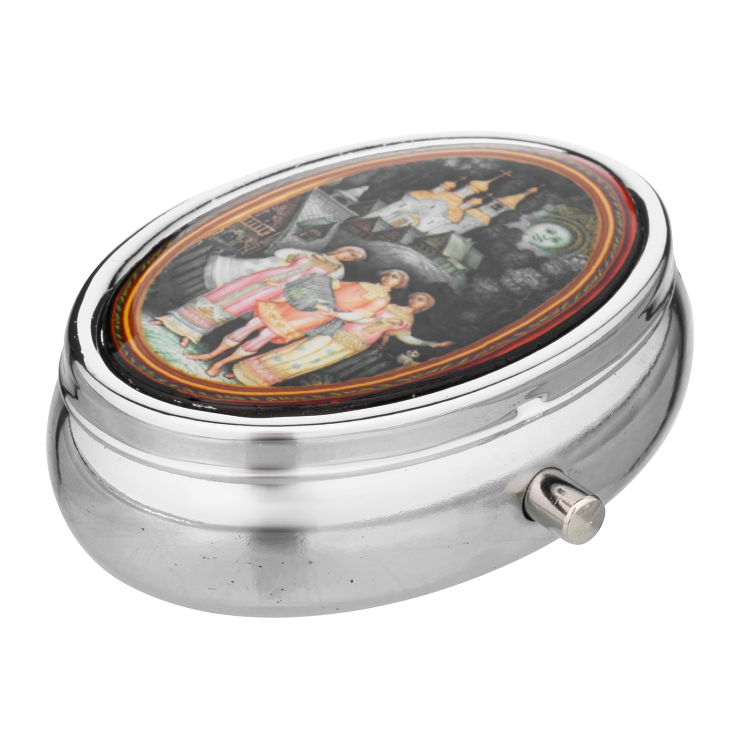 Таблетница карманная с разными сюжетами.Материалы: металл, пластик.