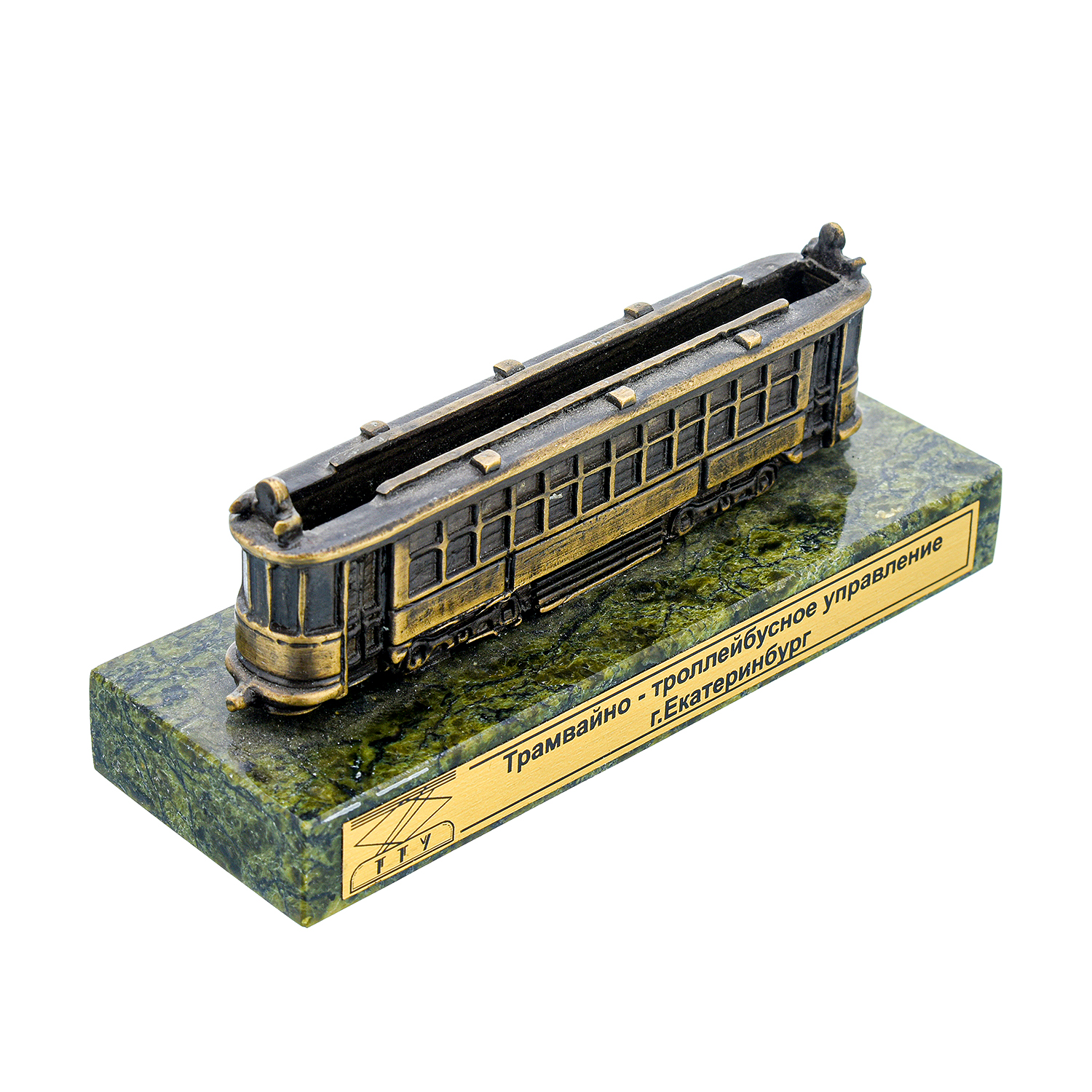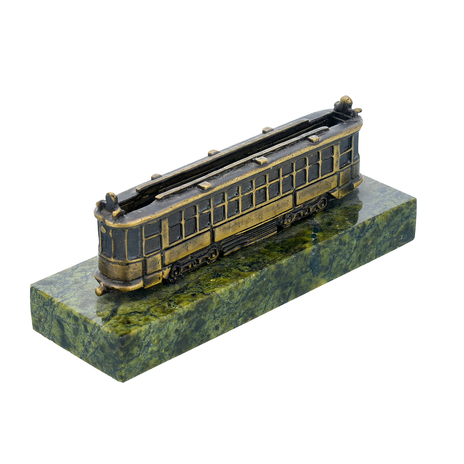Настольная визитница из бронзы и змеевика "Трамвайчик"