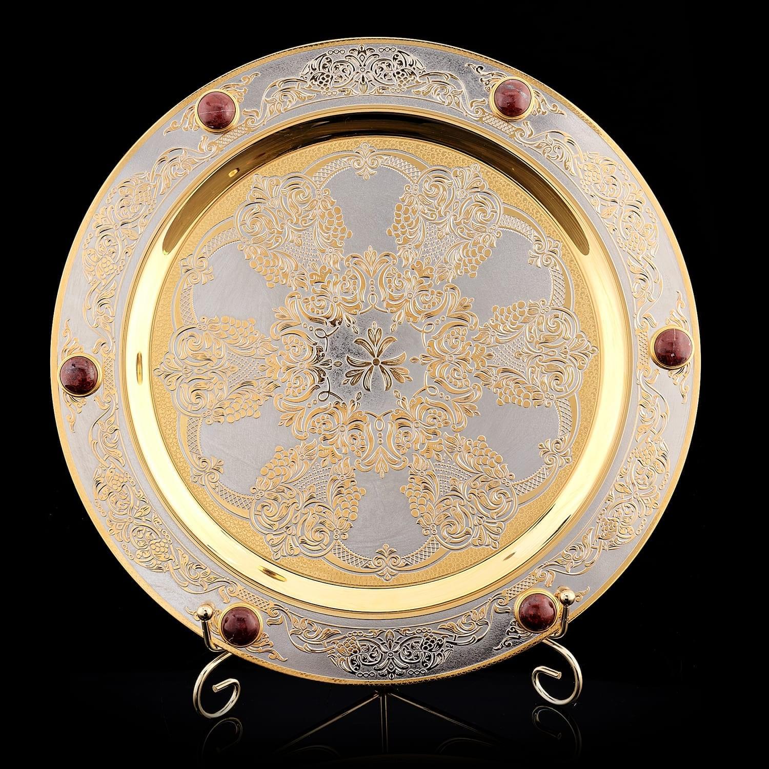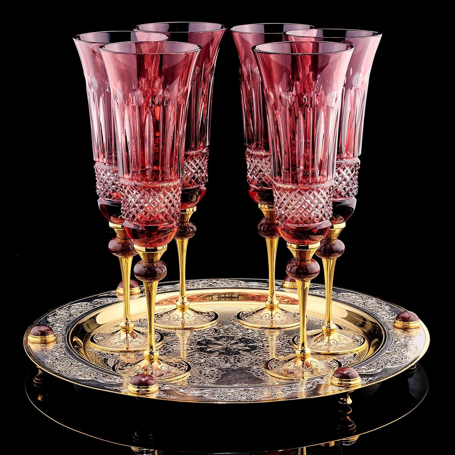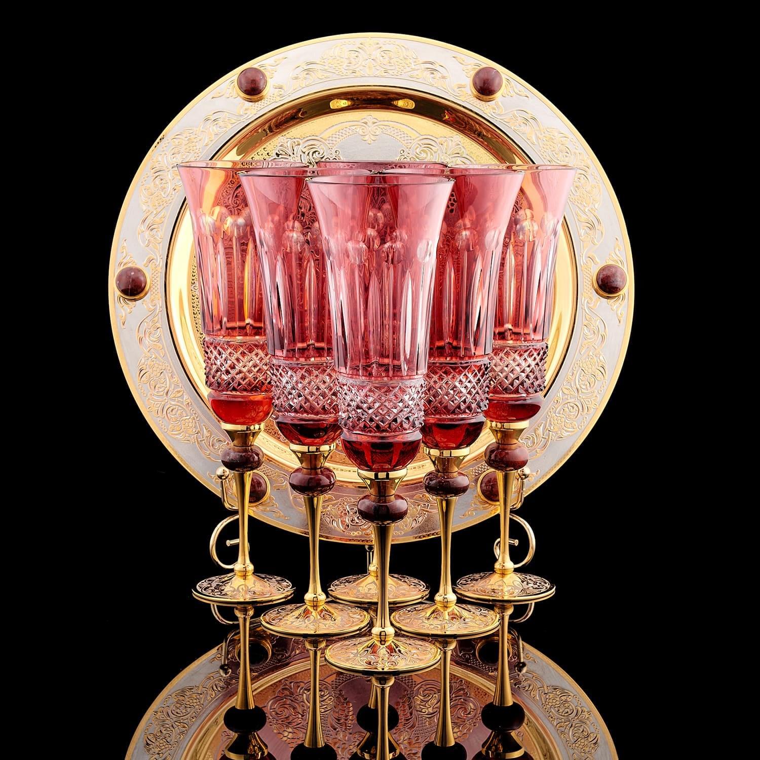 Замечательным подарком на свадьбу, годовщину или новоселье может стать эксклюзивный набор фужеров, созданный командой художников из уральского Златоуста. Набор включает в себя шесть великолепных фужеров из вишневого чешского стекла и округлое блюдо, украшенное Златоустовской гравюрой на металле. Каждый сантиметр блюда покрыт дивным рисунком. Особый шарм изделию придают вставки из яшмы. Роскошный питейный ансамбль - произведение искусства, не оставит равнодушным ценителя красивой, качественной дорогой посуды. Разнообразит интерьер, приятно удивит гостей. Техника исполнения: токарные работы, рисовка кистью, гравировка иглой по лаку, травление, гравировка резцом, полировка, никелирование, золочение. В изделии использовались традиционные методы обработки и украшения Златоустовской гравюры на металле. Размеры: высота бокала - 24 см. диаметр подноса - 32 см. ....Извините, товар отсутствует