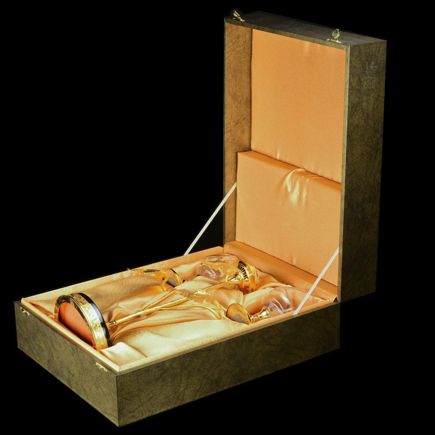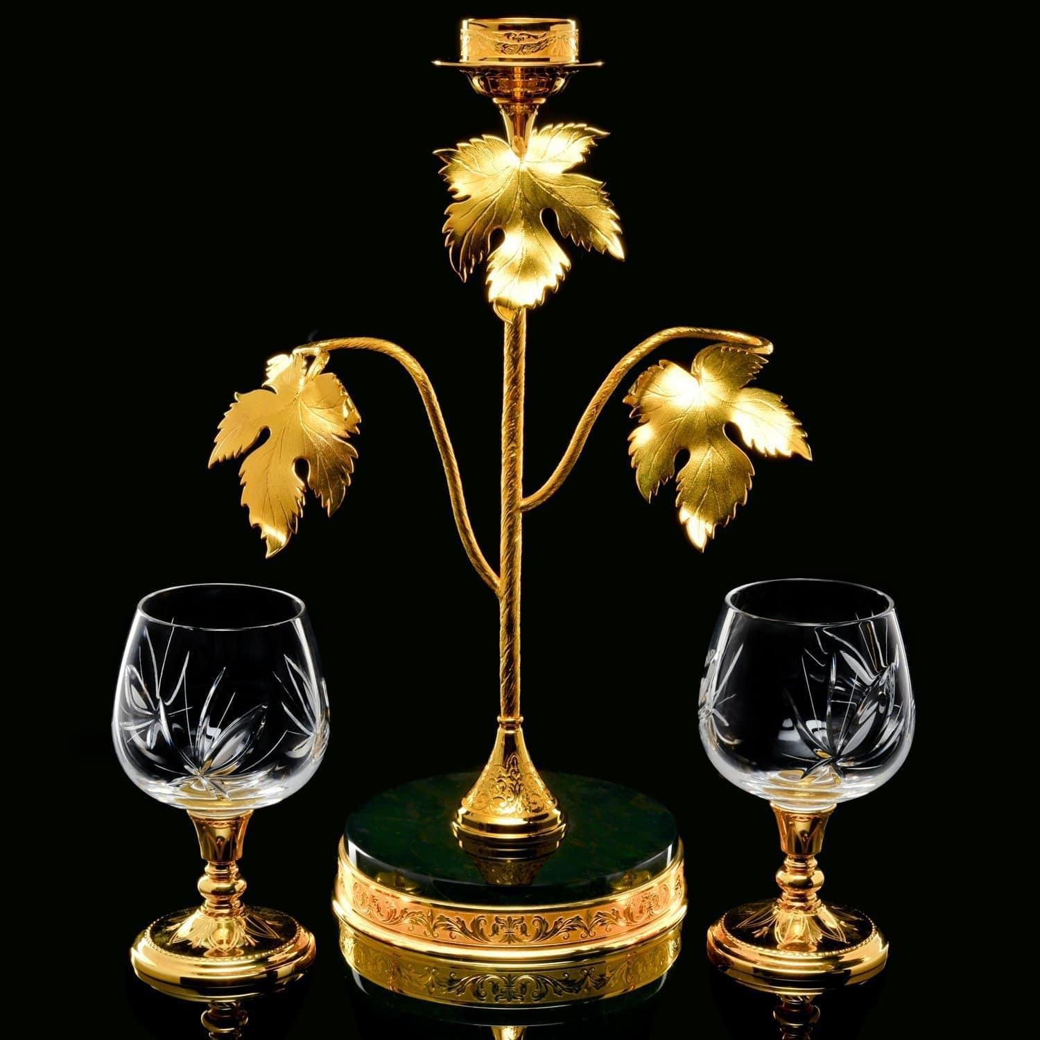 Набор из подсвечника и бокалов для коньяка декорированы христианским символом, виноградной лозой в качестве художественного лейтмотива. Виноградная лоза во всех культурах символизирует плодородие и изобилие. Лоза, увешанная кистями винограда, олицетворяет обильное здоровое потомство. радость созидания, укрепления семьи, продолжение рода. В Ветхом Завете (Псалтыри) написано: «Жена твоя, как плодовитая лоза, в доме твоем». Ухоженный заботливыми руками человека виноградник означает мир и благополучие. Наши предки, имевшие дом и надел плодородной земли, считали себя обеспеченными и благополучными. Но из-за регулярных войн люди теряли имущество, а многие становились вынужденно рабами. В связи с этим фраза «каждый будет сидеть под своею виноградною лозою» стала обозначать символ мира. Техника исполнения: токарные работы, рисовка кистью, гравировка иглой по лаку, травление, гравировка резцом, полировка, никелирование, золочение. В изделии использовались традиционные методы обработки и украшения Златоустовской гравюры на металле. ....