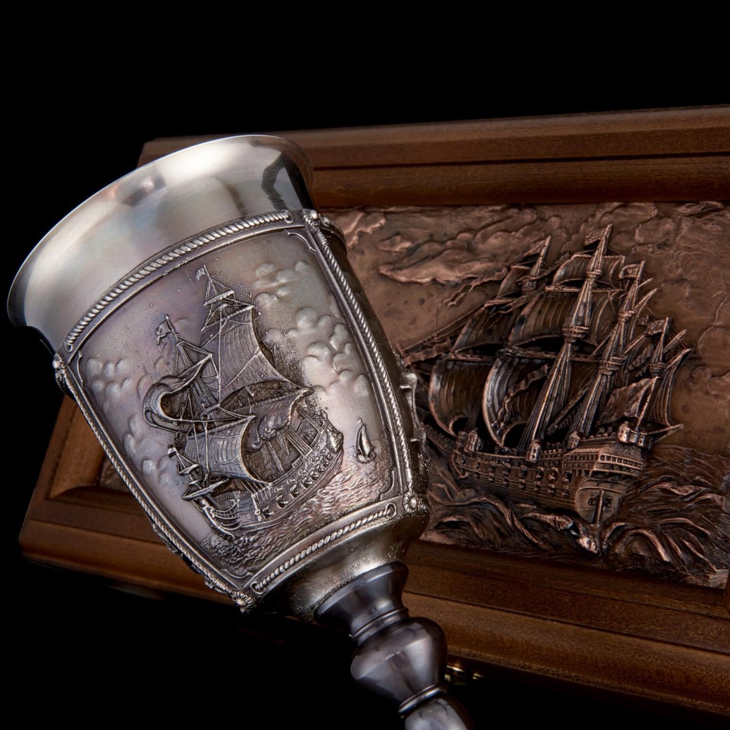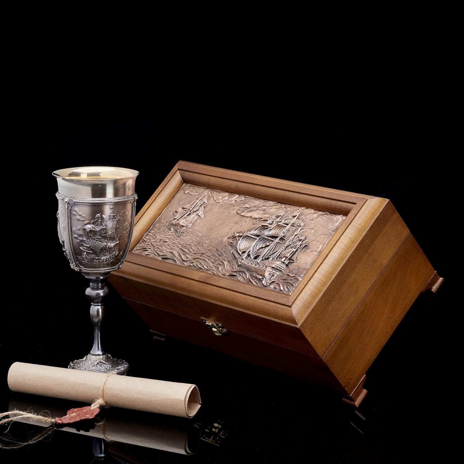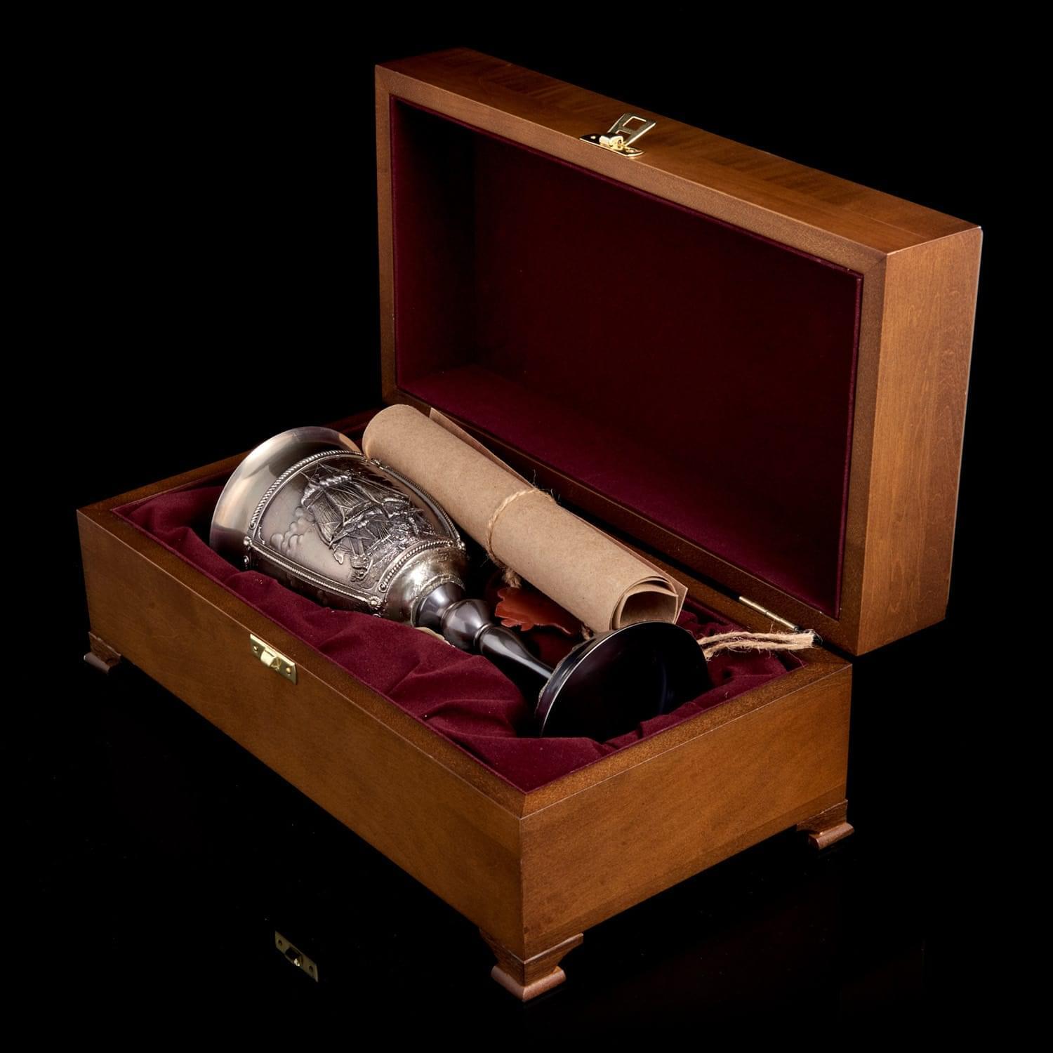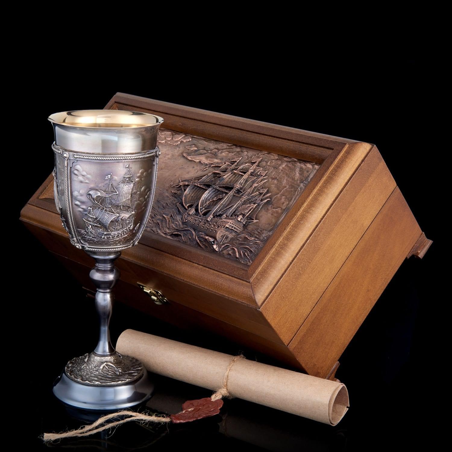 Фрегат - тот самый парусник, который ищет бури, "как будто в бурях есть покой". Победный кубок с изображением фрегата в шкатулке из дуба, украшенной литой накладкой с парой фрегатов, - это традиционный вариант мужского подарка на удачу, подчеркивающего статус, для коллеги, партнера по бизнесу, руководителя. Со времен Средневековья кубок считается символом победы и удачи.Как полагал русский царь Иван Васильевич, из красивого сосуда ручной работы можно пить не пьянея.
