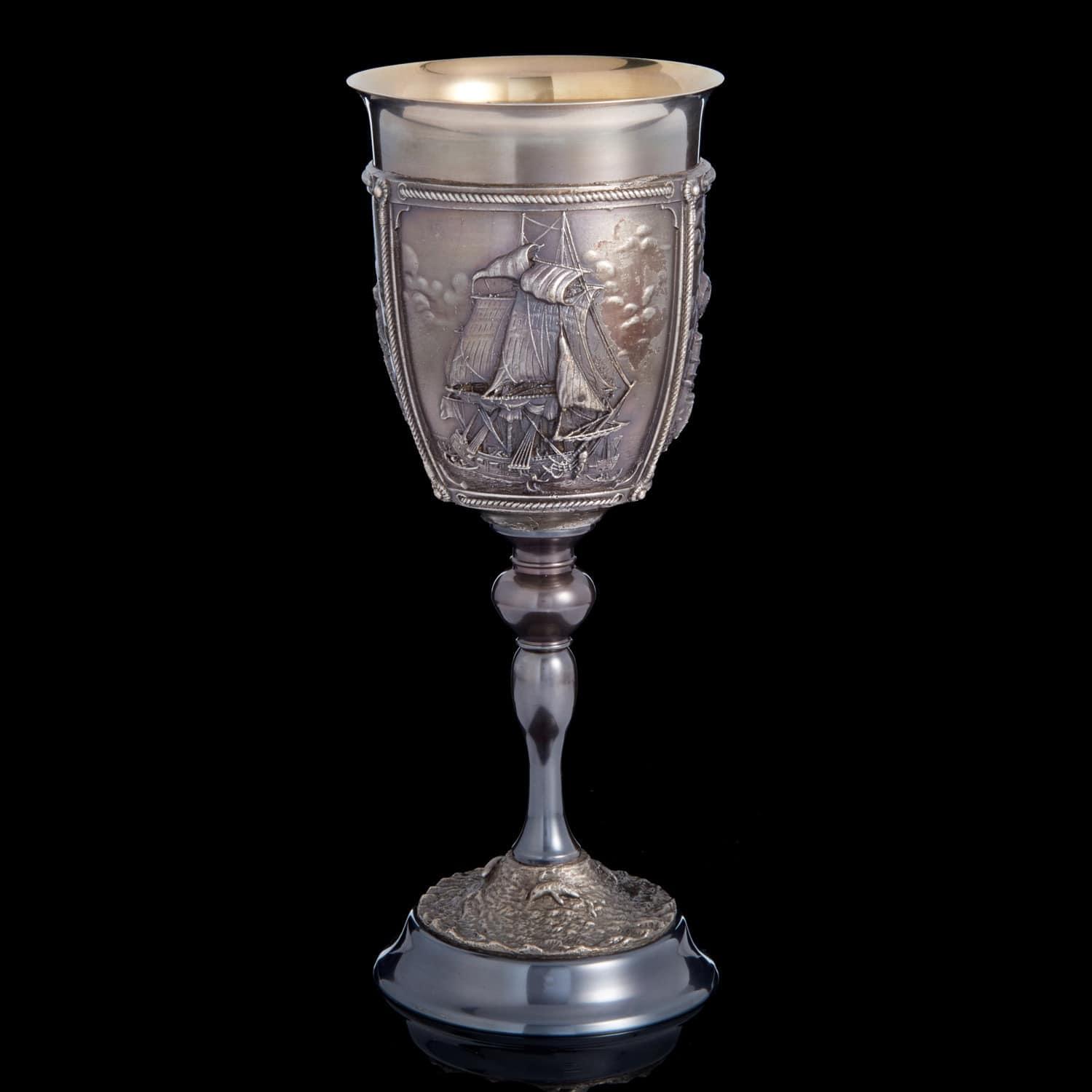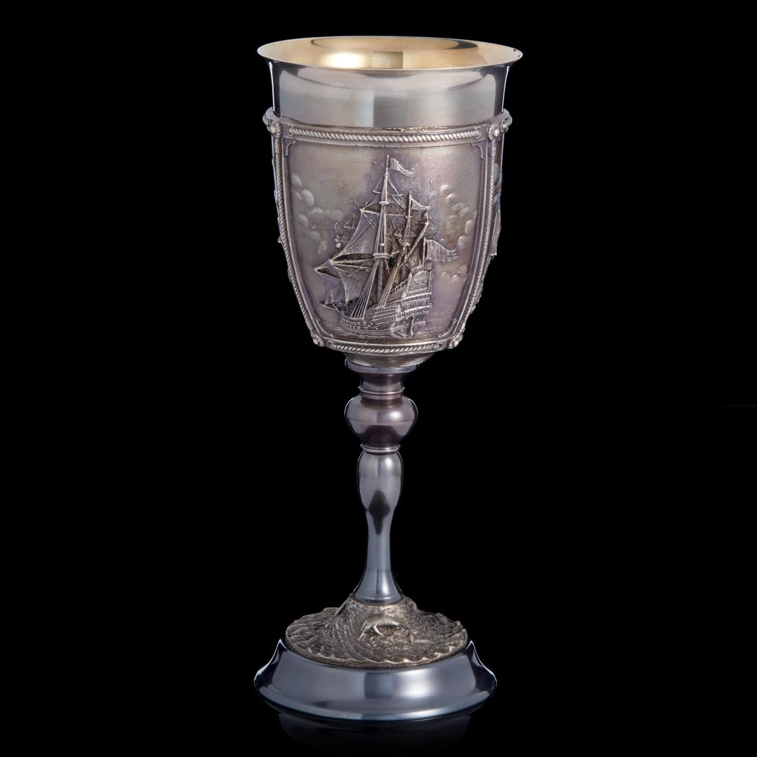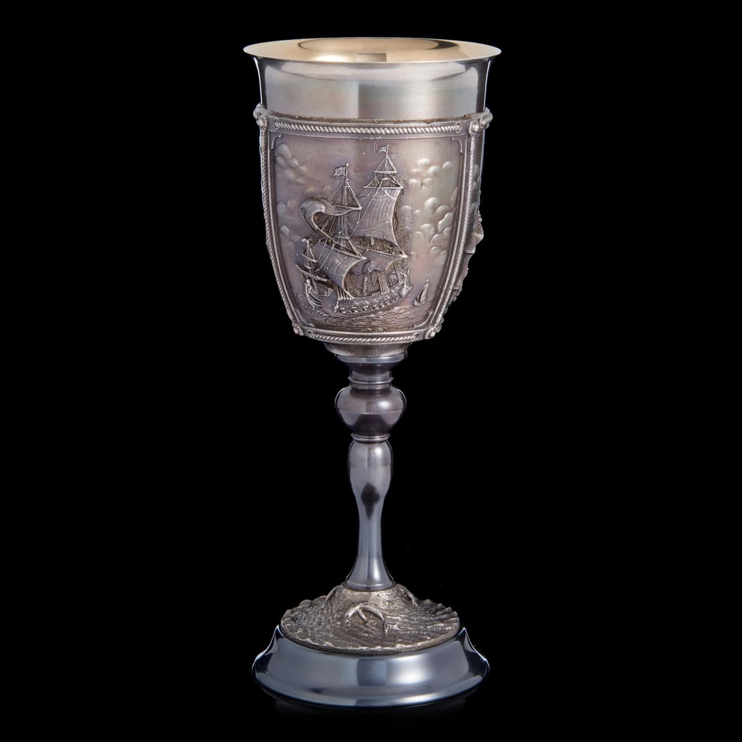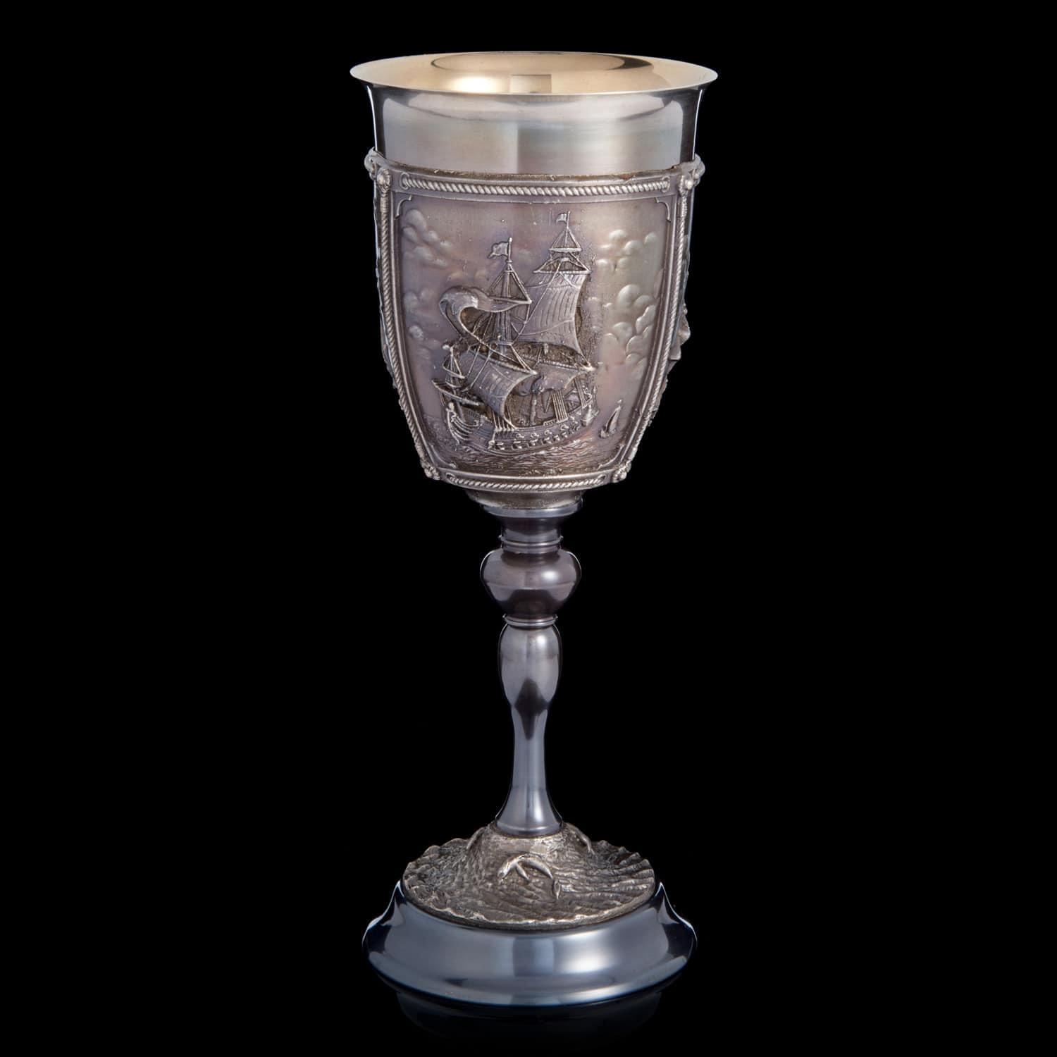 Фрегат - тот самый парусник, который ищет бури, "как будто в бурях есть покой". Победный кубок с изображением фрегата в шкатулке из дуба, украшенной литой накладкой с парой фрегатов, - это традиционный вариант мужского подарка на удачу, подчеркивающего статус, для коллеги, партнера по бизнесу, руководителя. Со времен Средневековья кубок считается символом победы и удачи.Как полагал русский царь Иван Васильевич, из красивого сосуда ручной работы можно пить не пьянея.