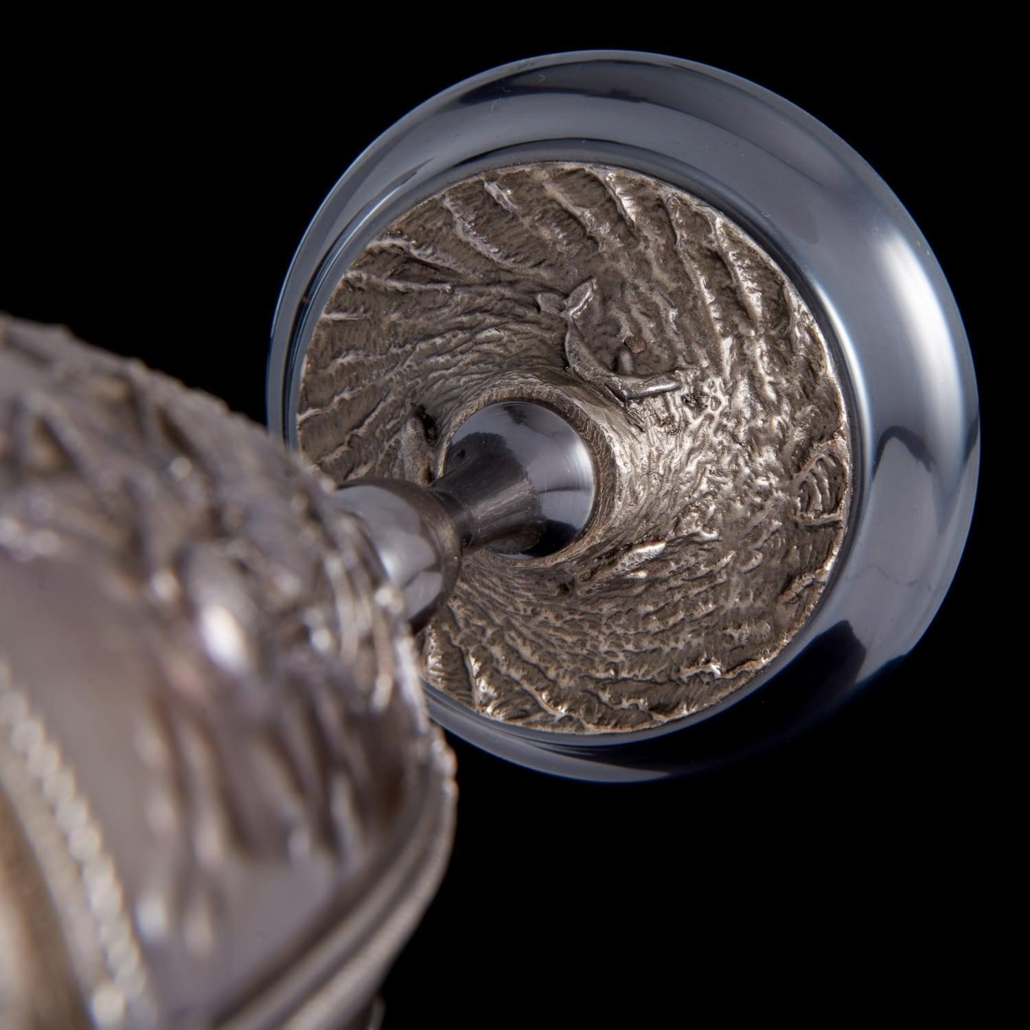 Корпус кубка отлит из металлического медного сплава - латуни, который издавна используется художниками по металлу для создания роскошных элементов декора и предметов обихода. Литье выполнено по авторскому эскизу. Корпус оформлен никелевым покрытием (снаружи) и позолотой (изнутри).