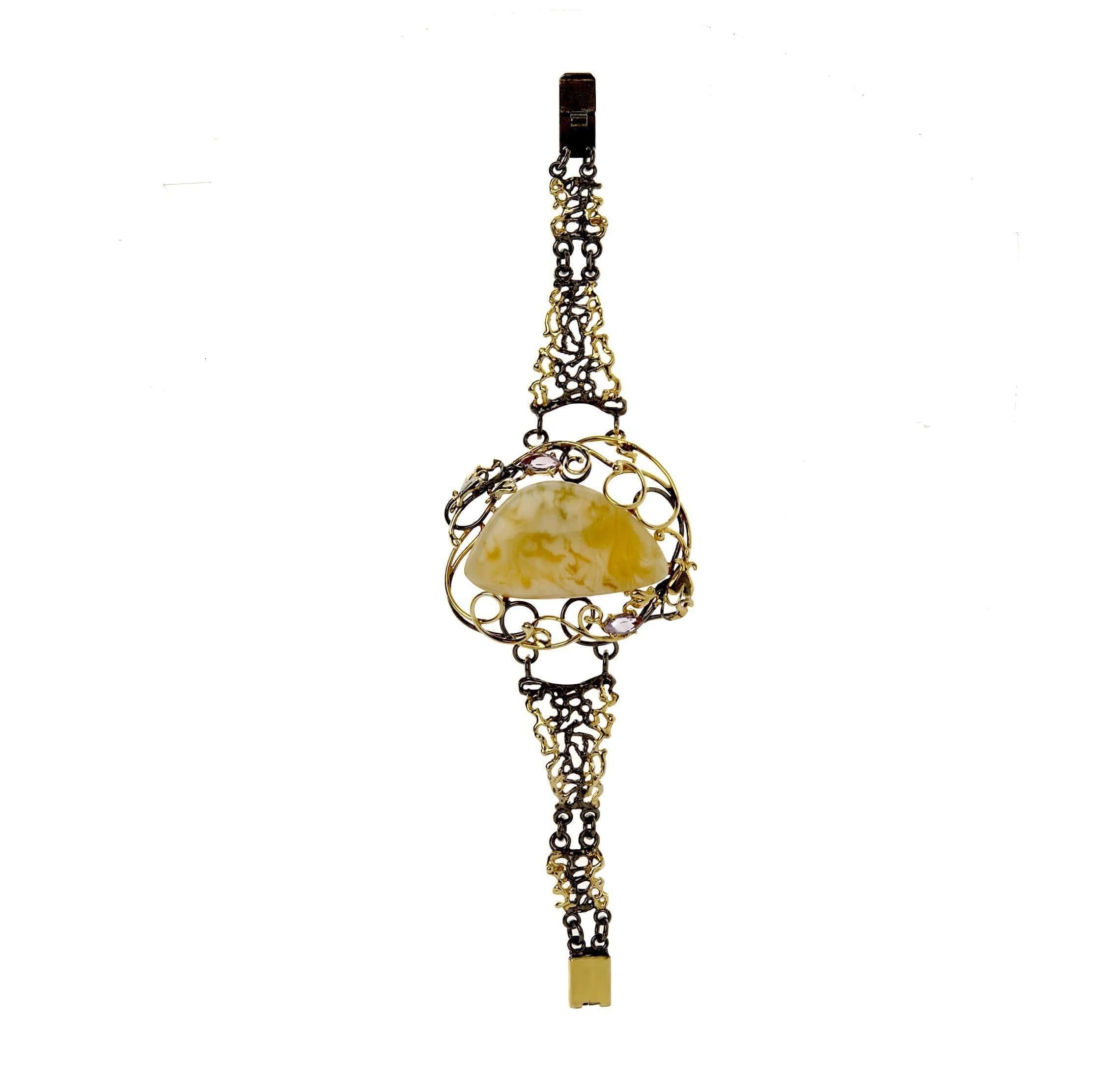 Крупное дизайнерское украшение рано или поздно становится мечтой каждой женщины. Особые ощущения прилива сил и заряд энергии Вы ощутите при ношении дизайнерского украшения для запястья. Браслет в ажурной серебряной оправе с ремешком представляет чудесную импровизацию российского ювелира. Это украшение с солнечным янтарем создано для почитательниц классического стиля. Янтарь охлаждает тело в жару и согревает в холод. Соприкасаясь с кожей, янтарь дарит телу прилив сил и заряд бодрости благодаря энергии стихий, земли, воды и солнца, накопленной в камне за 40-150 тысяч лет его формирования. Он может содержать мельчайшие пузырики: внутри них, согласно древним преданиям, живут духи, оберегающие обладателя камня. Янтарь связан с планетой любви Венера. От природы он наделен магическими и целебными свойствами: усиливает интуицию, дает женщине новое ощущение себя, корректирует репродуктивную системы организма и служит талисманом.