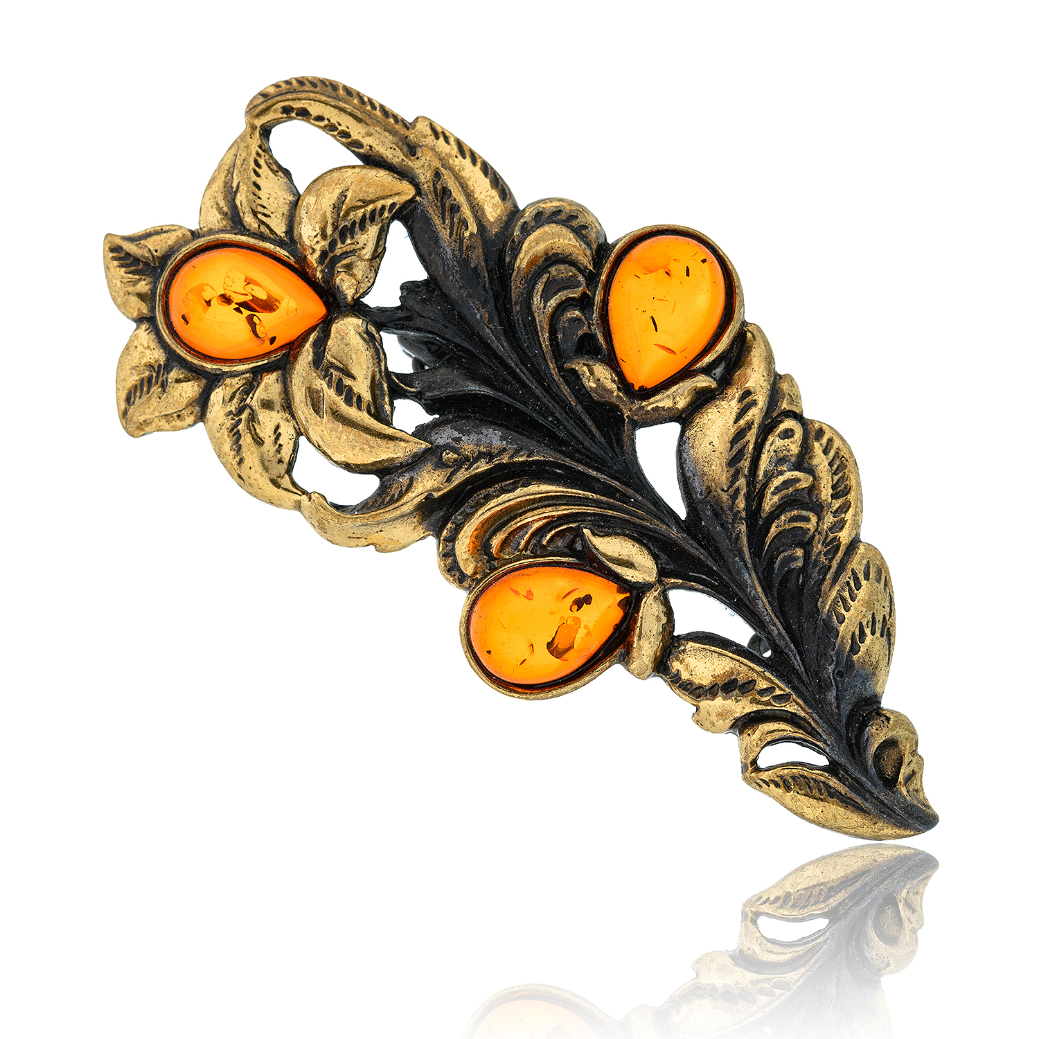 Брошь с янтарем "Букет лилий".Материалы: латунь, янтарь.