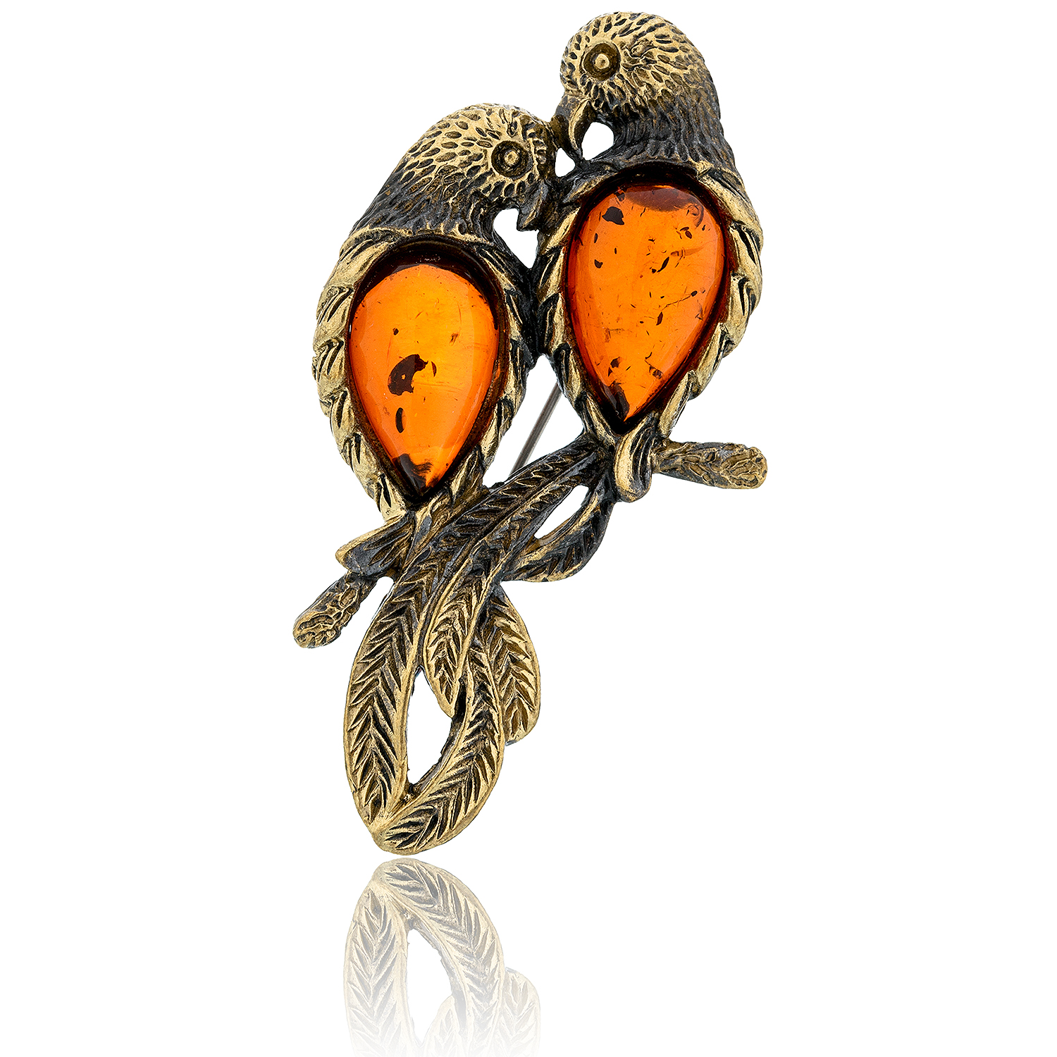 Брошь с янтарем "Попугайчики Неразлучники".Материалы: бронза, янтарь.