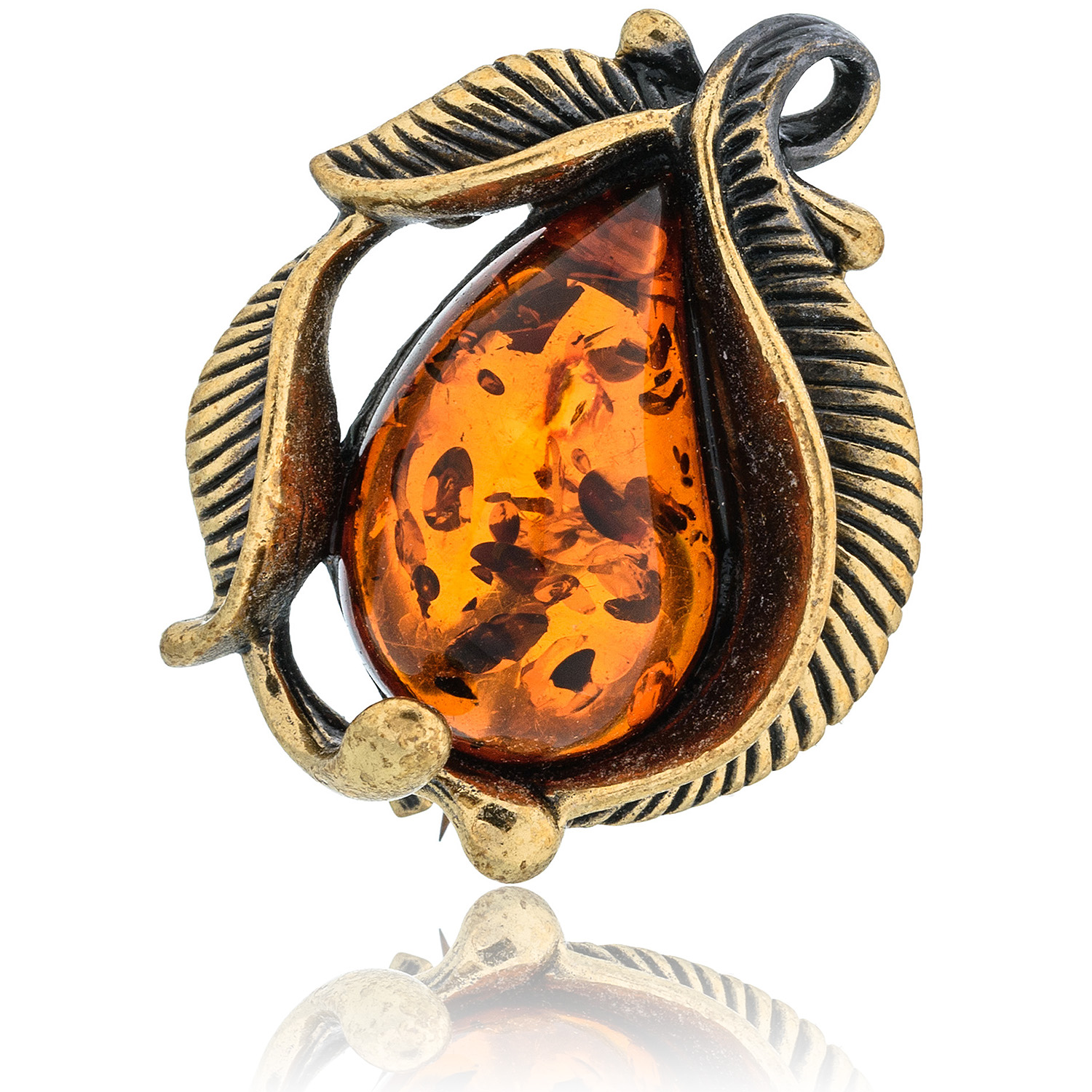 Брошь с янтарем "Винтажный листик" (коньячный)