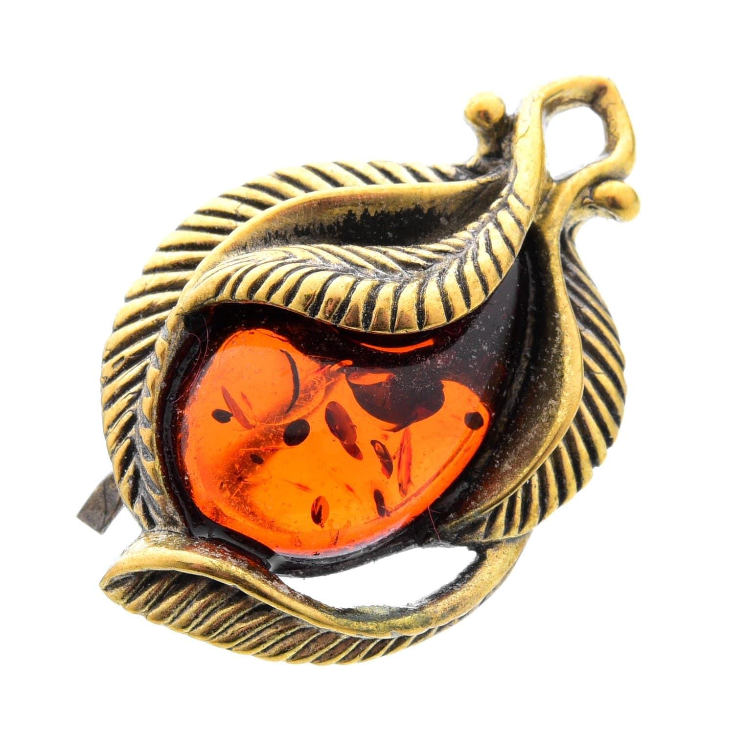 Брошь с янтарем "Винтажный листик 5". Коньячный