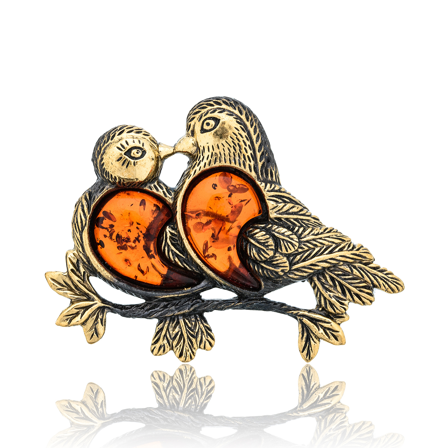 Брошь с янтарем "Влюбленные голубки"
