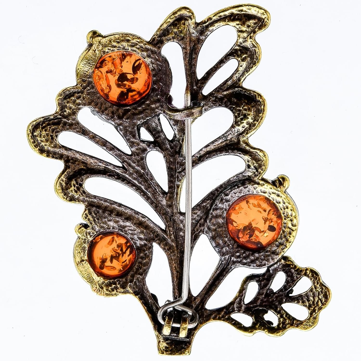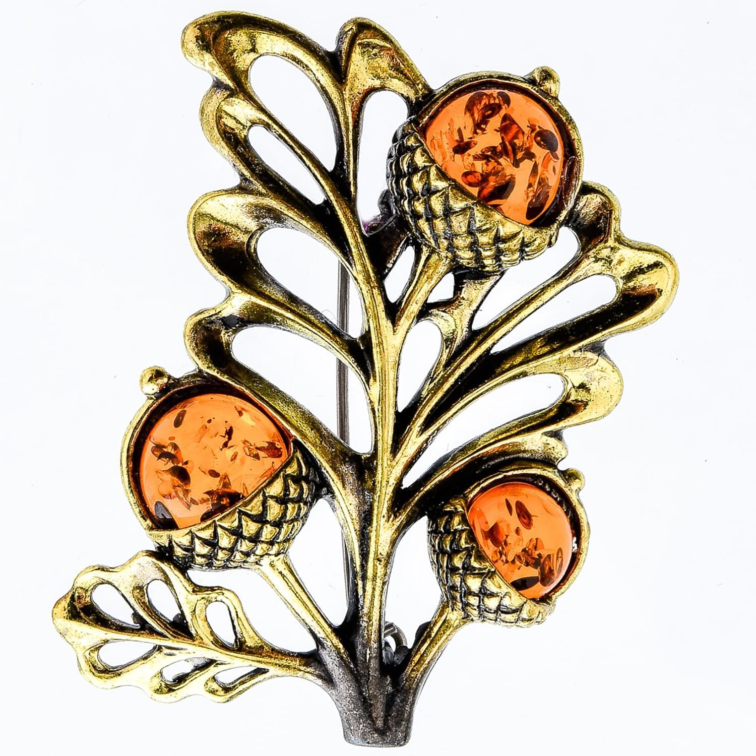 Брошь с янтарем "Веточка. Желуди". Коньячный