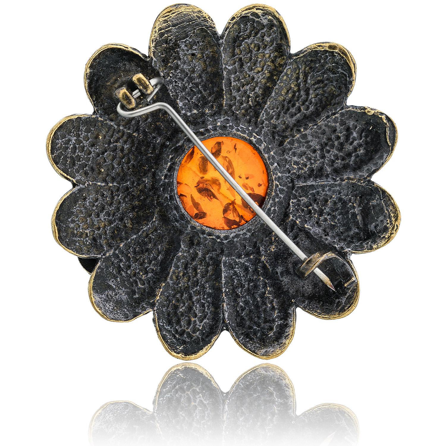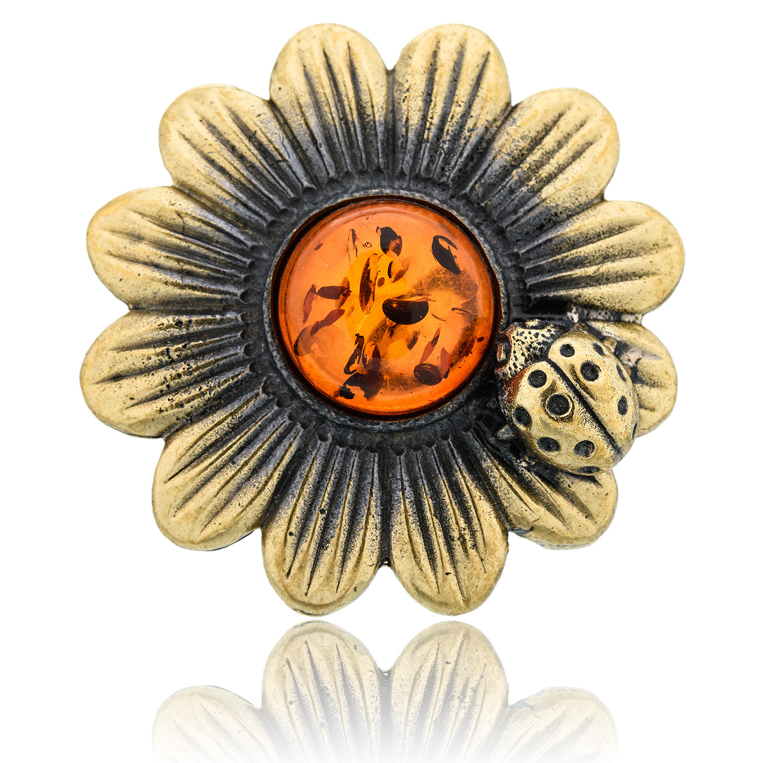 Русские подарки и сувениры → Украшения → Броши → Брошь с янтарем "Ромашка с божьей коровкой" (коньячный)