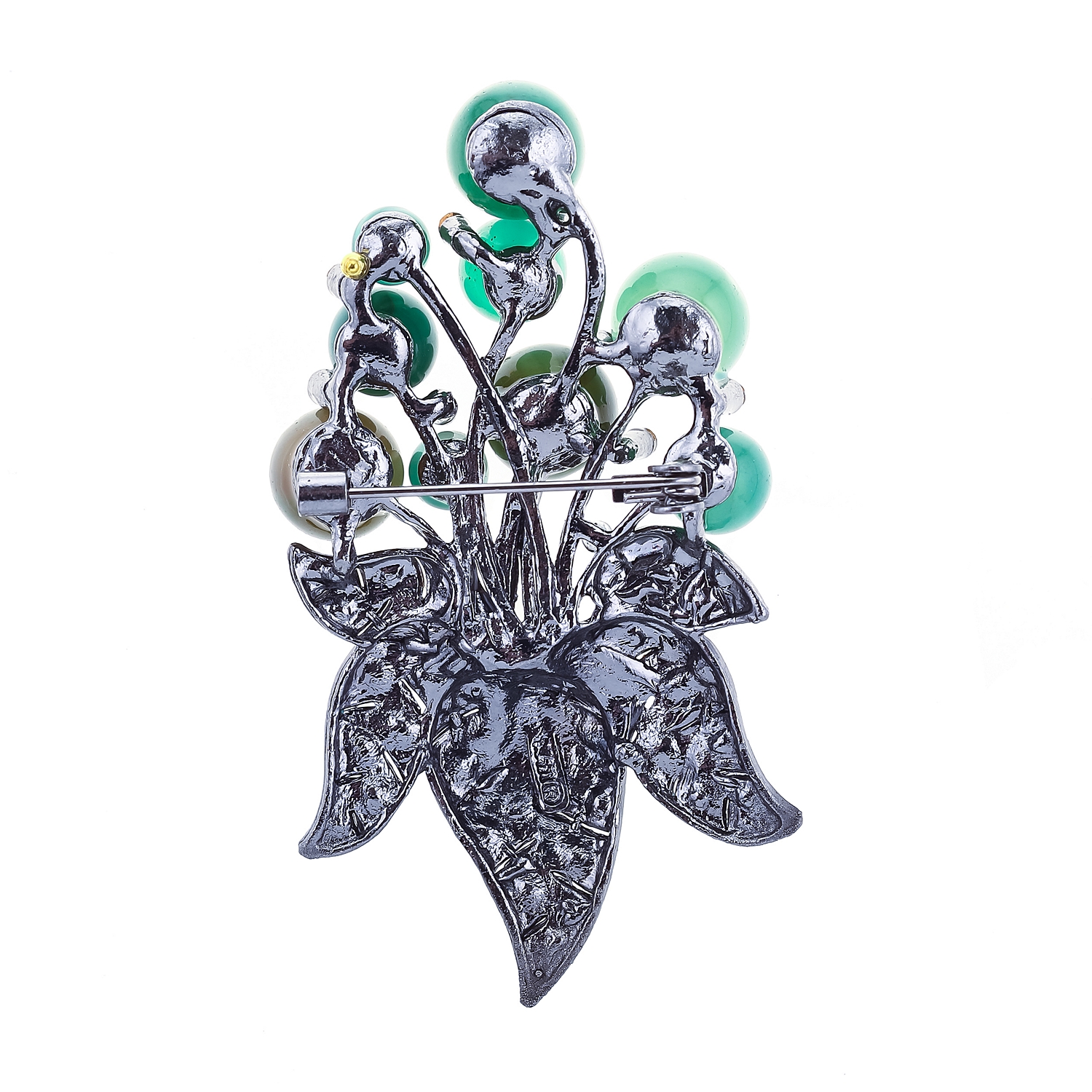 Металлическая брошь с хризопразом и стразами.