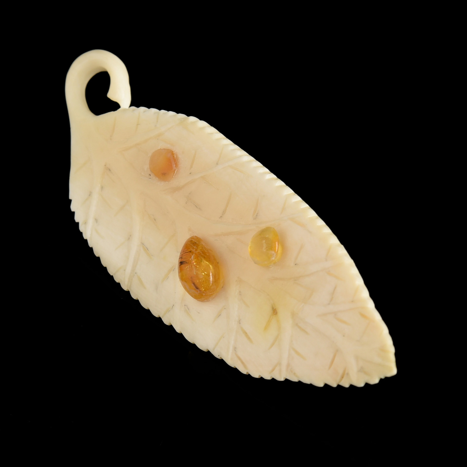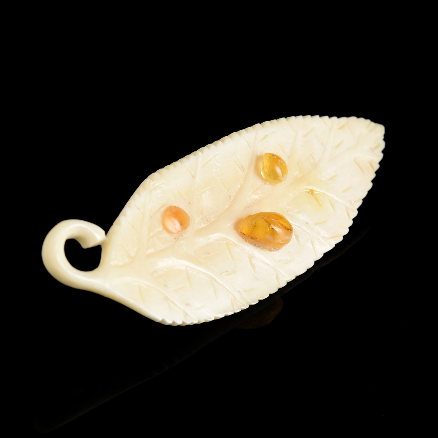 Брошь из бивня мамонта "Ивовый листок".Материалы: бивень мамонта, янтарь.