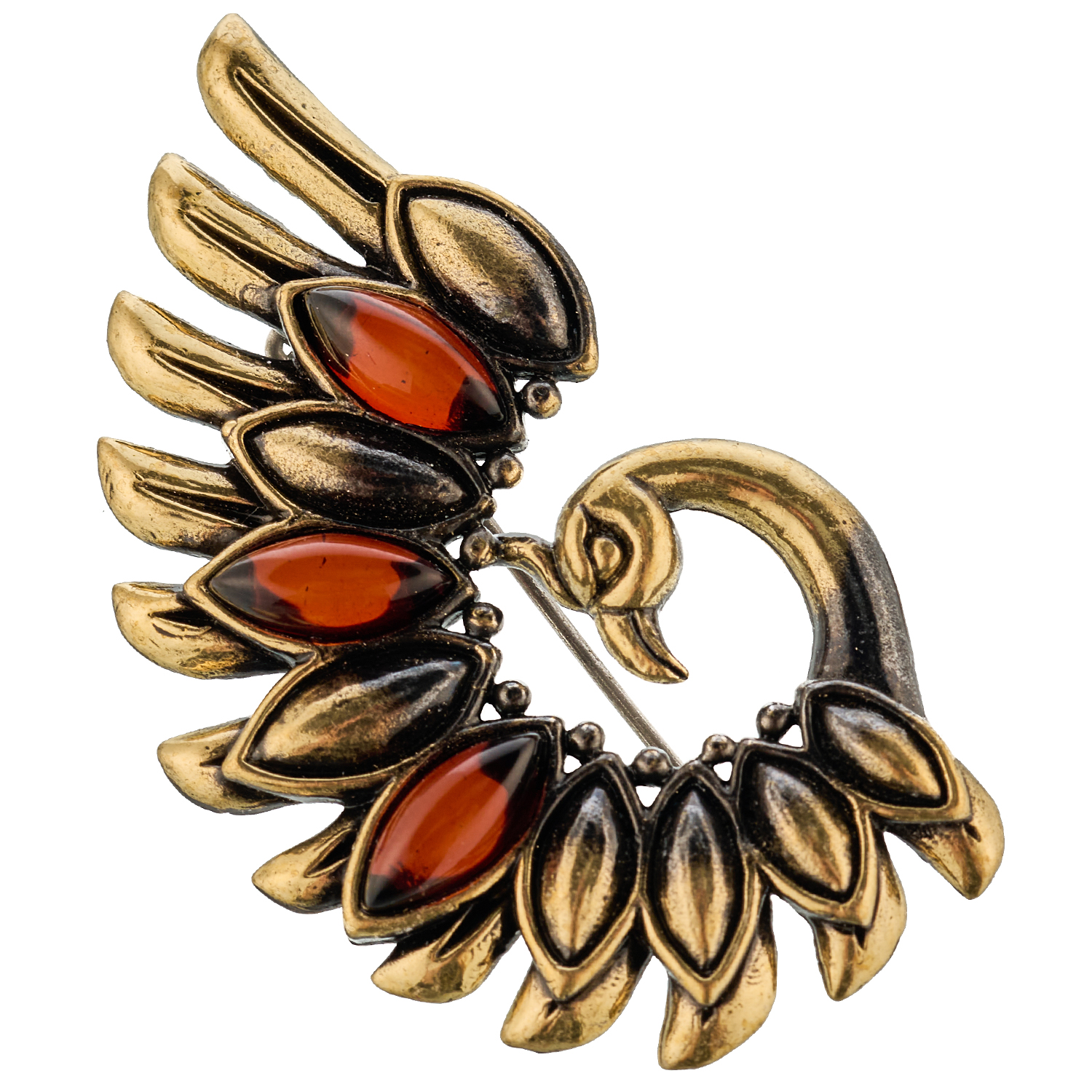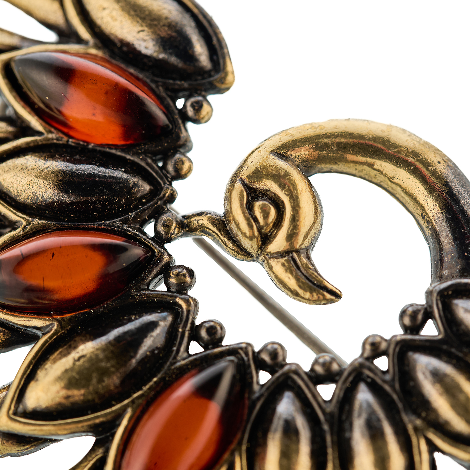 Брошь с янтарем "Королевский павлин".Материалы: бронза, янтарь.