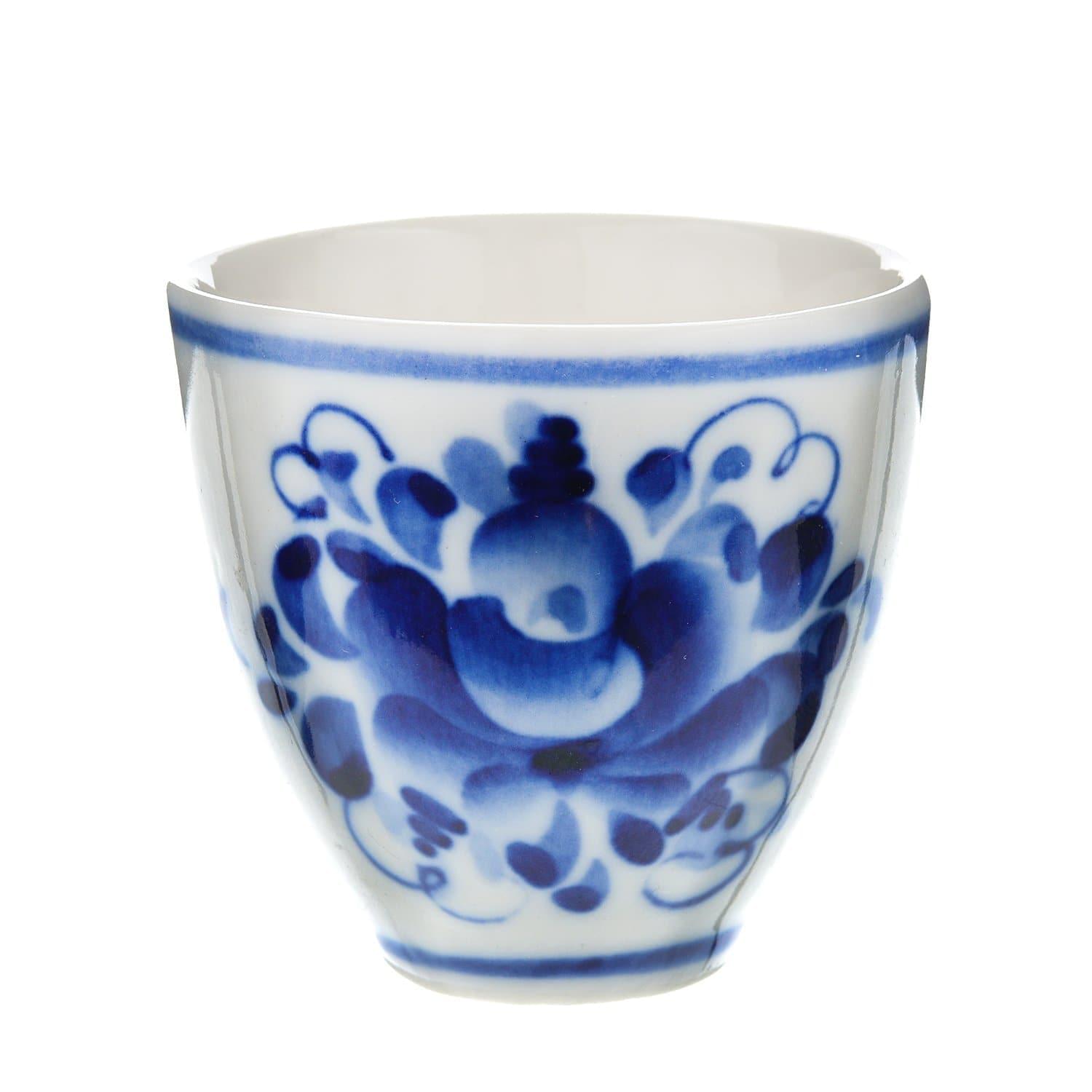 Образец посуды представляет собой штучный образец гжельского промысла, процветающего на территории двух бывших губерний, Бронницкой и Богородской. Корпус бокальчика для вина изготовлен гжельским мастером, обладающим навыками гончара и художника рисовальщика. Он оформлен из высококачественной подмосковной глины белого сорта. Корпус расписан традиционной краской гжельских мастеров, окисью кобальта, которая после нескольких обжигов в печи приобретает синий цвет с более чем 40 его оттенками. Поверхность с росписью покрыта защитными слоями прозрачной стеклянной глазури, поверх которой тонкой кистью выполнен декор позолотой. Материал: фарфор. Авторская работа. Роспись Гжель. Размеры: 6х6 см. ....