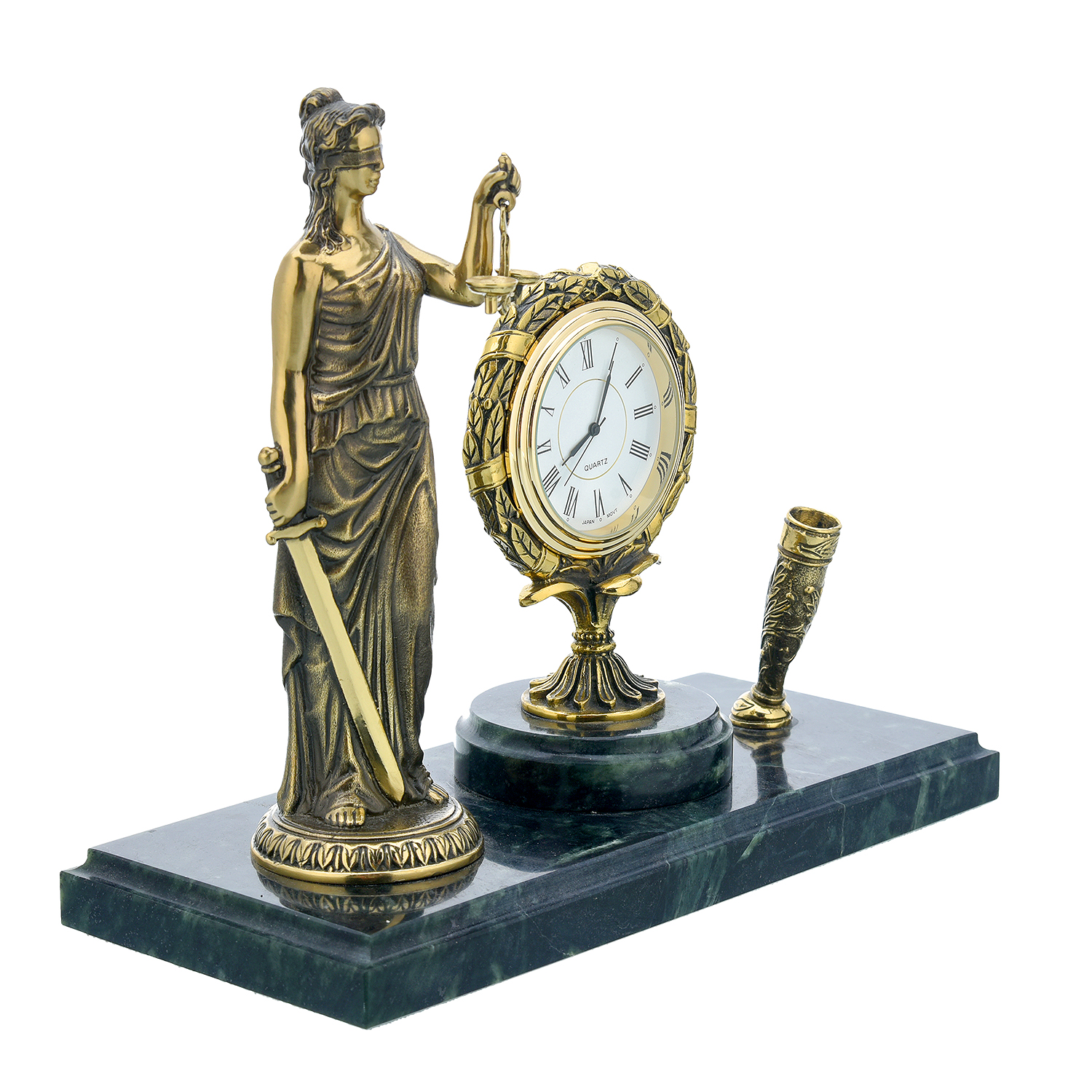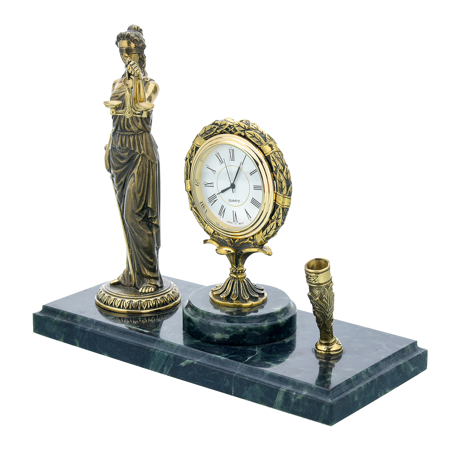 Настольные часы из змеевика с подставкой для ручки "Фемида"