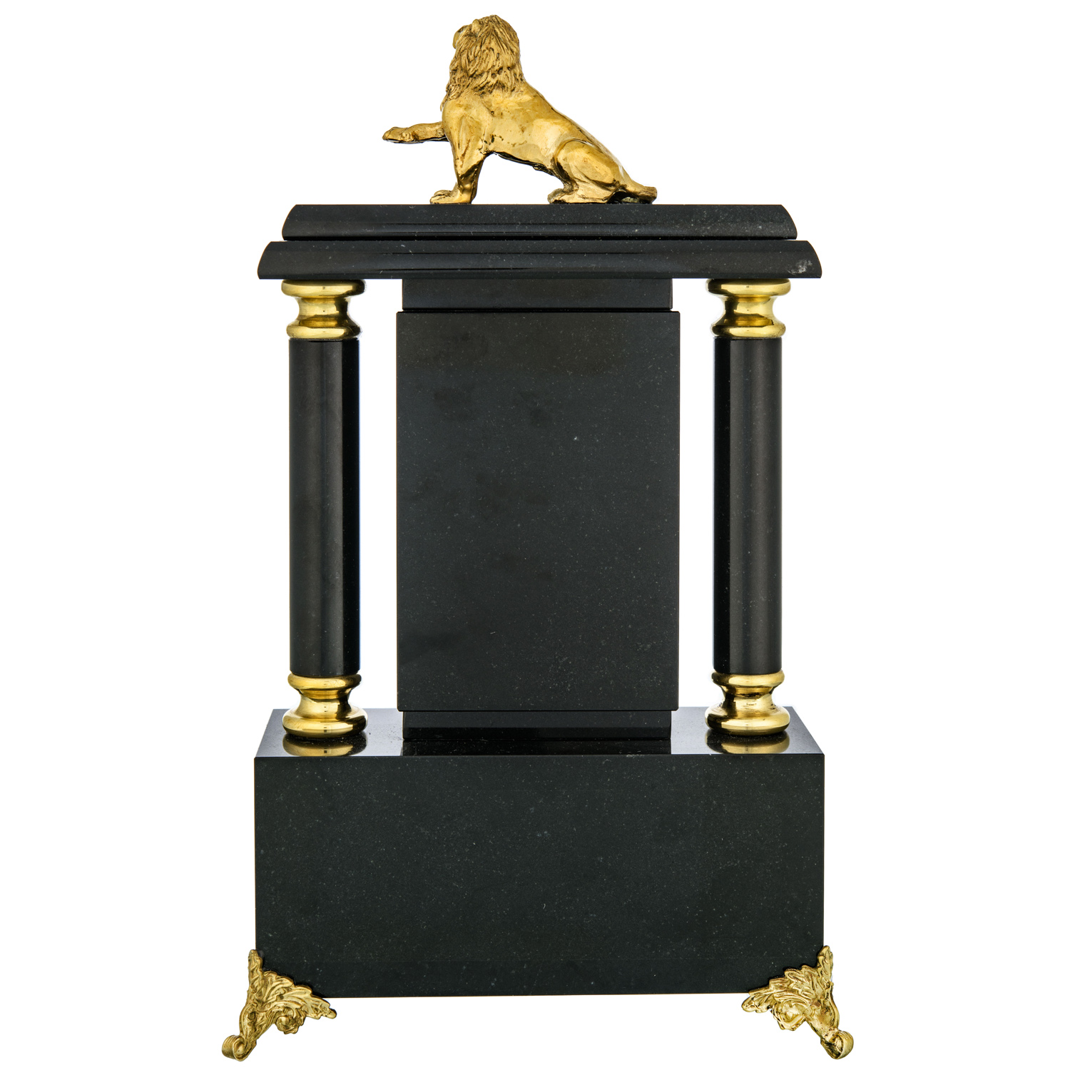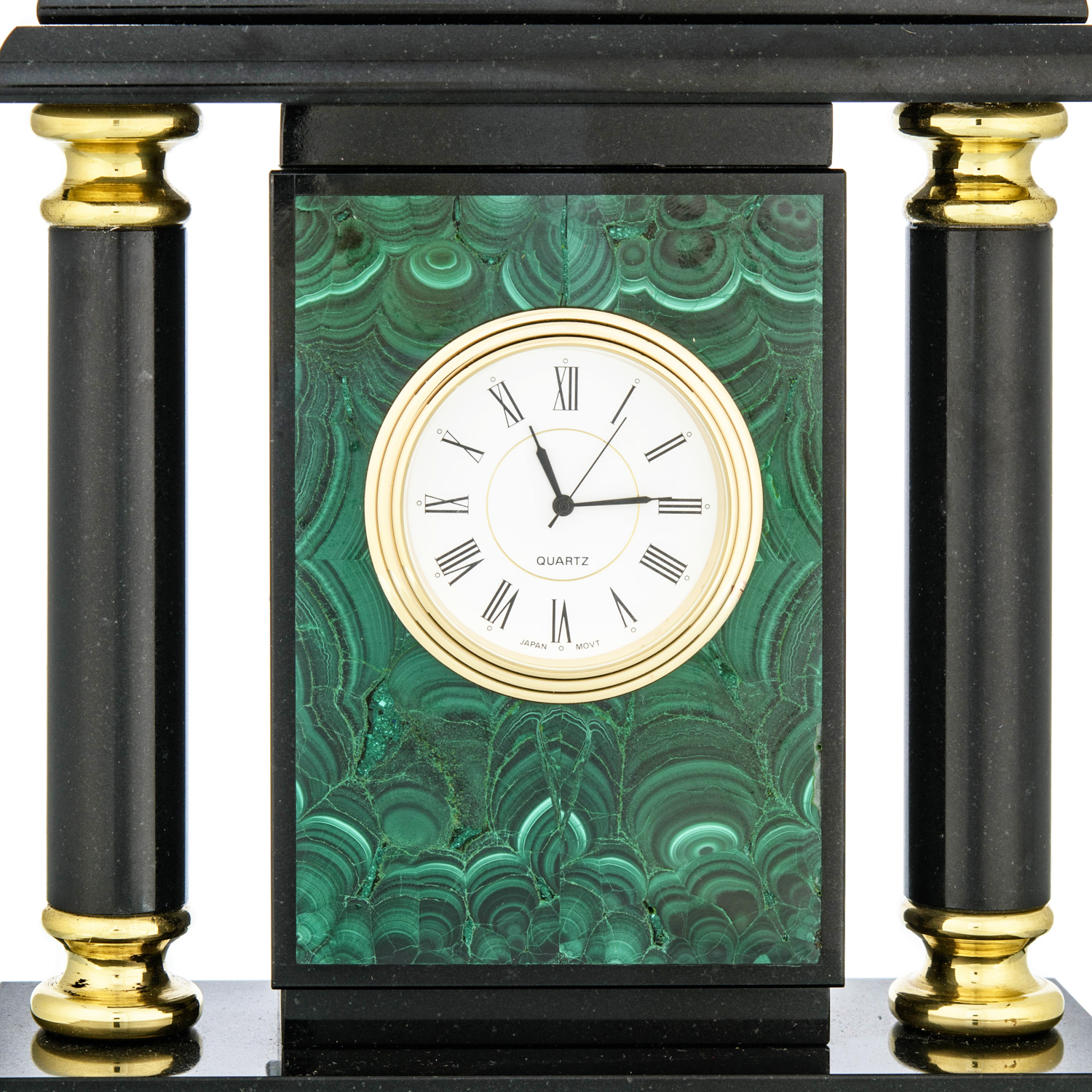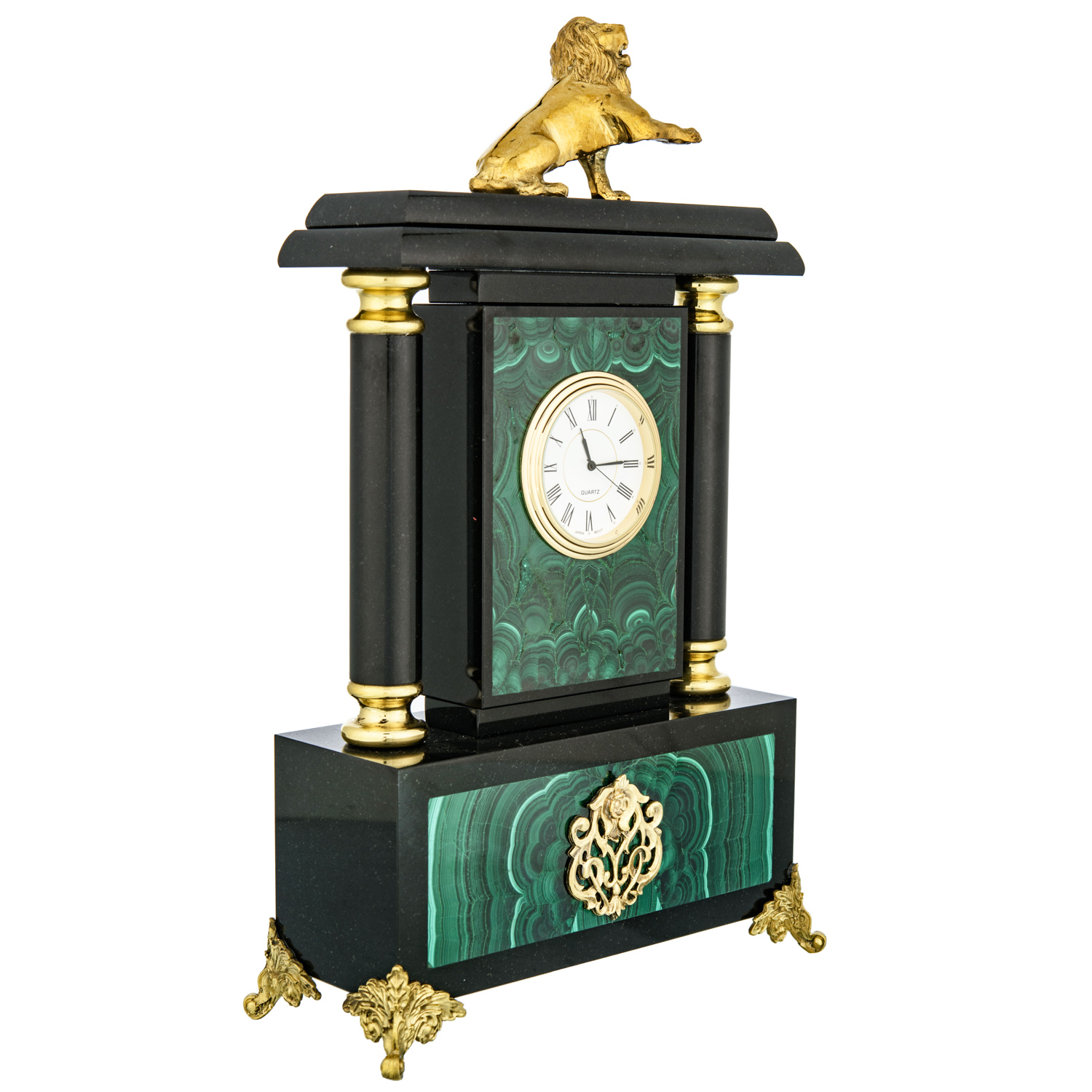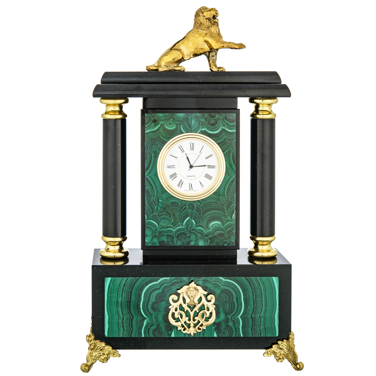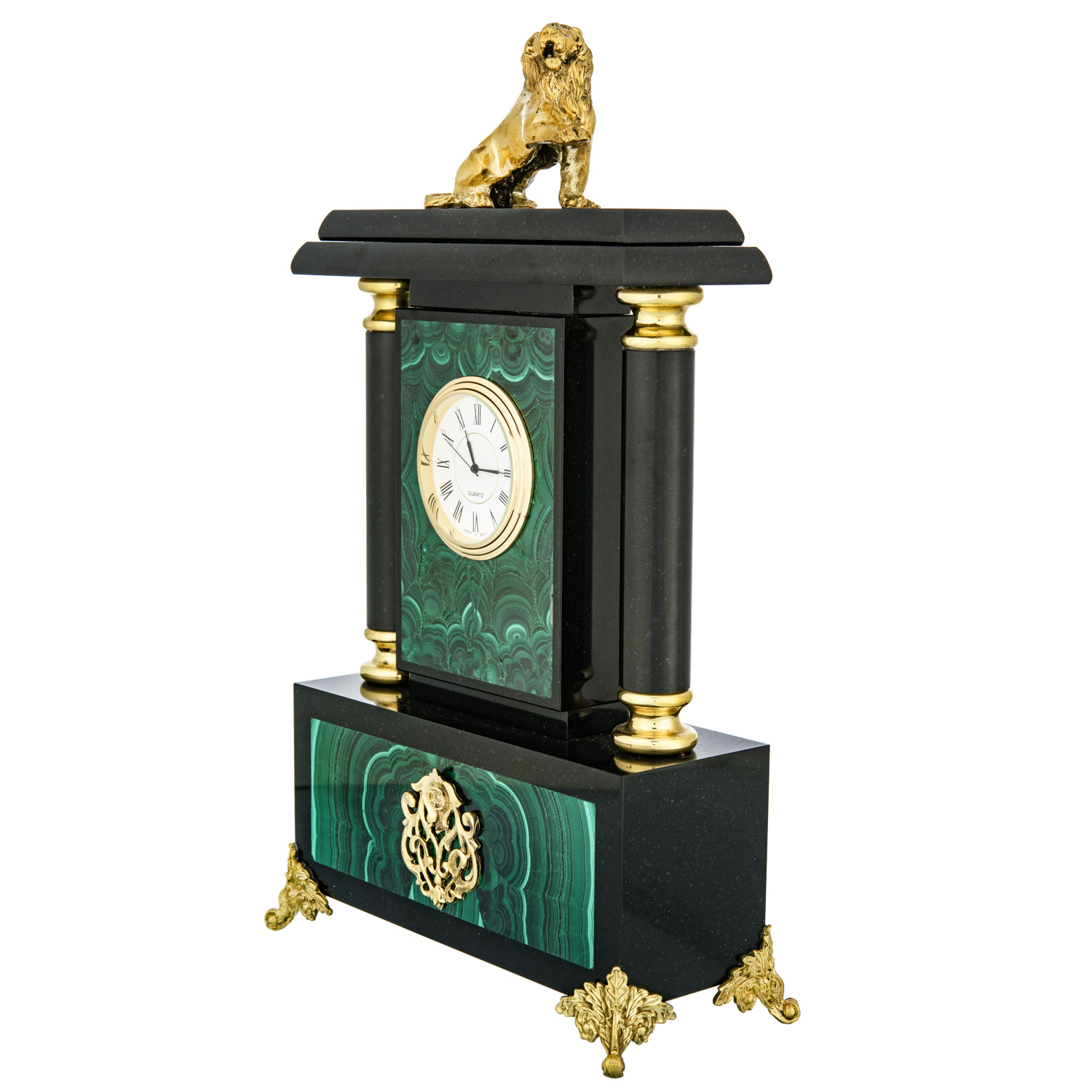 Часы из натурального камня "Лев".Материалы: малахит, долерит, бронза, позолота.