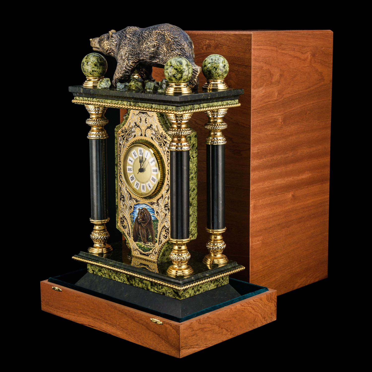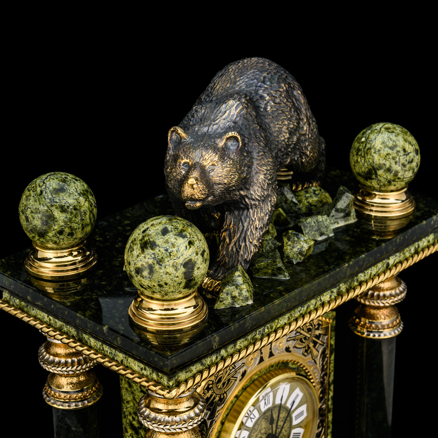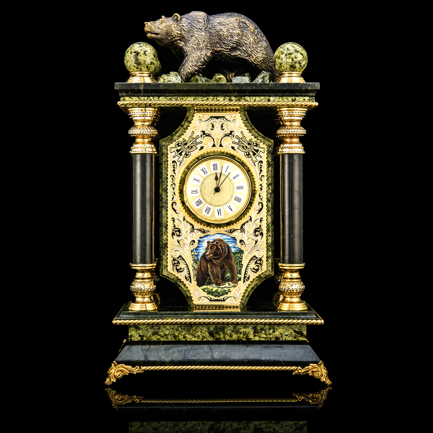 Часы каминные "Медведь". Златоуст.Материалы: змеевик, бронза, латунь, никель, золото 999,9*, эмаль.
