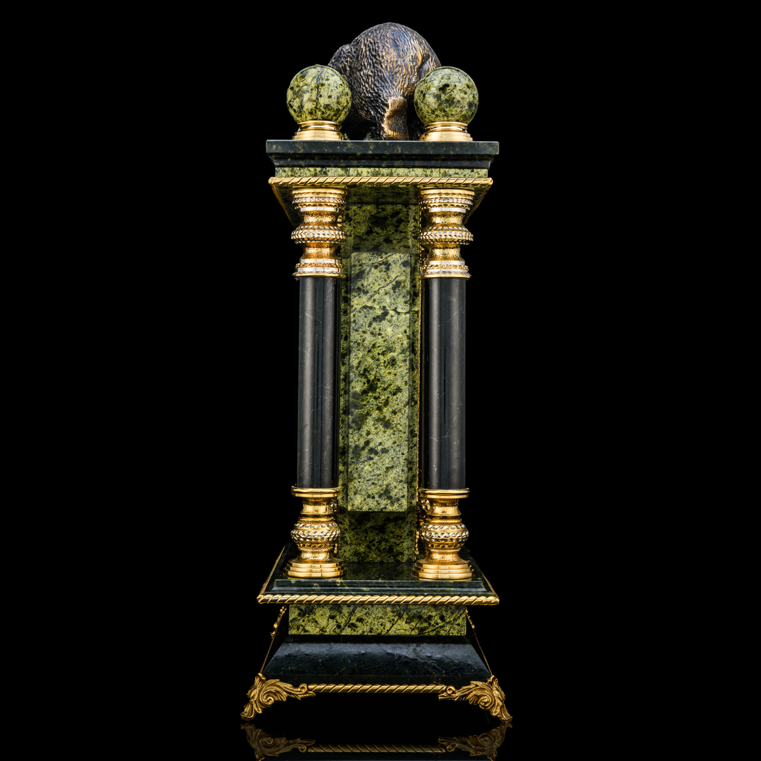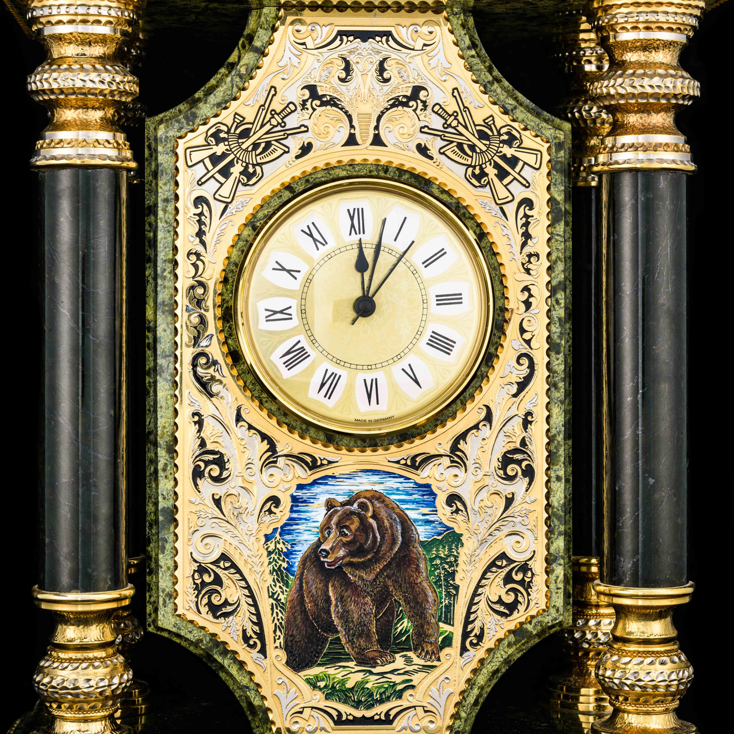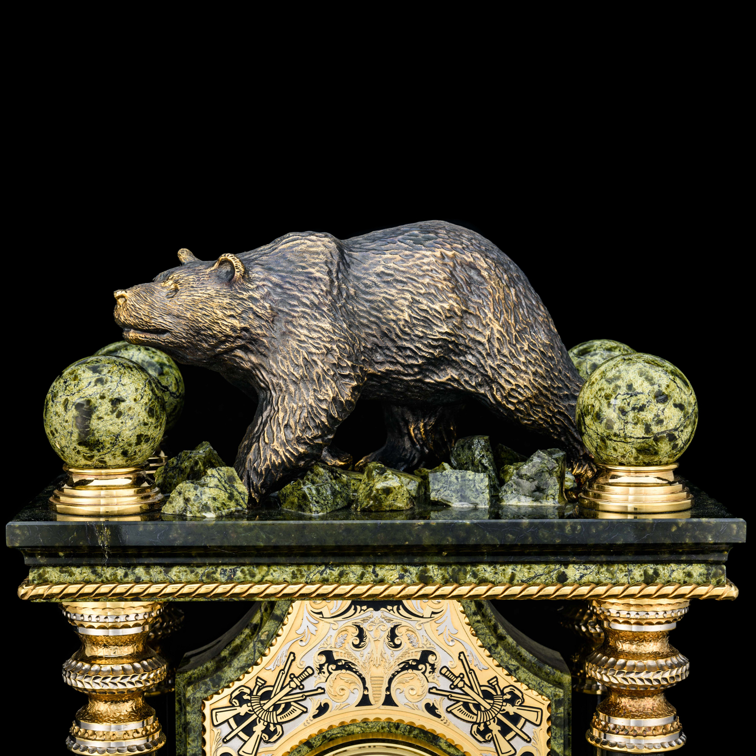 Часы каминные "Медведь". Златоуст.Материалы: змеевик, бронза, латунь, никель, золото 999,9*, эмаль.