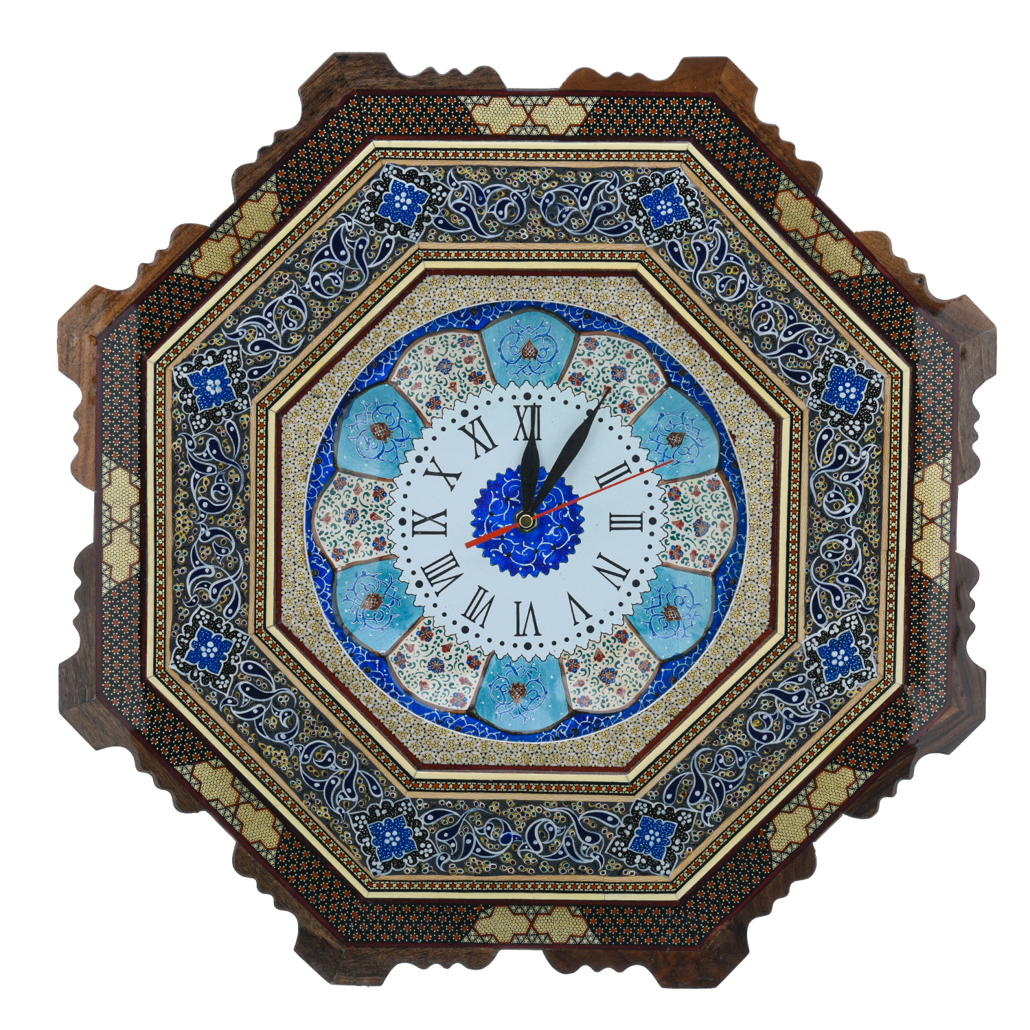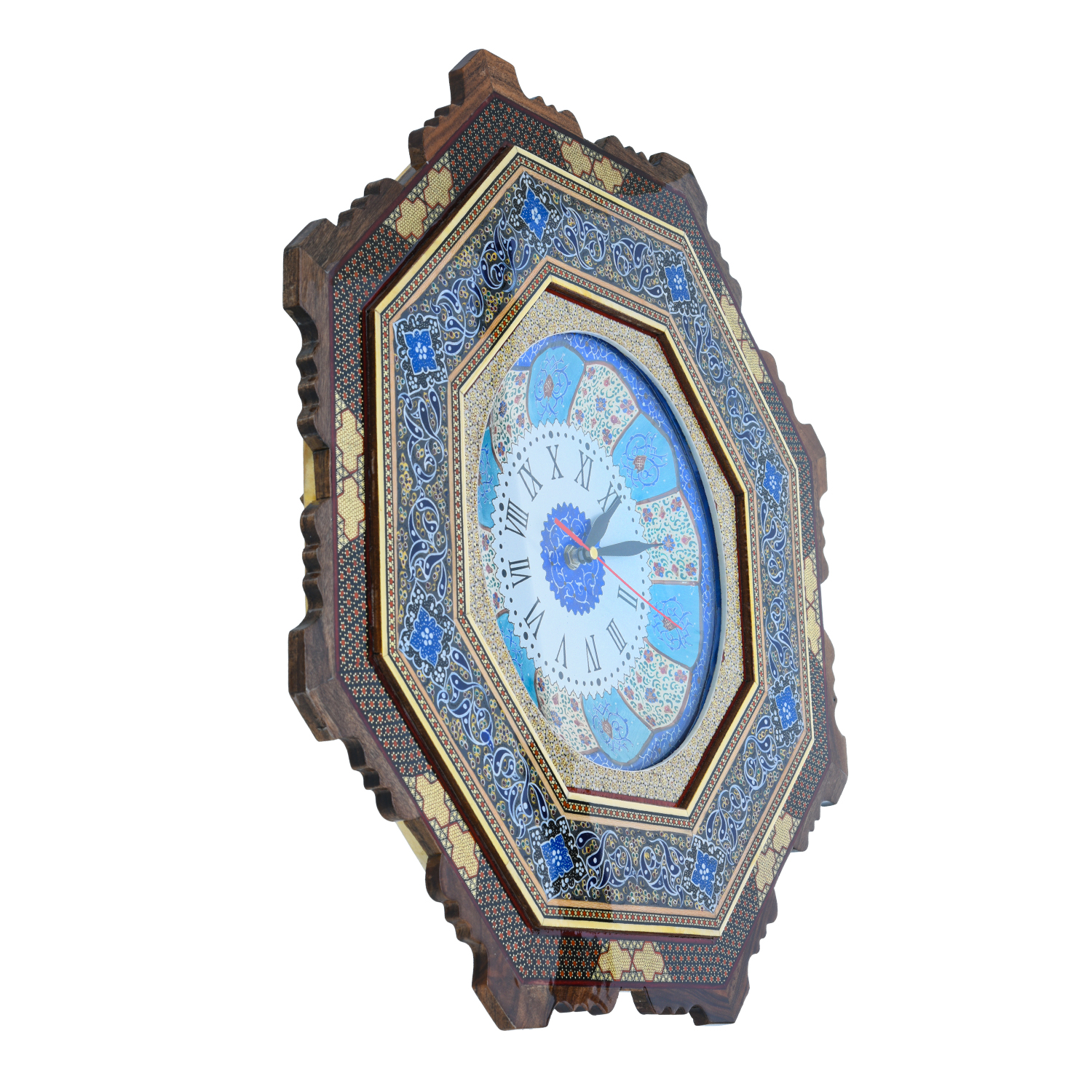 Эти часы — не просто инструмент измерения времени, а арт-объект, в котором слились математическая гармония восьмигранника и многовековое наследие персидского искусства. Каждая грань восьмиугольника, отсылающего к сакральной геометрии исламских орнаментов, украшена Хатам Кари — сложной инкрустацией из благородного дерева, латуни и кости, образующей звёздчатые узоры.