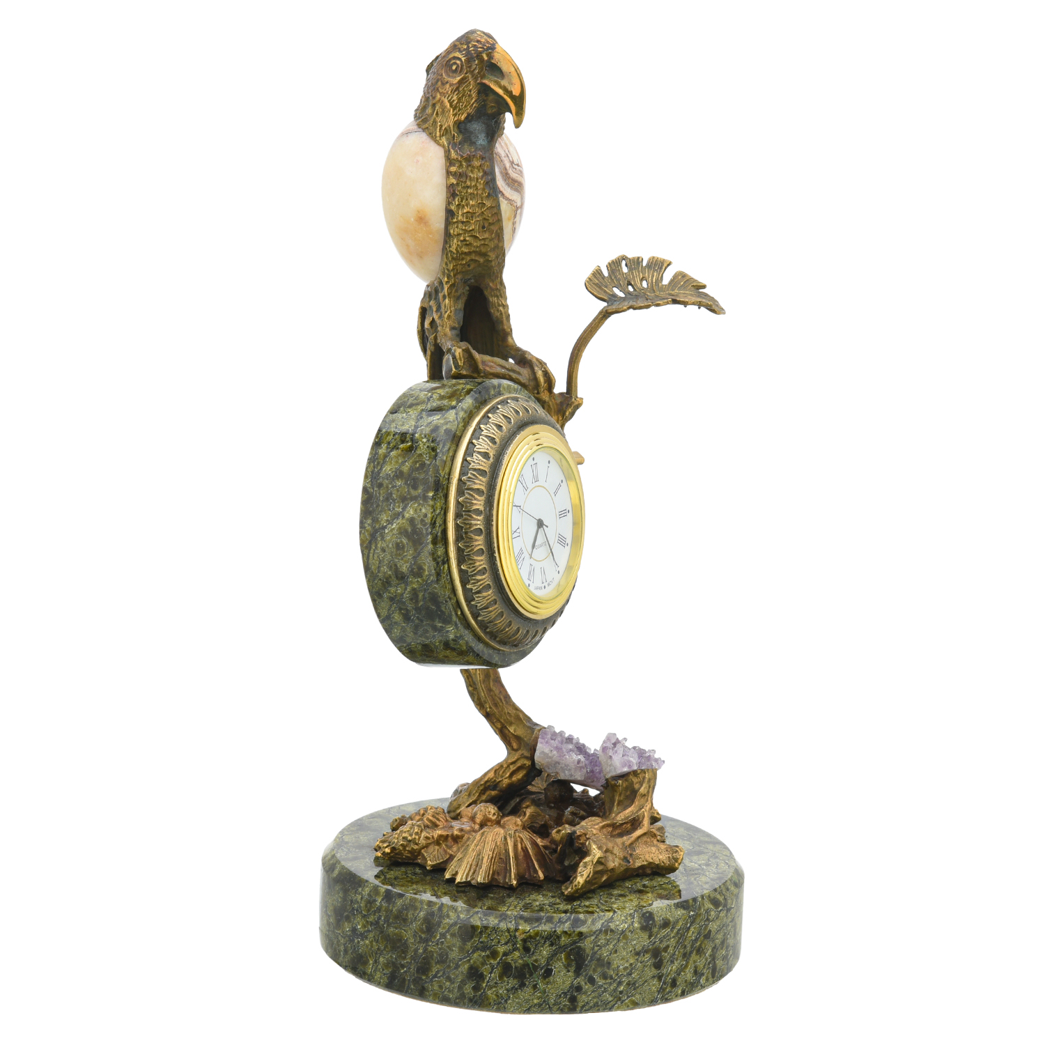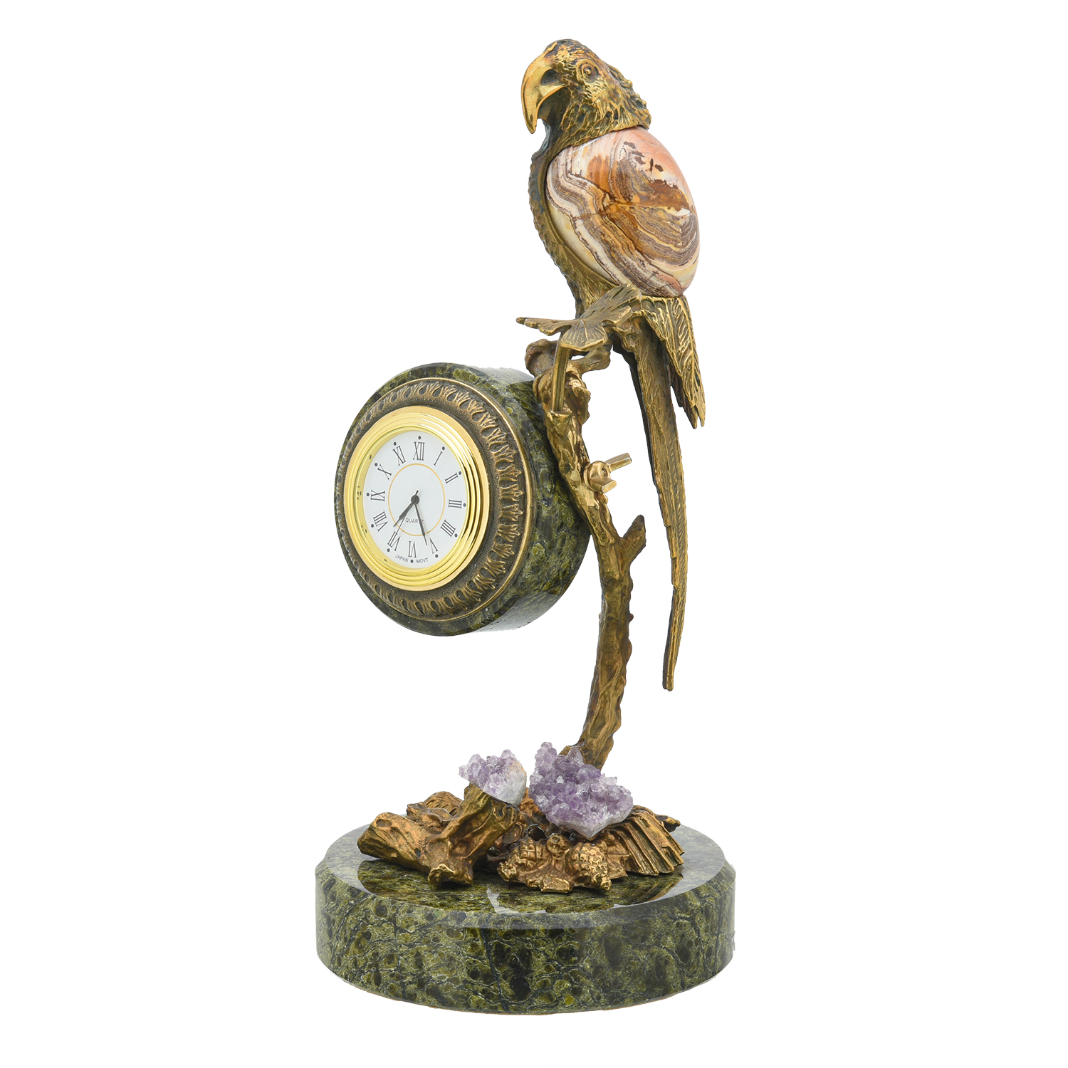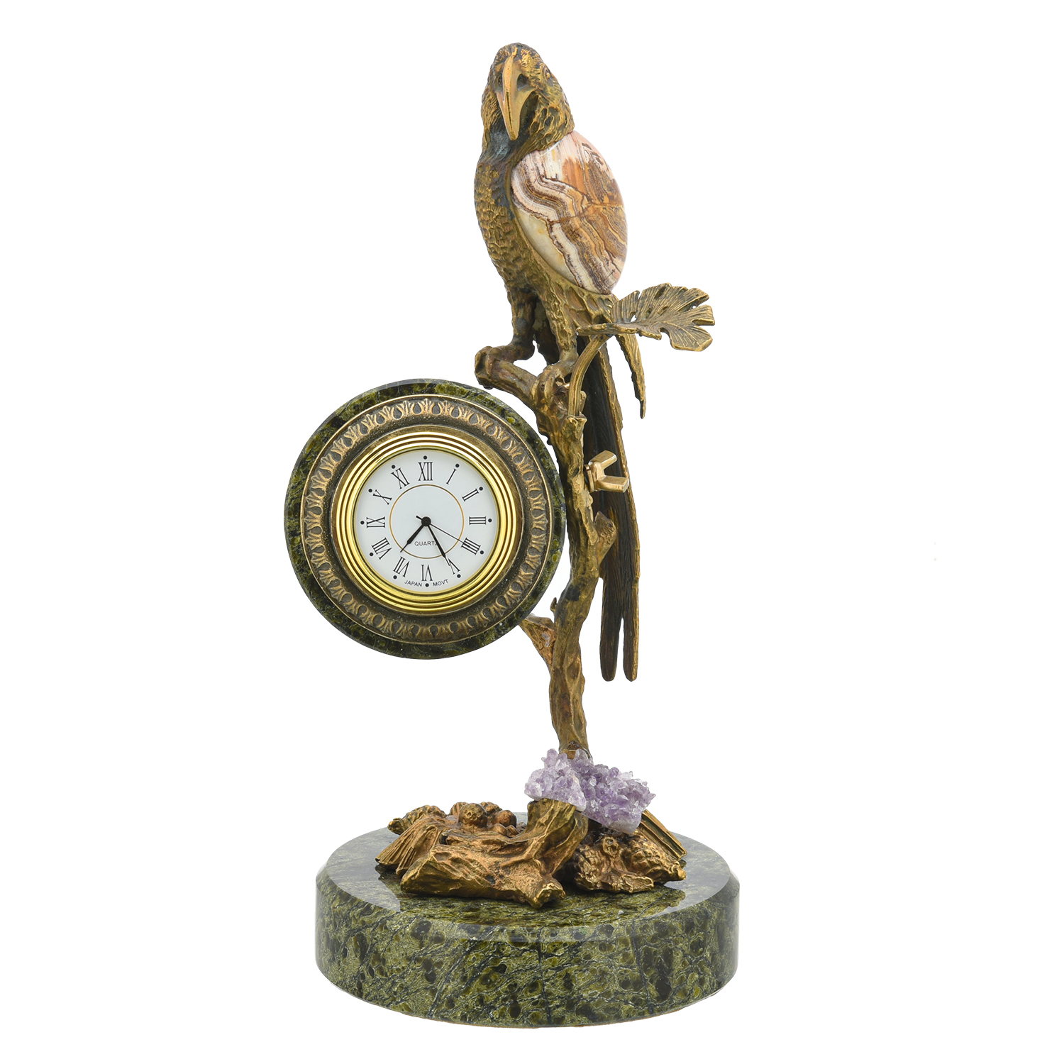 Часы настольные из камня "Попугай".Материалы: змеевик, яшма, горный хрусталь, бронза.